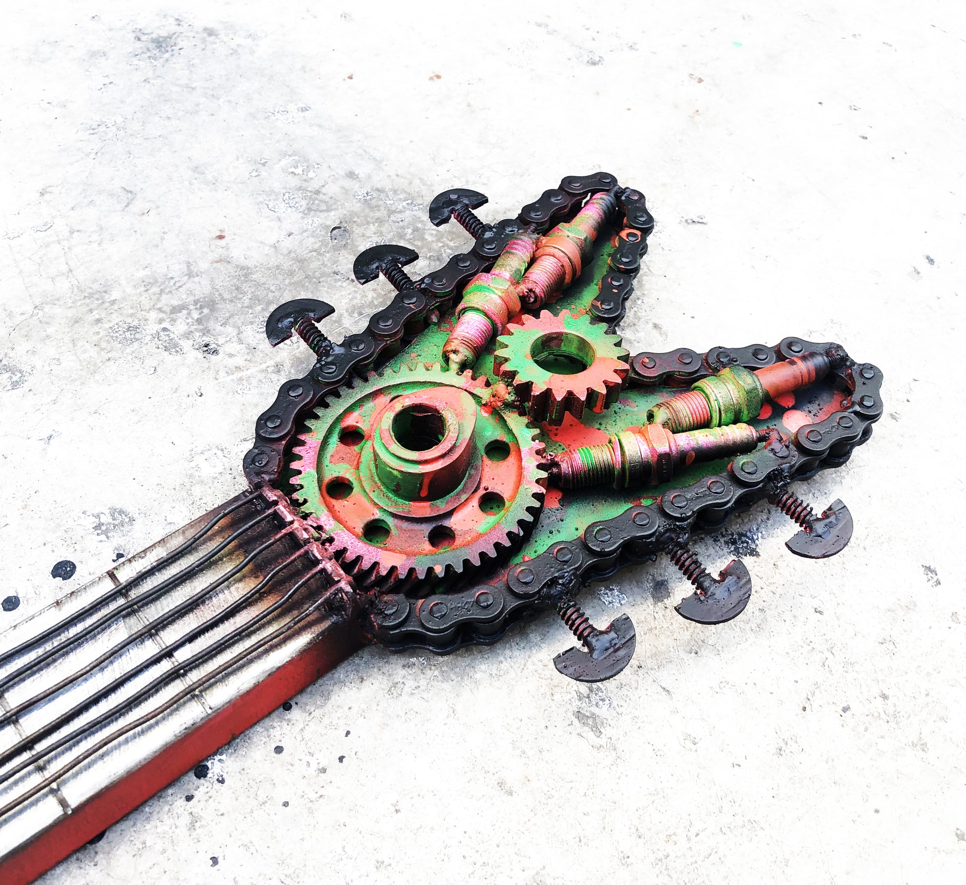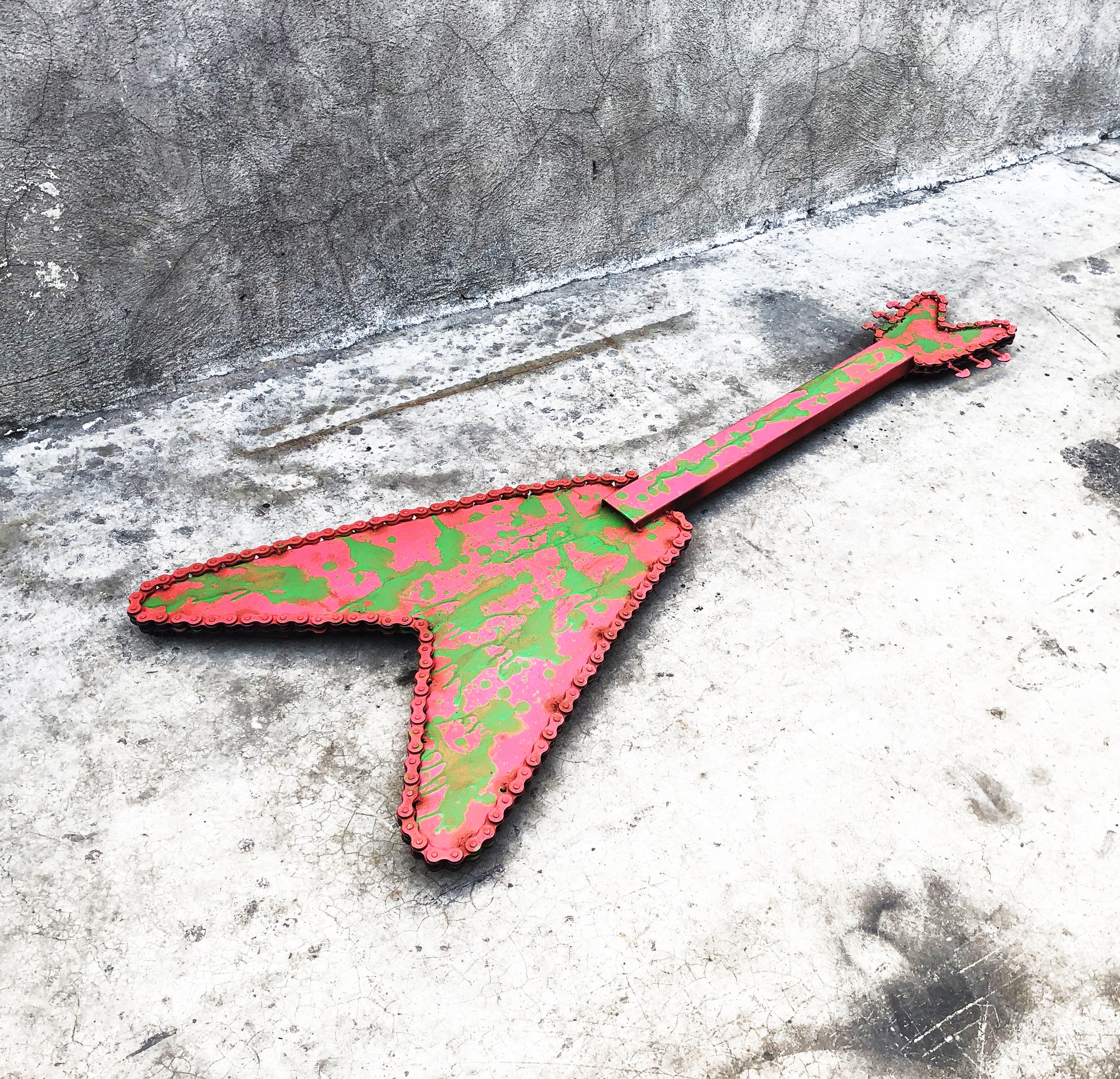 Guitarra tamaño real totalmente fabricada con partes de moto recicladas, sus colores rosa y verde neón hacen homenaje a los tiempos del Glam Metal y los club bikers de Los Ángeles, CA.