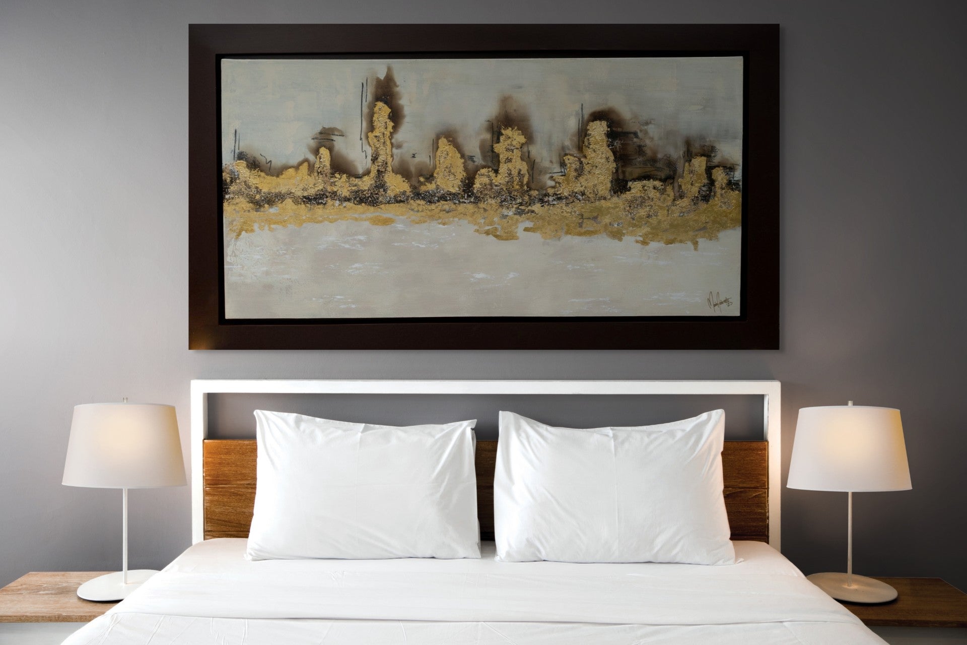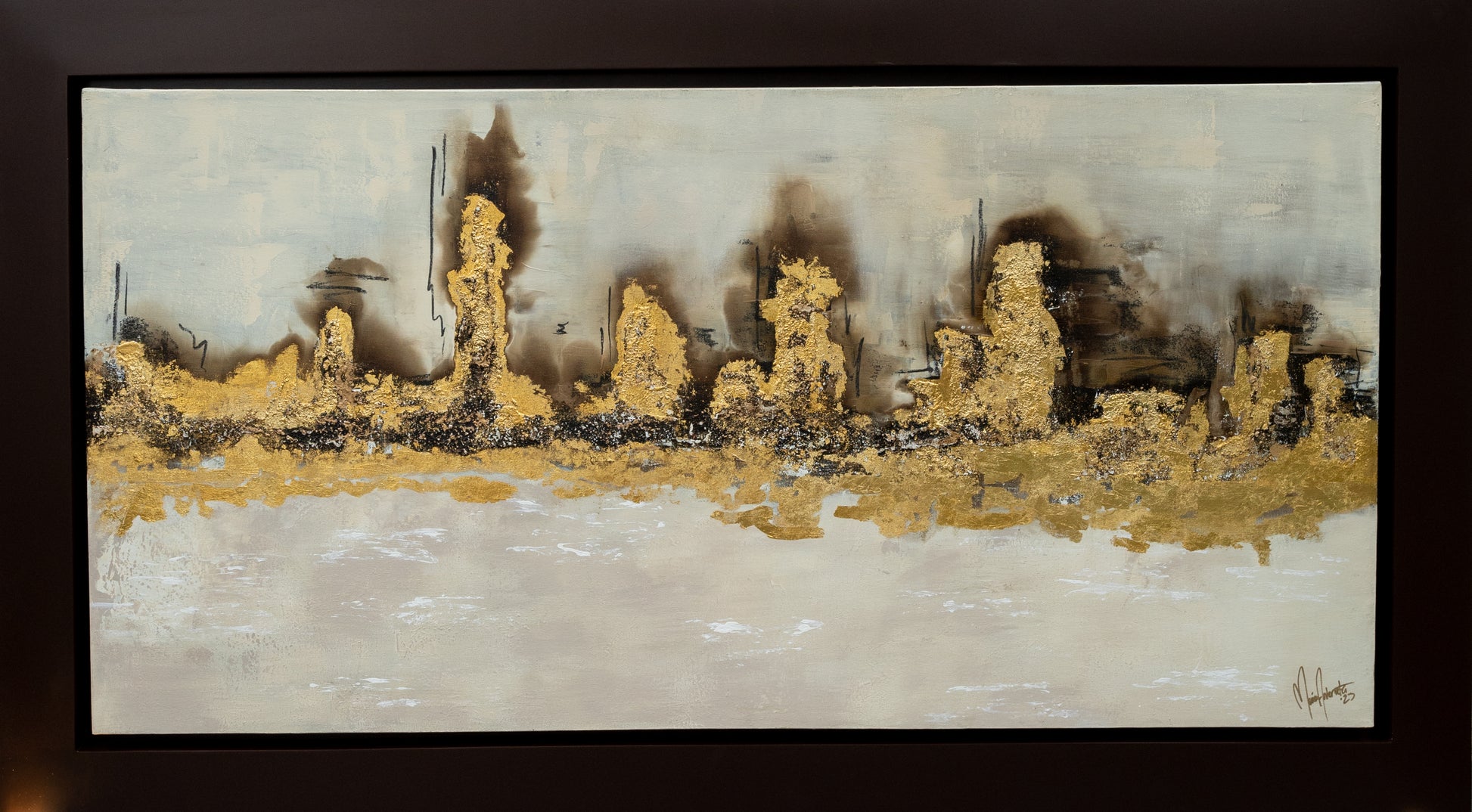 La obra tiene un enfoque claramente abstracto, utilizando tonos dorados y oscuros que se entremezclan para crear una textura rica y un paisaje evocador. La línea dorada que se extiende a lo largo de la parte media de la composición sugiere una especie de horizonte o una cordillera de formas abstractas que emergen de una base clara, casi nebulosa. El uso del dorado brillante en contraste con los tonos oscuros y ahumados en la parte superior crea una sensación de calidez y riqueza, mientras que el fondo claro en la parte inferior aporta equilibrio y serenidad.