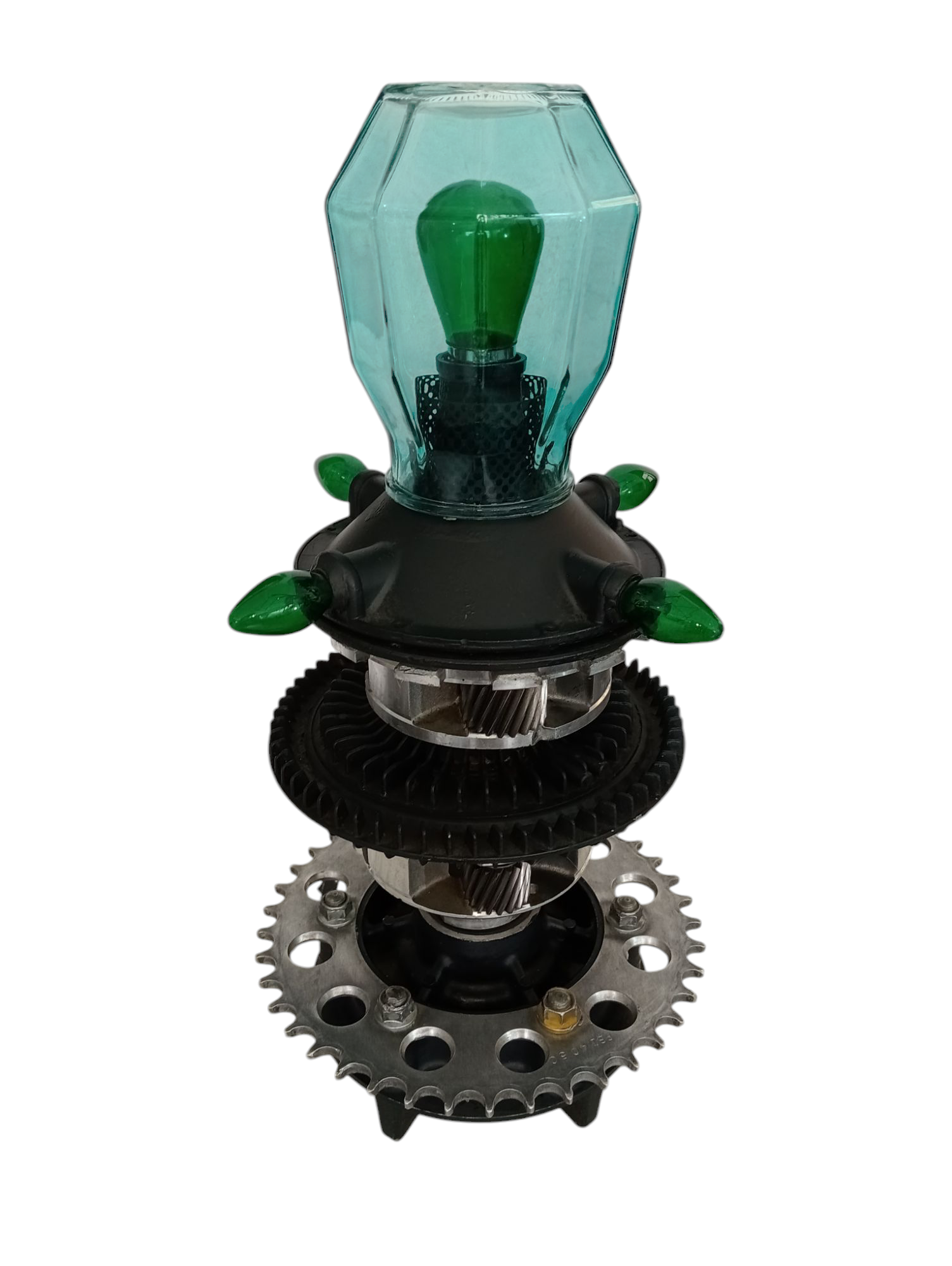 Obra realizada con material reciclado: sprocket de motocicleta, engranajes helicoidales mecánicos y regulador de gas. Obra intervenida por el artista de una forma creativa al realizar una lampara escultura, dándole vida y uso a nuestros desechos materiales. Ademas de promover la creatividad y la reutilización como una forma de expresión consciente y comprometida con el medioambiente.♻