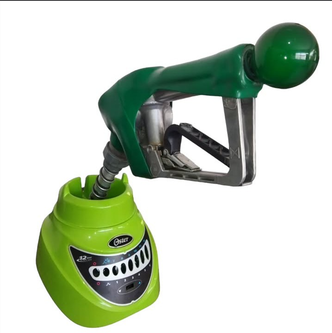 Obra realizada con material reciclado, base de licuadora marca Oster y pistola automática para gasolina magna marca OPW, intervenida por el artista creando una creativa lampara escultura, dándole vida y uso a nuestros desechos materiales. Ademas de promover la creatividad y la reutilización como una forma de expresión consciente y comprometida con el medioambiente.♻