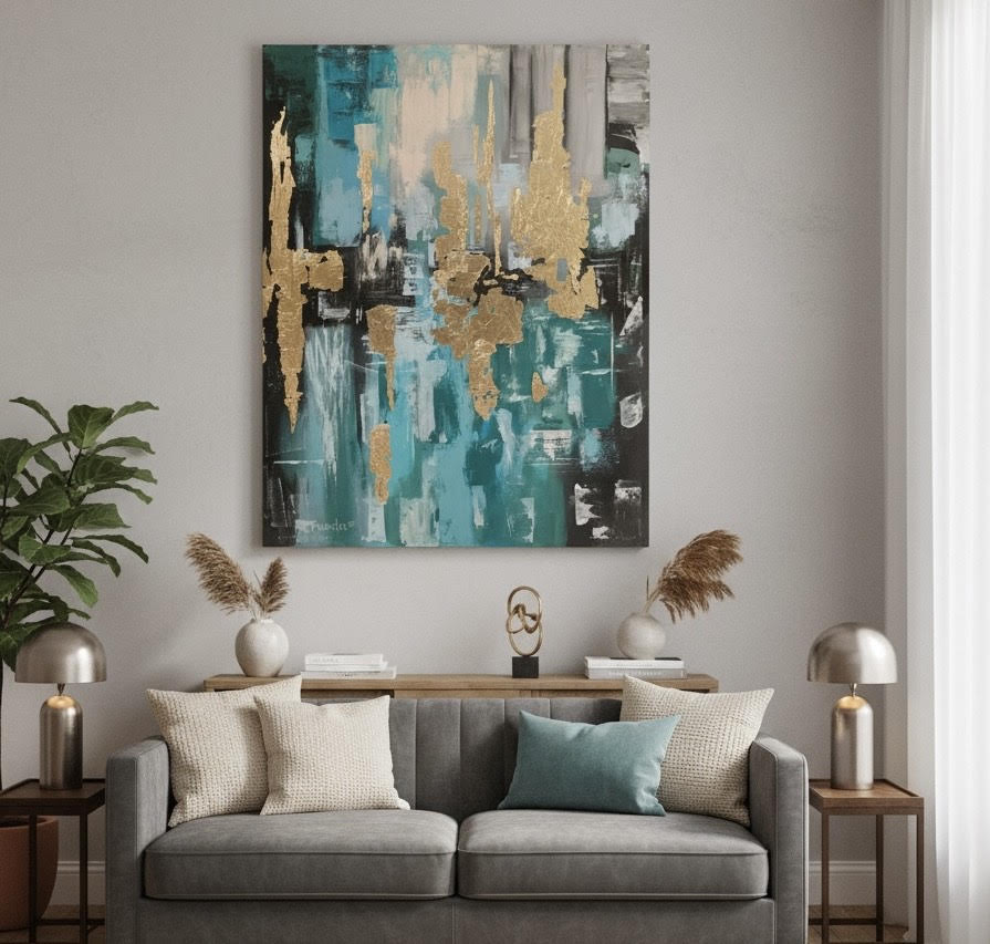 Pintura abstracta, con toques de hoja de oro, varios tonos de verdes y azules.
