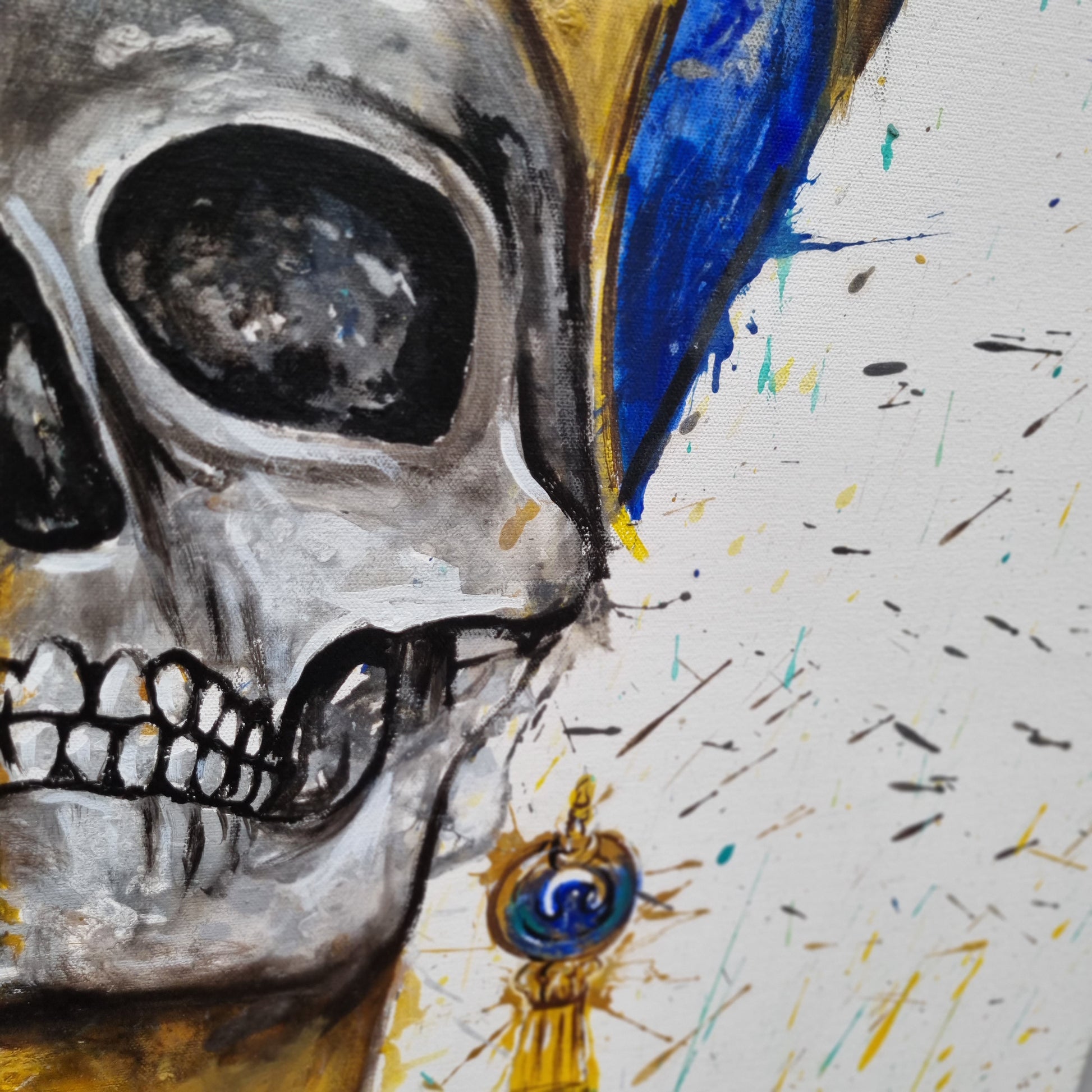 La mitad de su rostro simboliza la belleza, intacta por el tiempo; la otra, una calavera elegante es simbolo de la eternidad y la transformación.