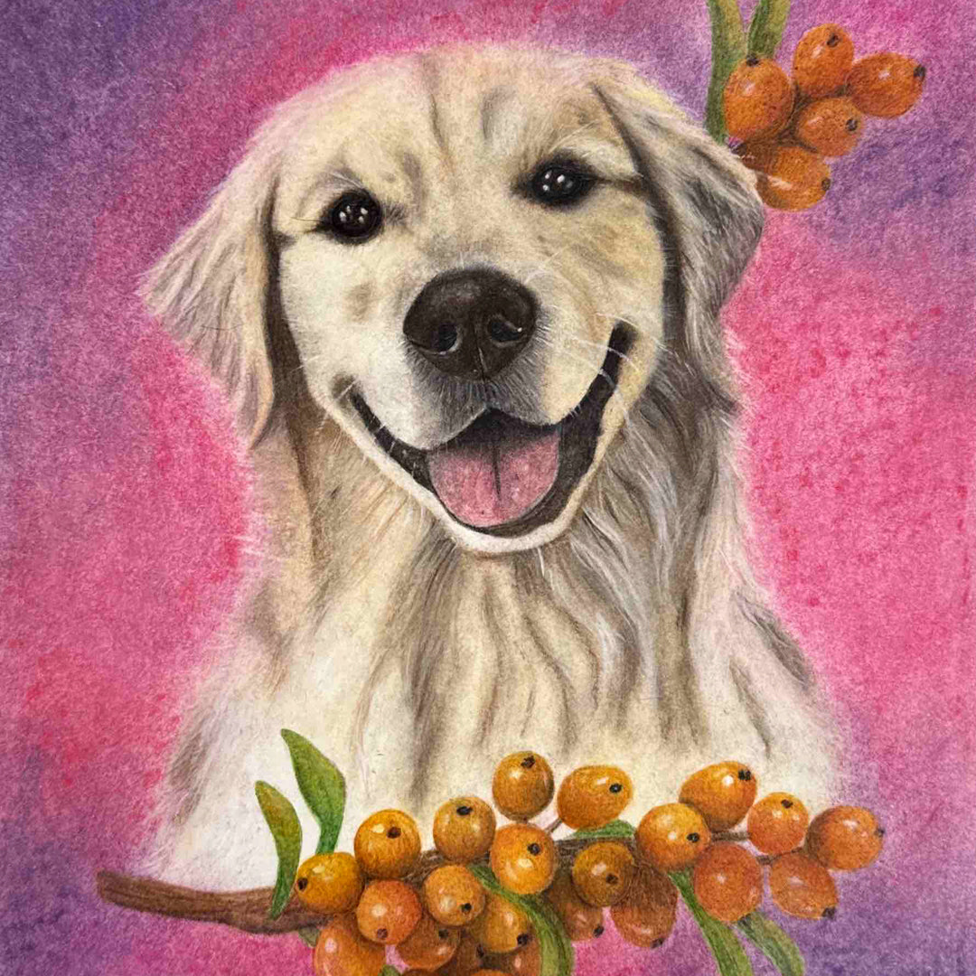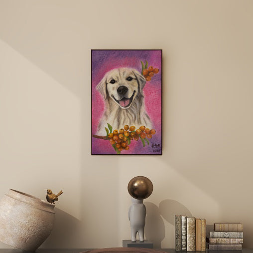 Bajo una luz suave que acaricia cada forma, un perrito sonríe entre frutas como si el mundo fuera un festín eterno. Su sonrisa tranquila y su postura relajada hablan de una dicha sin preocupaciones. Las frutas no solo aportan color, sino también una sensación de abundancia y vida. La obra captura un instante suspendido en el tiempo, donde la inocencia del animal y la generosidad de la naturaleza conviven en armonía. Es una invitación a saborear la dulzura del momento presente.