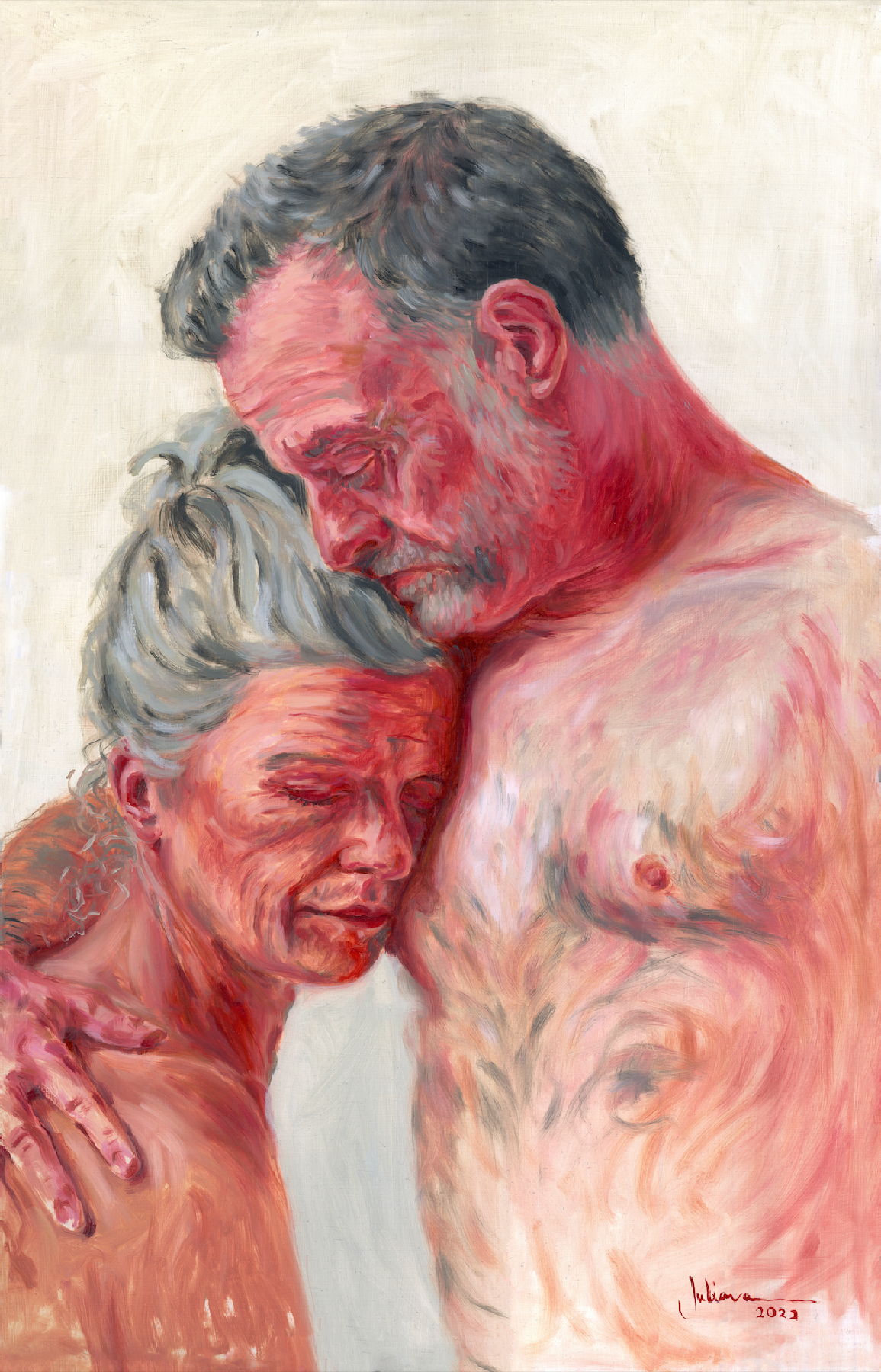 Esta obra forma parte de la serie Interiores. En ella observé que las figuras femeninas eran retratadas de manera muy estilizada, con cuerpos tensos y posturas poco naturales. Por ello, busqué imágenes de mujeres desnudas que transmitieran emociones reales, con las cuales pudiera sentirme identificada y conectada. Quería capturar cuerpos que mostraran el paso del tiempo, los pliegues y esas "imperfecciones" que se nos pide ocultar. En esta serie capturo la esencia de la intimidad y la vulnerabilidad. Cada pincelada se convierte en un medio para explorar las texturas de la piel, revelando la riqueza y complejidad de la experiencia humana.