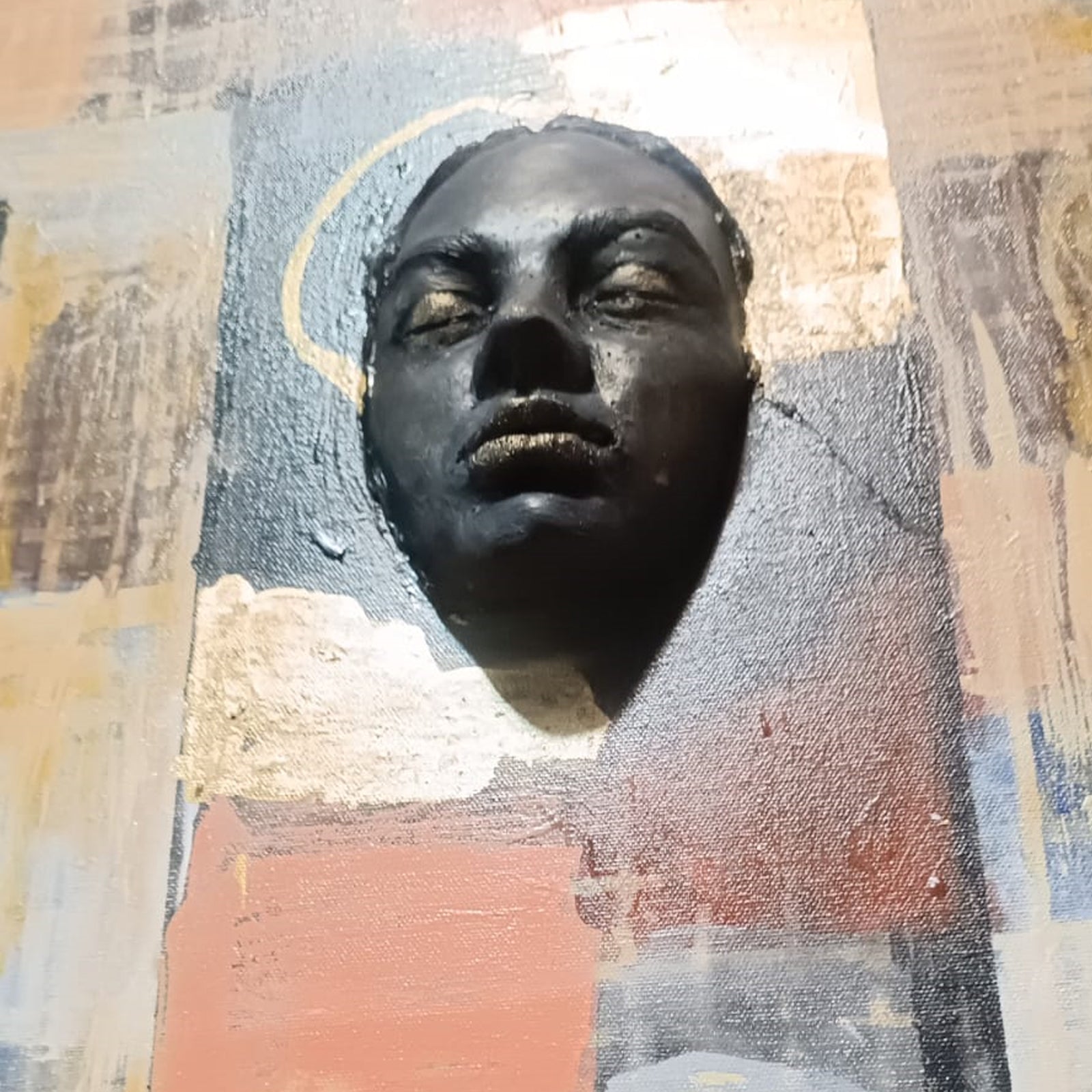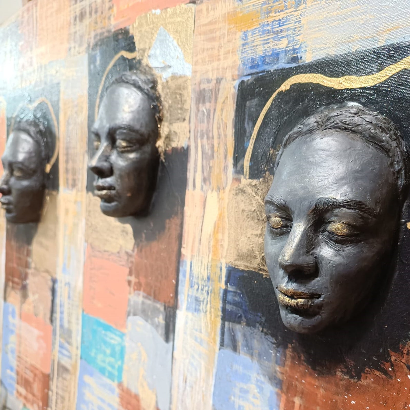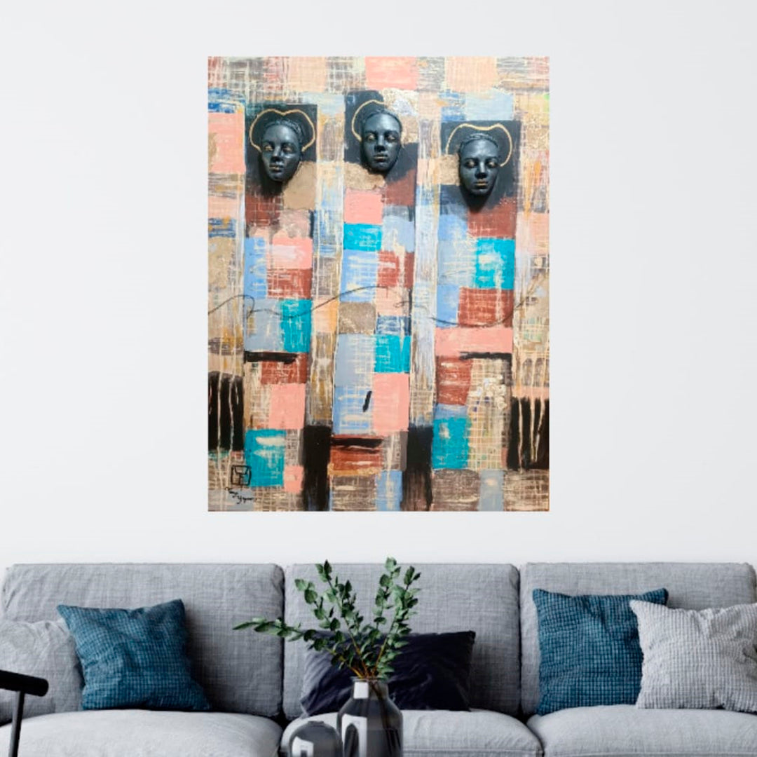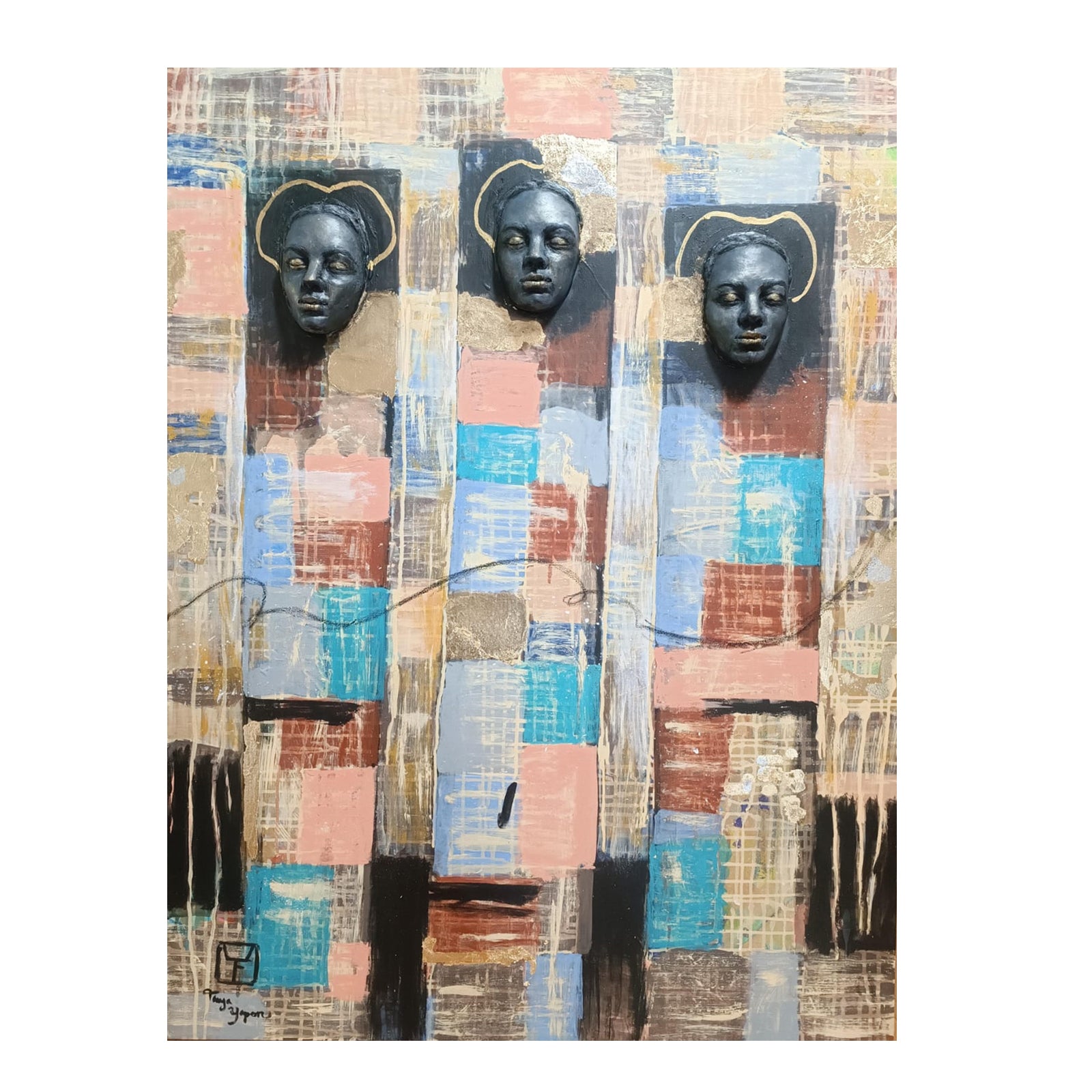 Esta obra representa la conexión y el apoyo mutuo entre tres figuras femeninas. Cada rostro emerge de cuerpos que evocan pilares, simbolizando fuerza y estabilidad. Las formas están interconectadas, sugiriendo la importancia de la unidad y la sororidad. La composición combina elementos abstractos con rasgos humanos, creando un equilibrio visual entre lo etéreo y lo tangible.