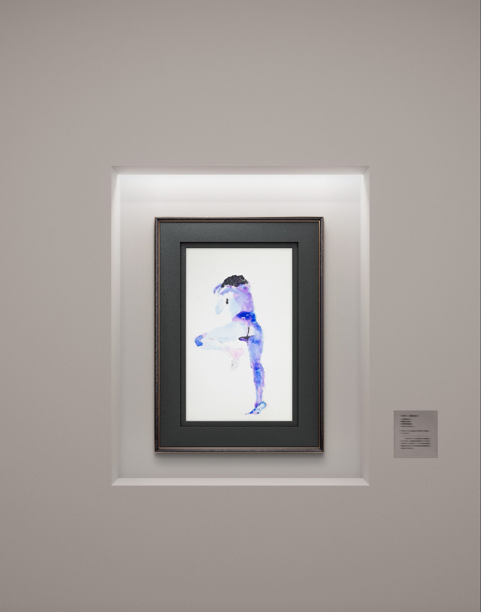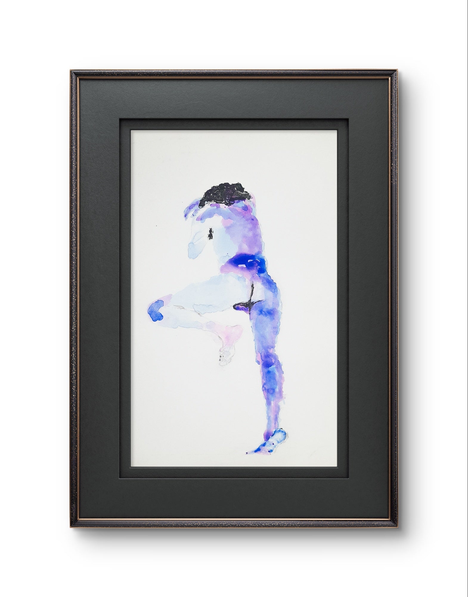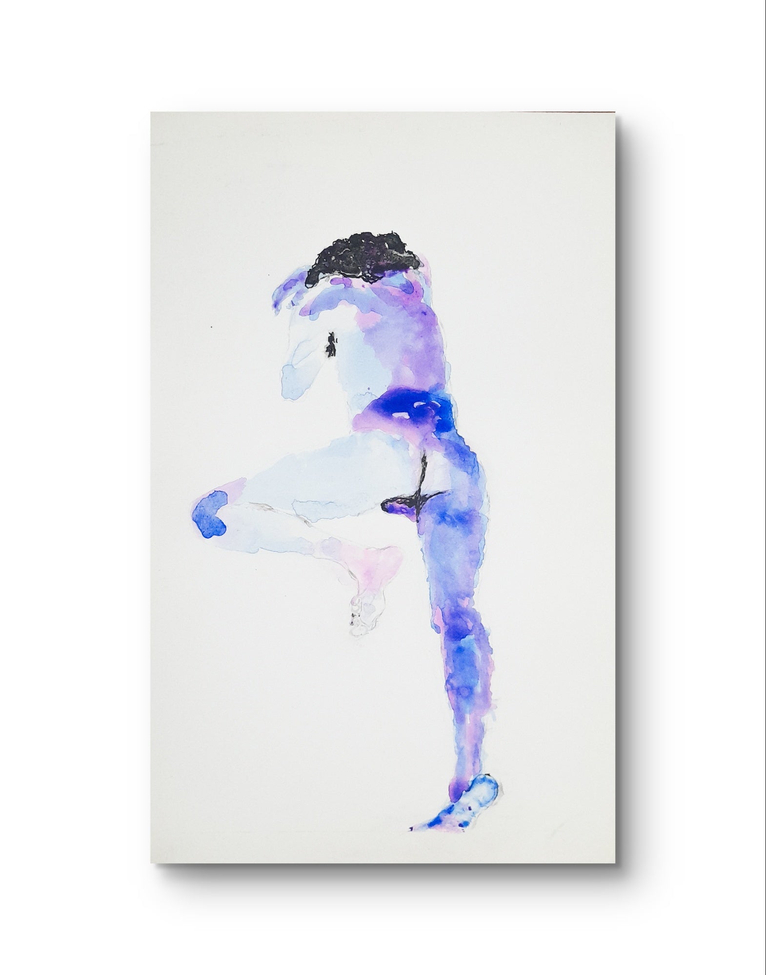 Esta pieza muestra una figura humana realizada con acuarela en tonos azules, violetas y ligeros toques de rosa. La figura aparece en una pose de relajada con una mano cubriendo parte del rostro. La pintura presenta un estilo minimalista, con colores suaves que se difuminan de manera abstracta, creando una sensación de fluidez y movimiento.
