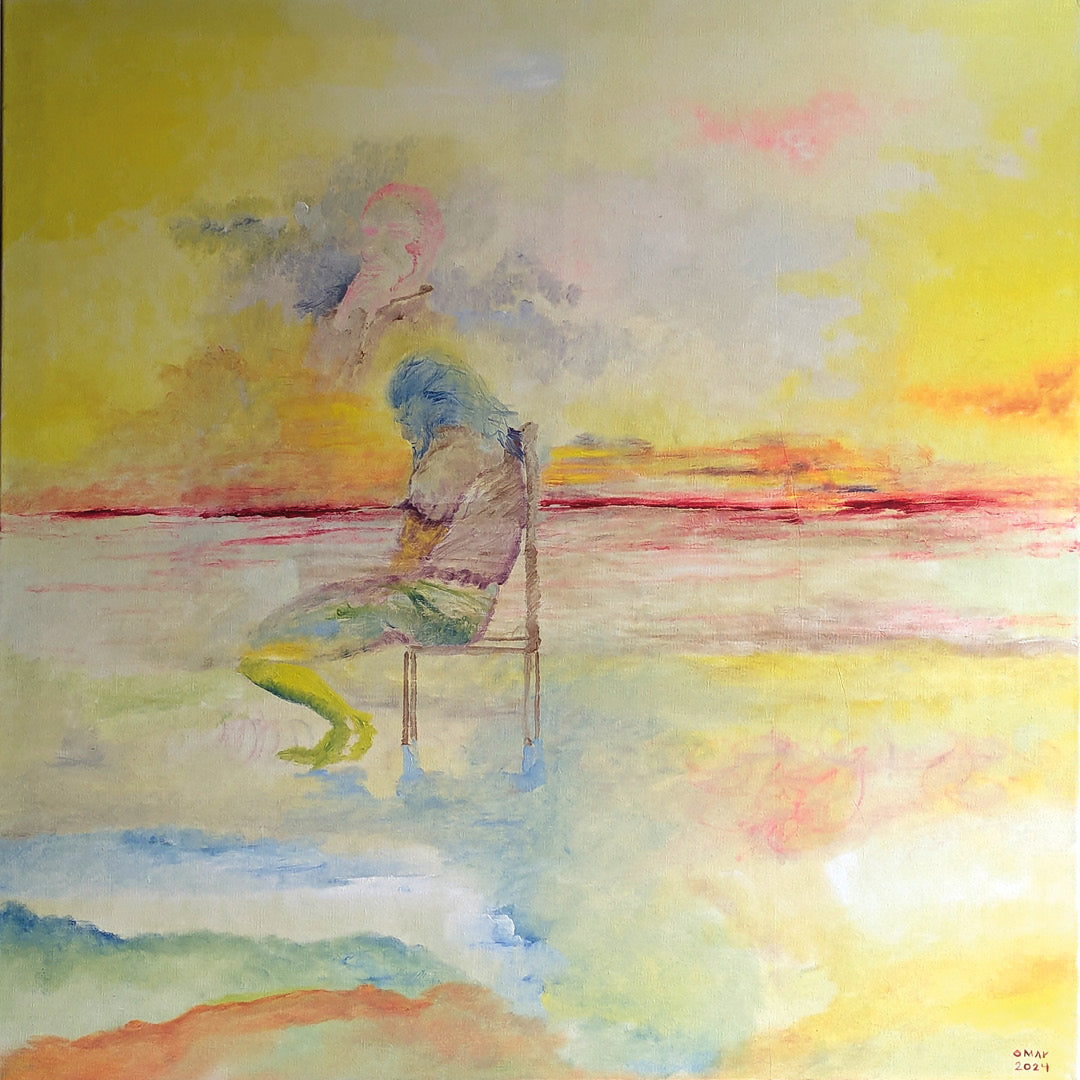 Pintura 2024. Todo es desierto por todas partes. Sólo hay una silla, y un hombre decide descansar en ella. Le viene a la mente un amigo poeta.