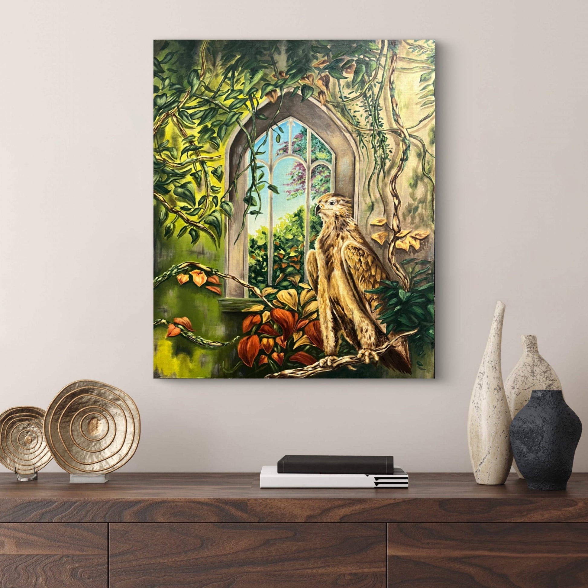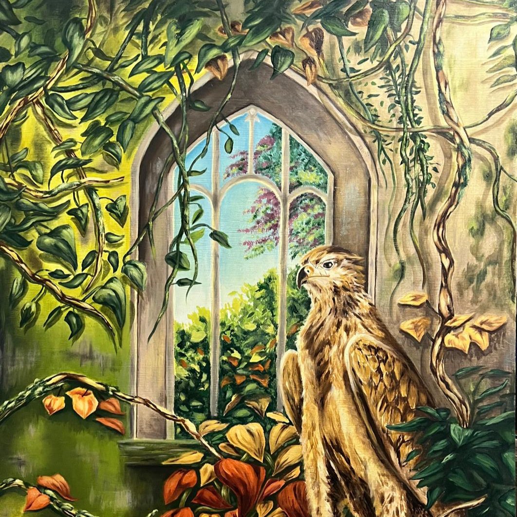 "Hora dorada" mimetiza el descanso después del ascenso, la cúspide del creativo: el empoderamiento que recibe al optimizar su forma de interpretar, resolver y ejecutar una técnica o proyecto es representado por el águila. Por otro lado, el enramado de plantas con colores verdes y naranjas representa las dos temporadas: primavera (cuando se debe florecer) y otoño (cuando se debe menguar), en tanto que, el edificio con el ventanal entraña la estructura sólida del aprendizaje.