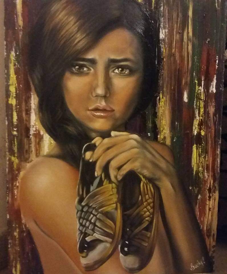Rostro de joven mujer sosteniendo un par de huaraches