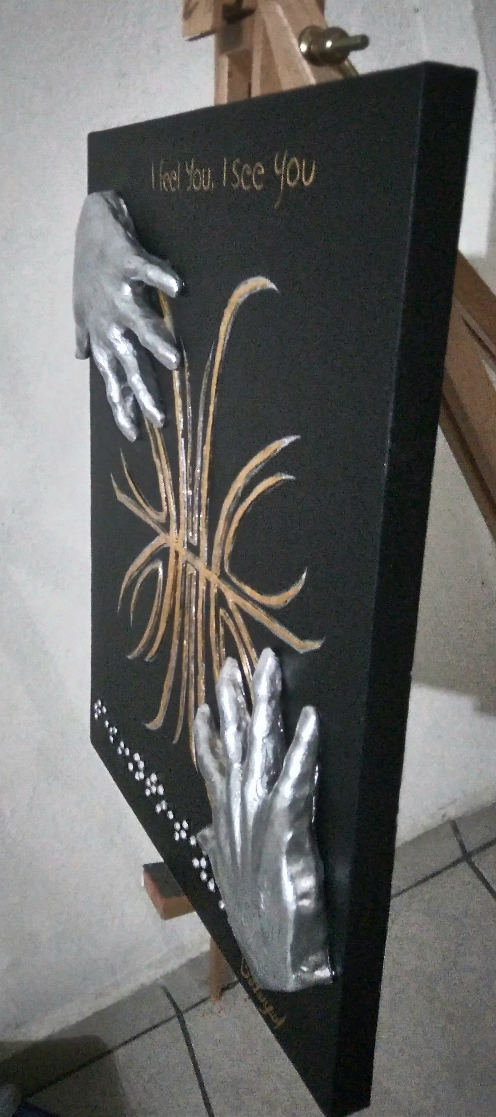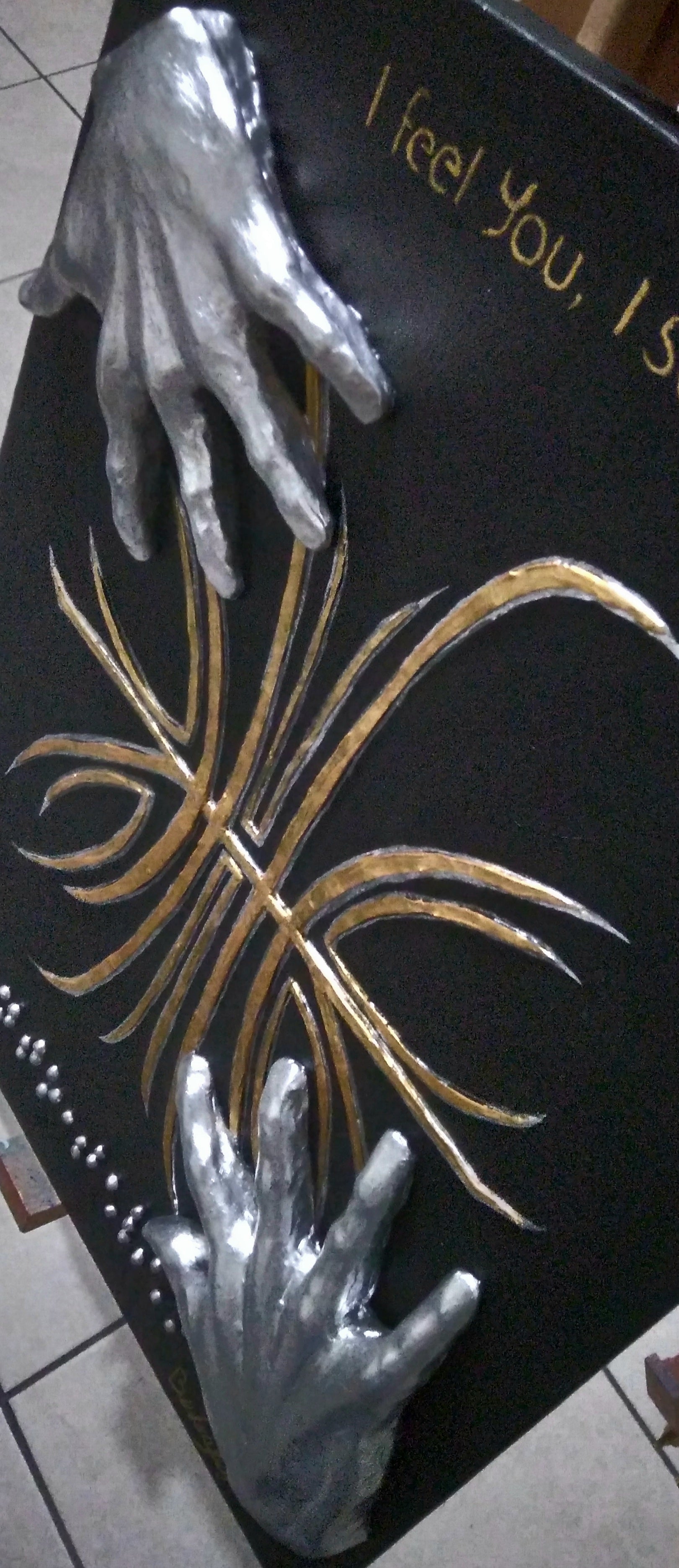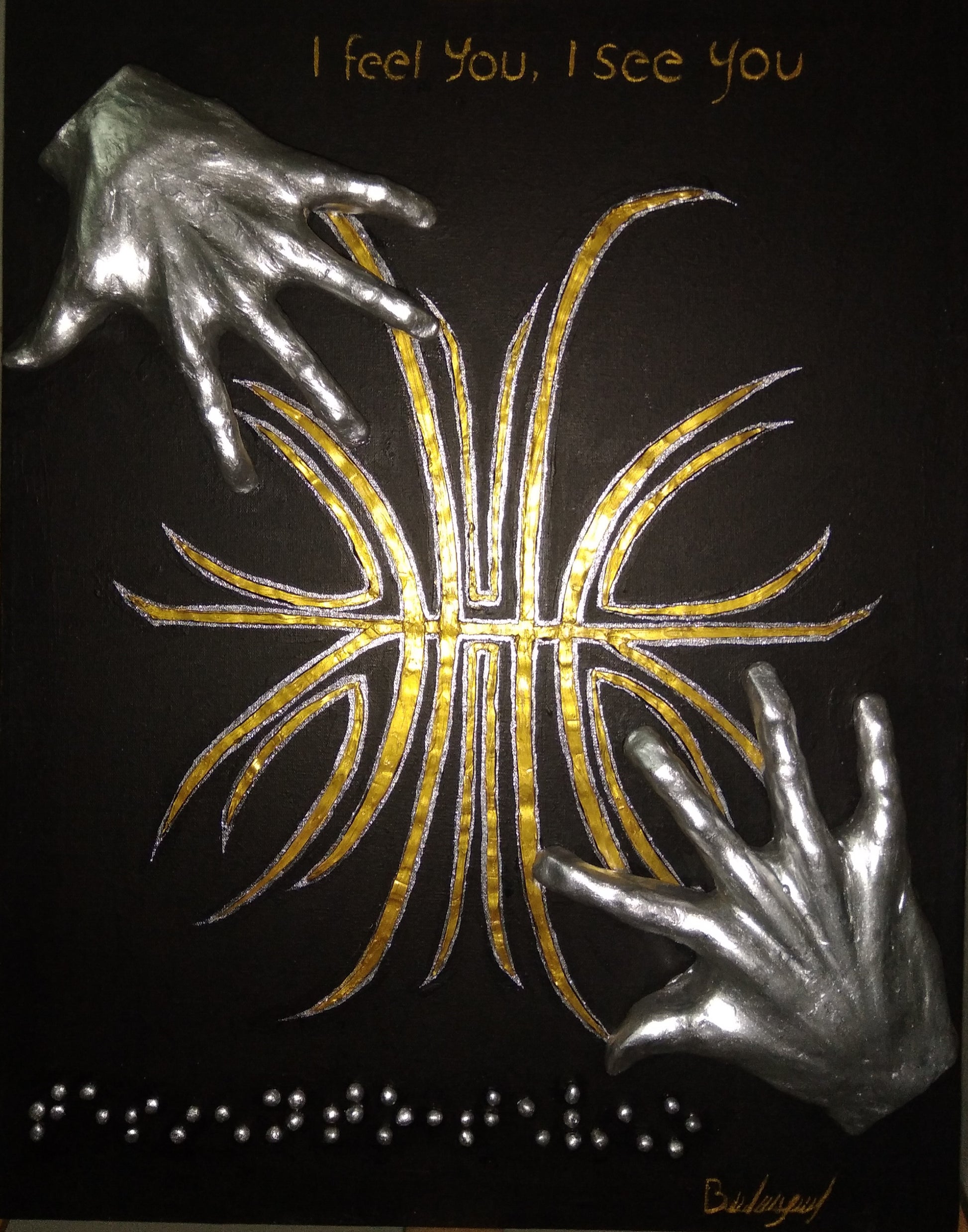 ¿Quién puede expresar el sentido del tacto de la mejor manera? esta Obra esta inspirada en los ciegos, pues aunque ellos no ven como nosotros, pero si con su sentido del tacto , las manos son el mayor representante del sentido del tacto , por ello esta titulado en braille.
