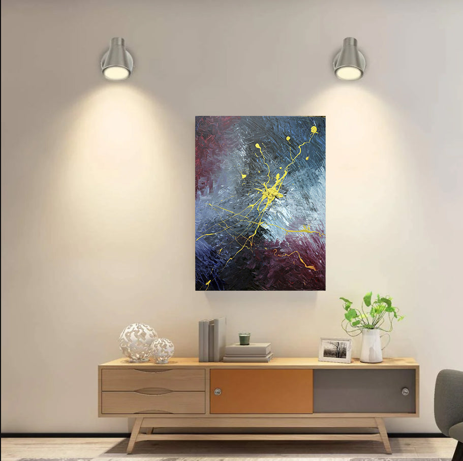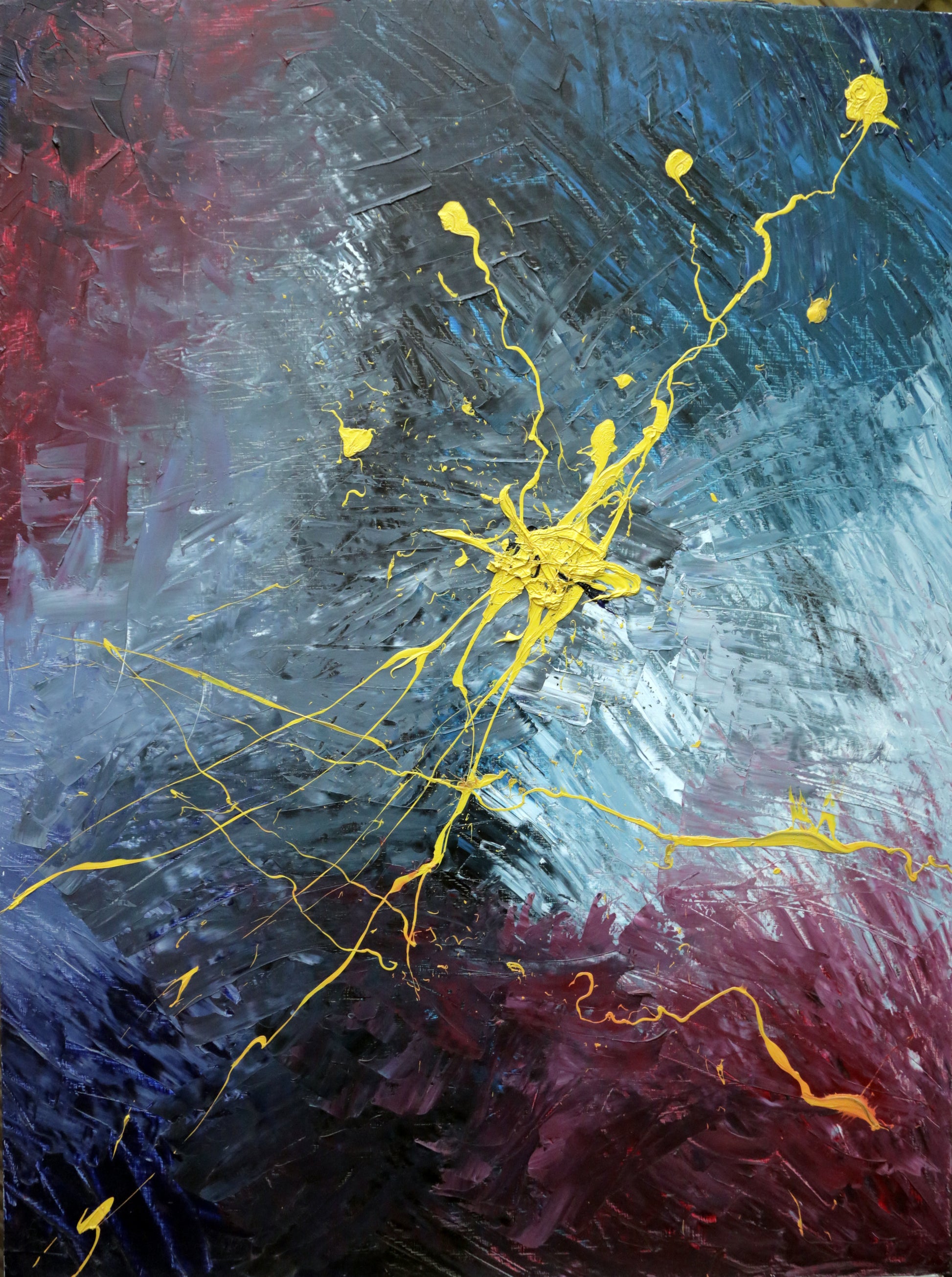 En "Ictus", el artista utiliza una paleta de colores contrastantes que se fusionan y se mezclan para crear una atmósfera vibrante y enérgica. Los empastes gruesos y fluidos reflejan los acentos rítmicos y las variaciones de intensidad en la melodía que inspira la obra, generando una sensación de movimiento dinámico. Los trazos ondulantes y las áreas de color difuso evocan la naturaleza cambiante y fluida de una composición musical, creando una experiencia visual inmersiva.