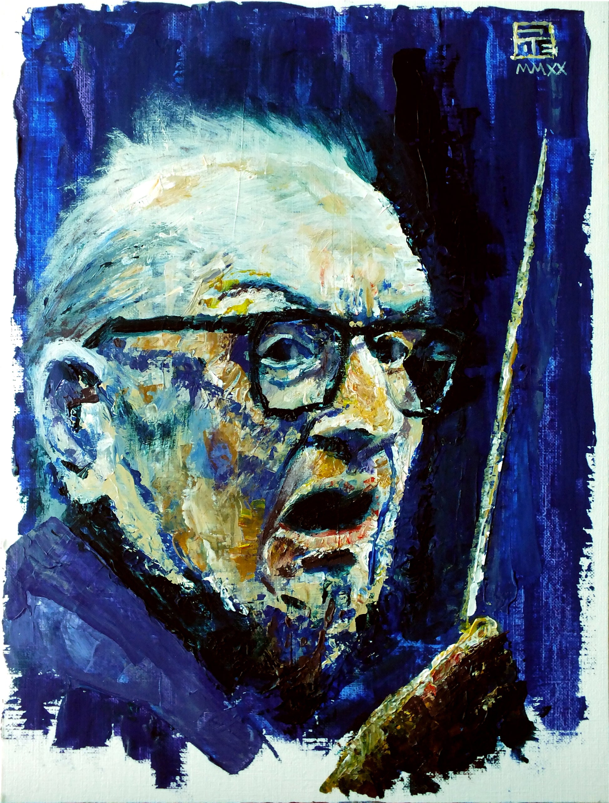 Como admirador de las películas de Sergio Leone, una de las maravillosas consecuencias es que uno se topa con la música de Ennio Morricone, es serendipia pura. Me he basado en una fotografía del director. (La foto lleva el crédito de la agencia AP/Luca Bruno.)