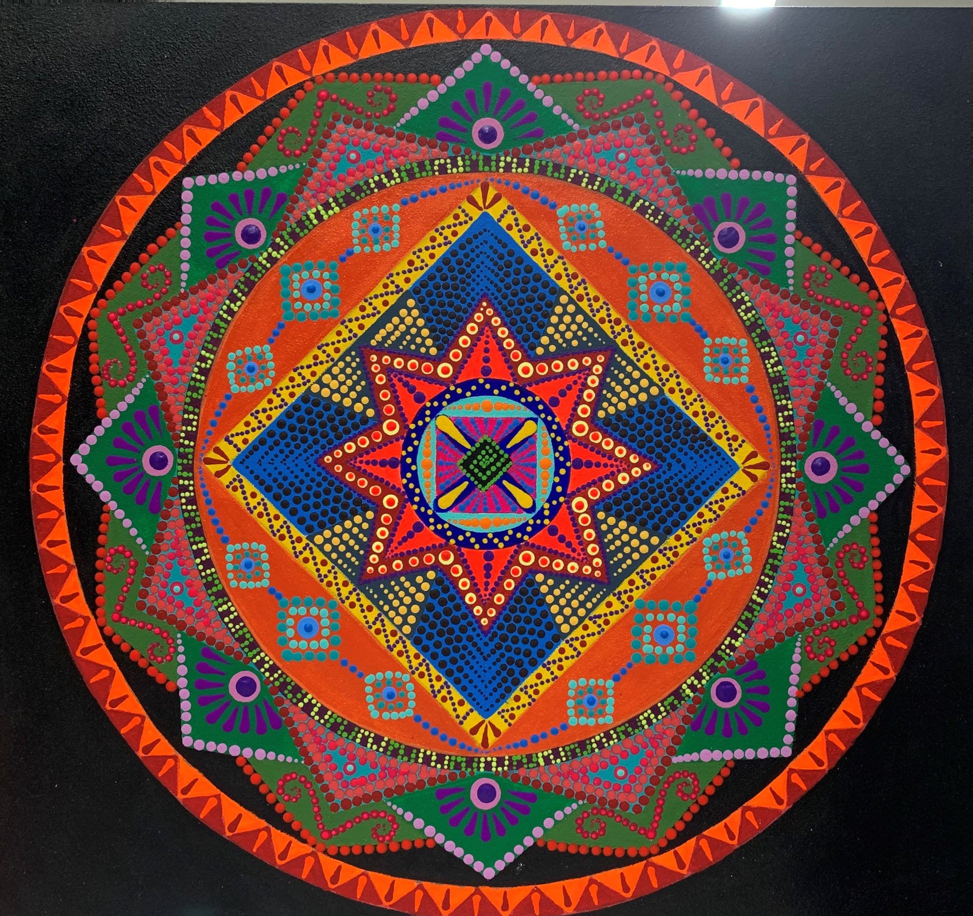 Cuadro mandala pintado con pintura acrílica sobre madera. Técnica Puntillismo