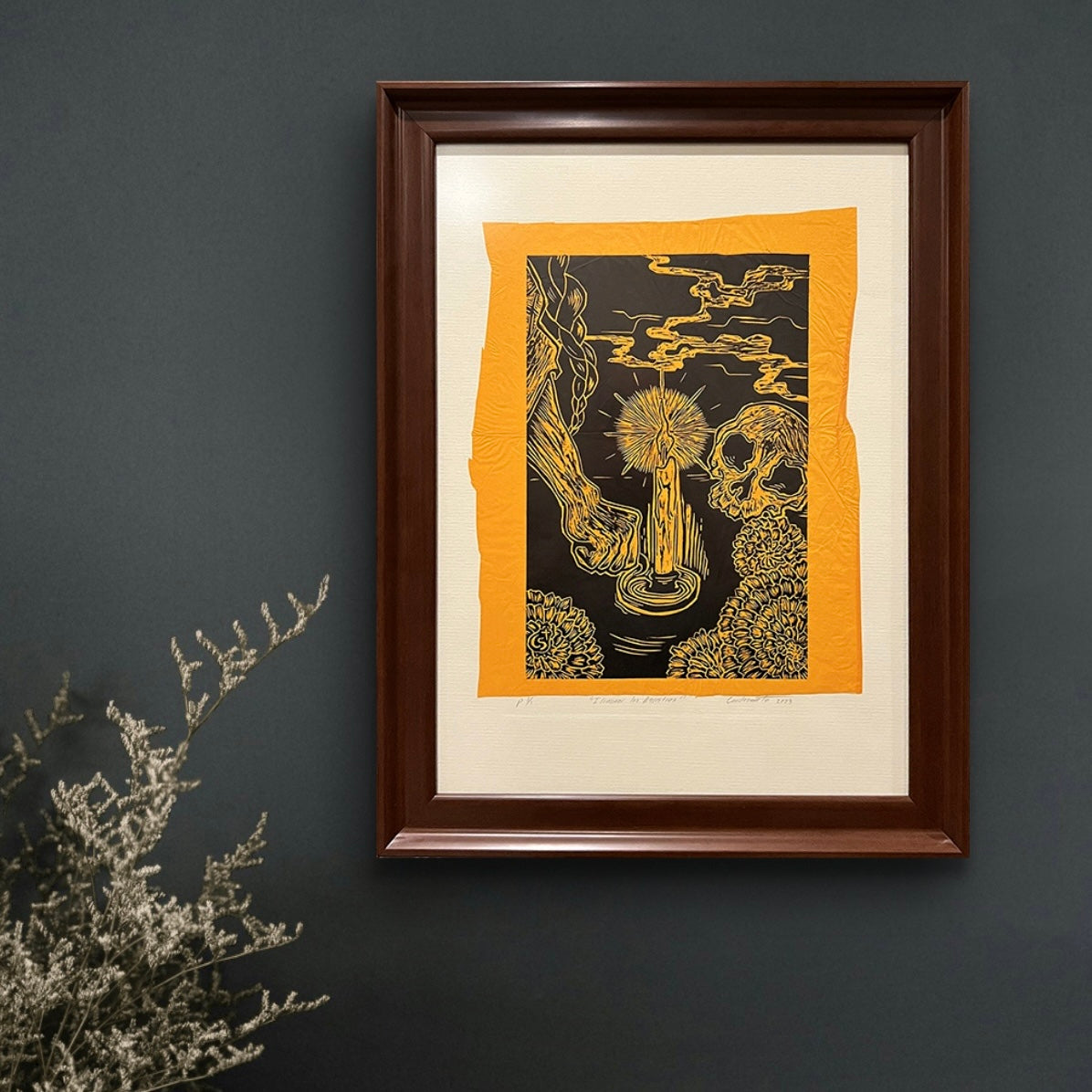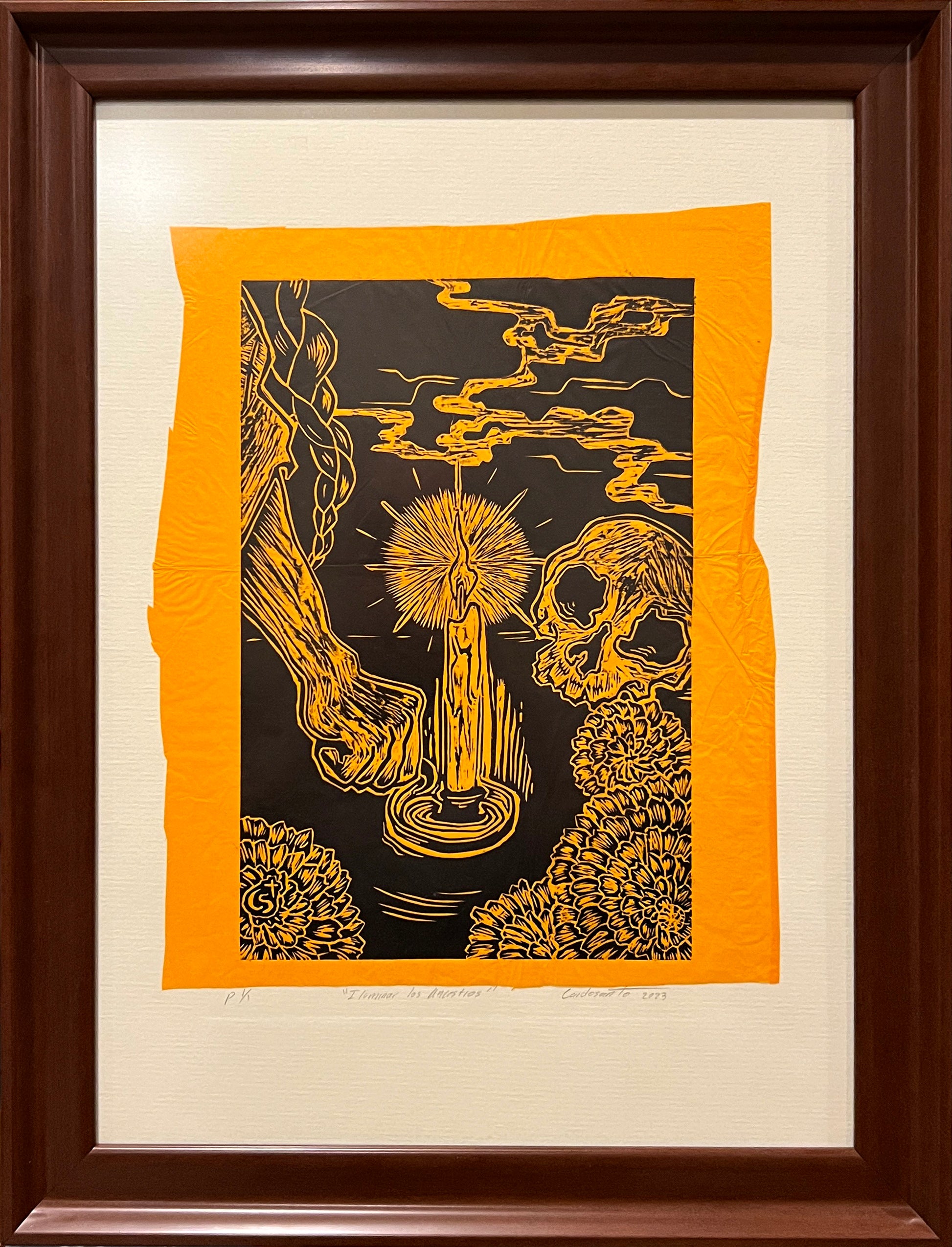 La obra presenta un momento de reflexión entre penumbras a la luz de las velas recordando a nuestros ancestros. La tradición mexicana que celebra una vez al año a aquellos que ya no están con nosotros y en este grabado se muestra ese momento de intimidad con sus recuerdos y herencia.