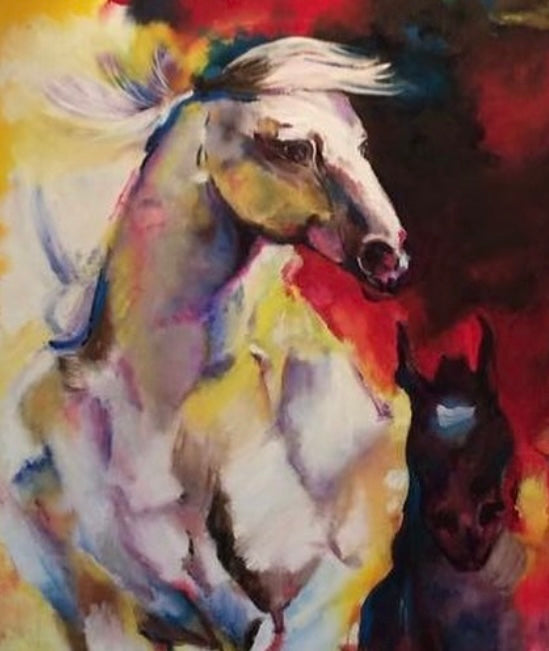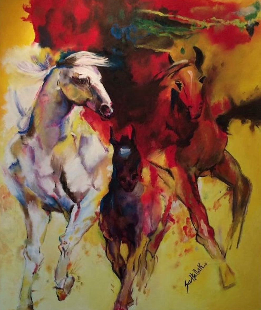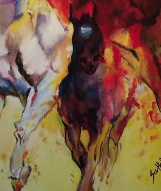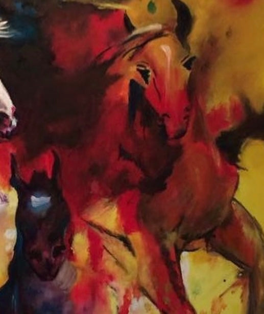 “Ímpetu” retrata la fuerza desatada del movimiento. Los caballos emergen entre ráfagas de rojo y amarillo, como si el fuego y el viento se encontraran. La pieza captura la libertad, la potencia y el espíritu indomable que avanza sin mirar atrás. Una obra vibrante que celebra el impulso vital.”