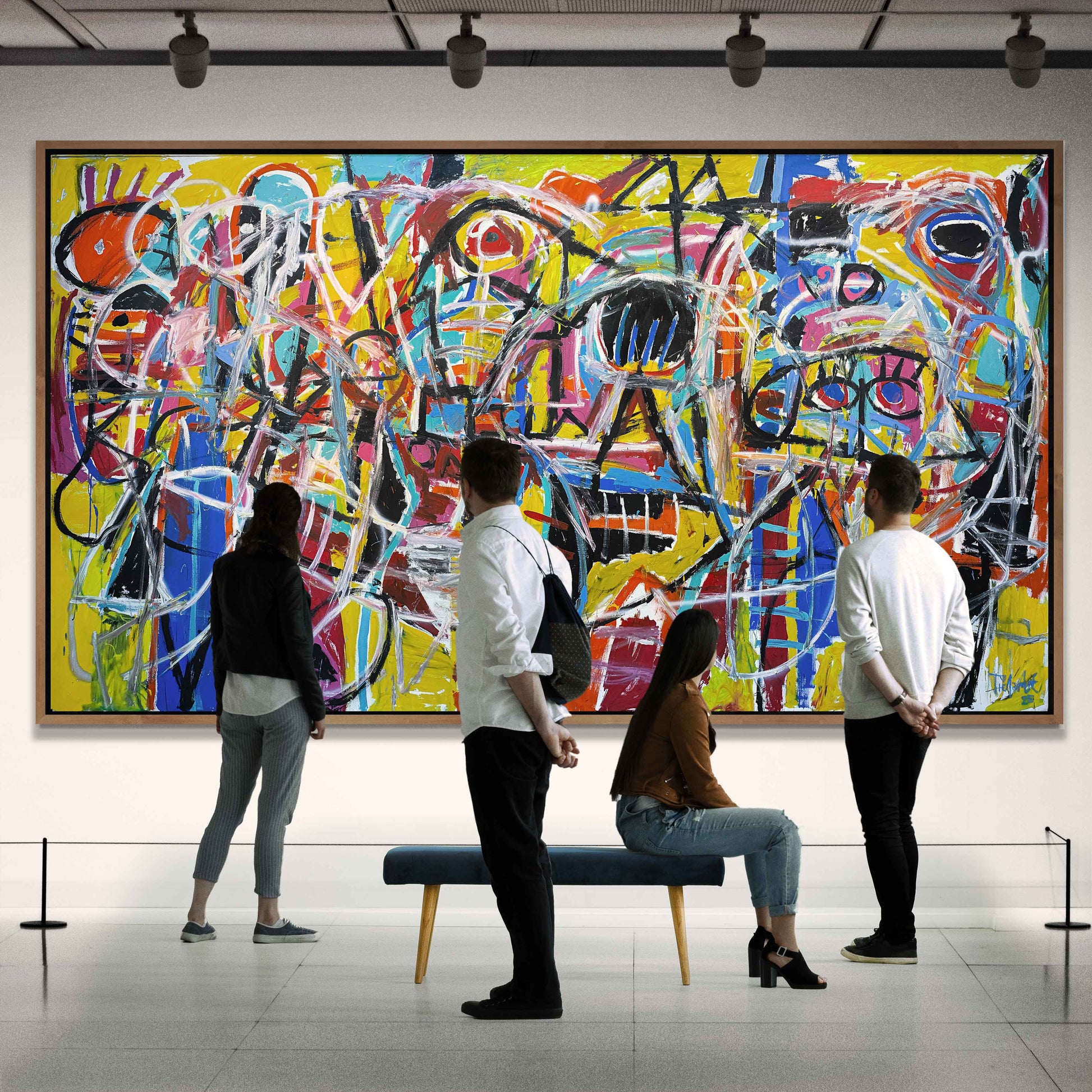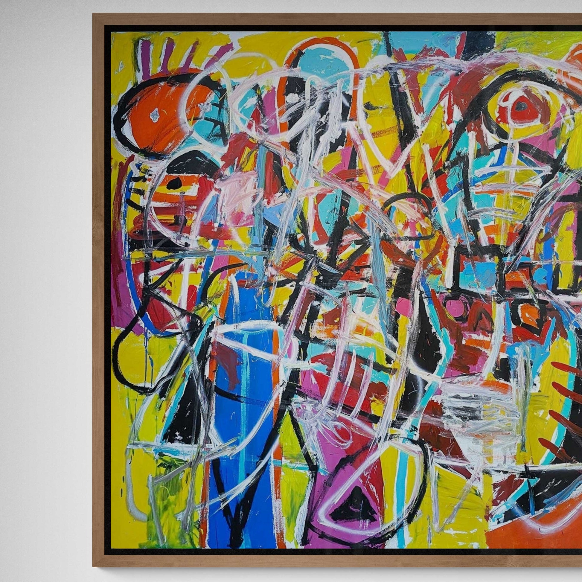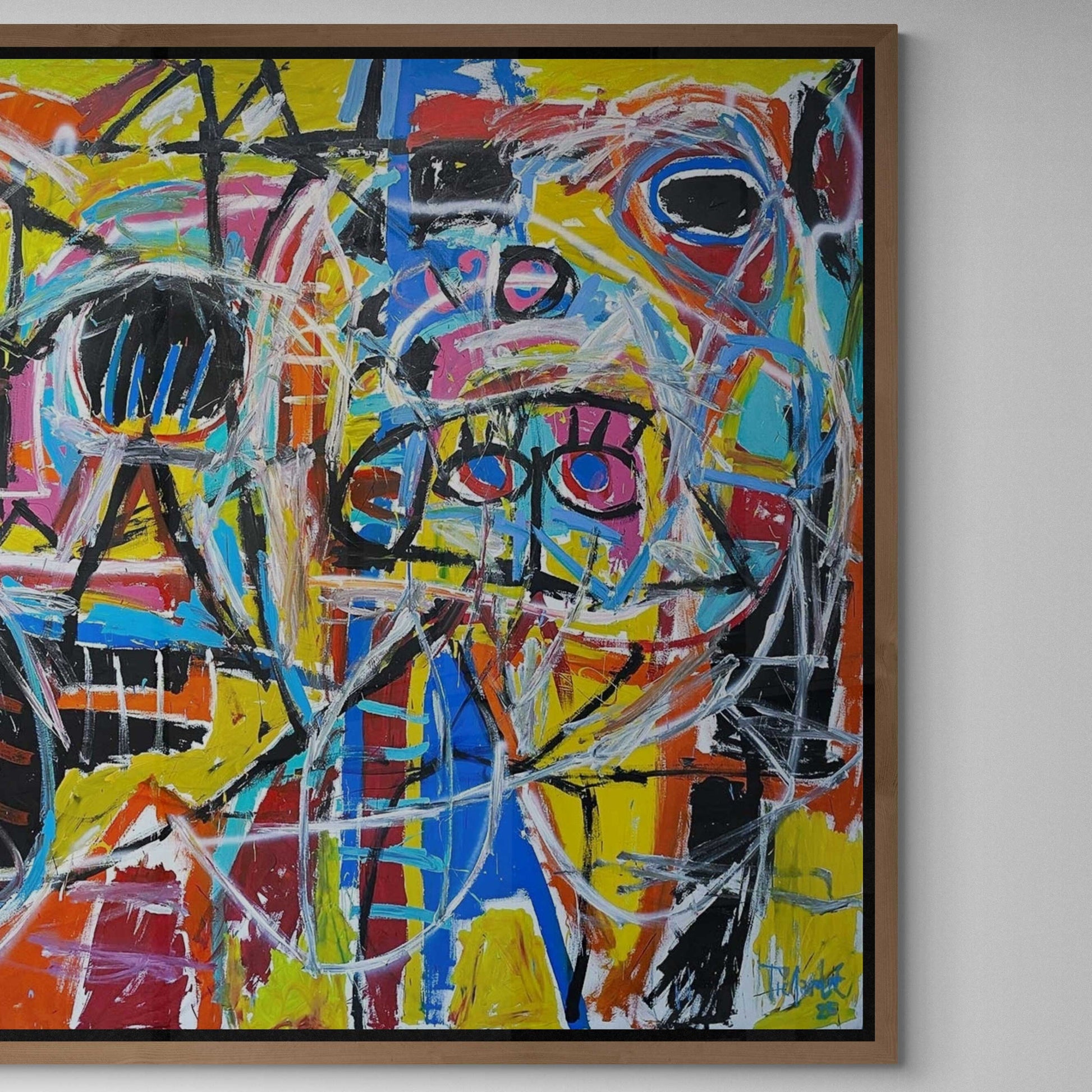 Aunque el resultado aparenta libertad absoluta, existe un orden interno que organiza el espacio. Los colores intensos y las formas se equilibran en un diálogo entre espontaneidad y control. Este balance otorga coherencia al conjunto, reforzando la intensidad expresiva.