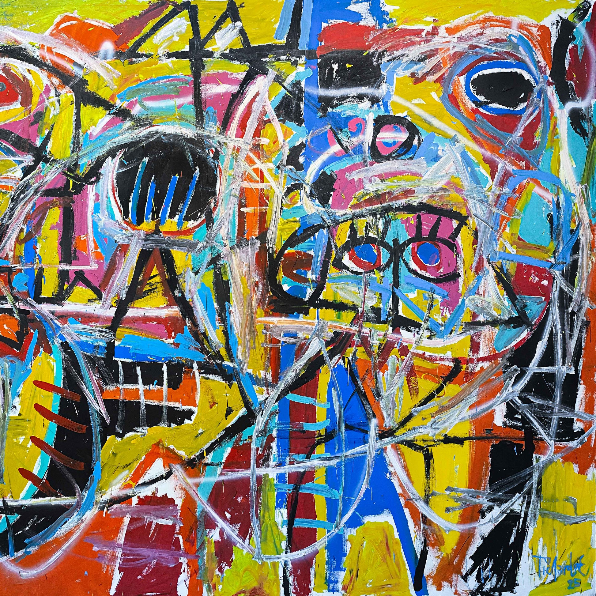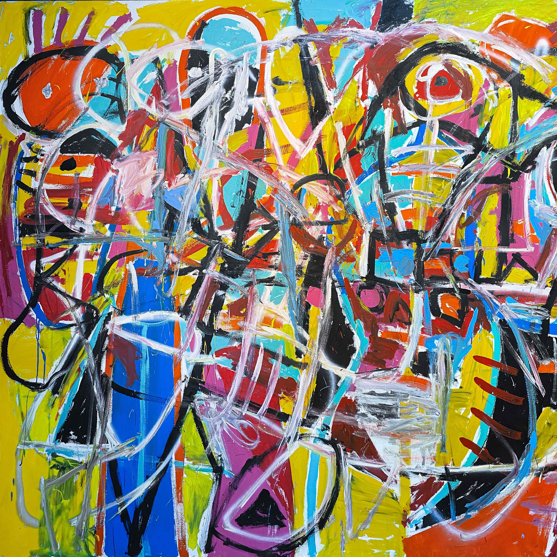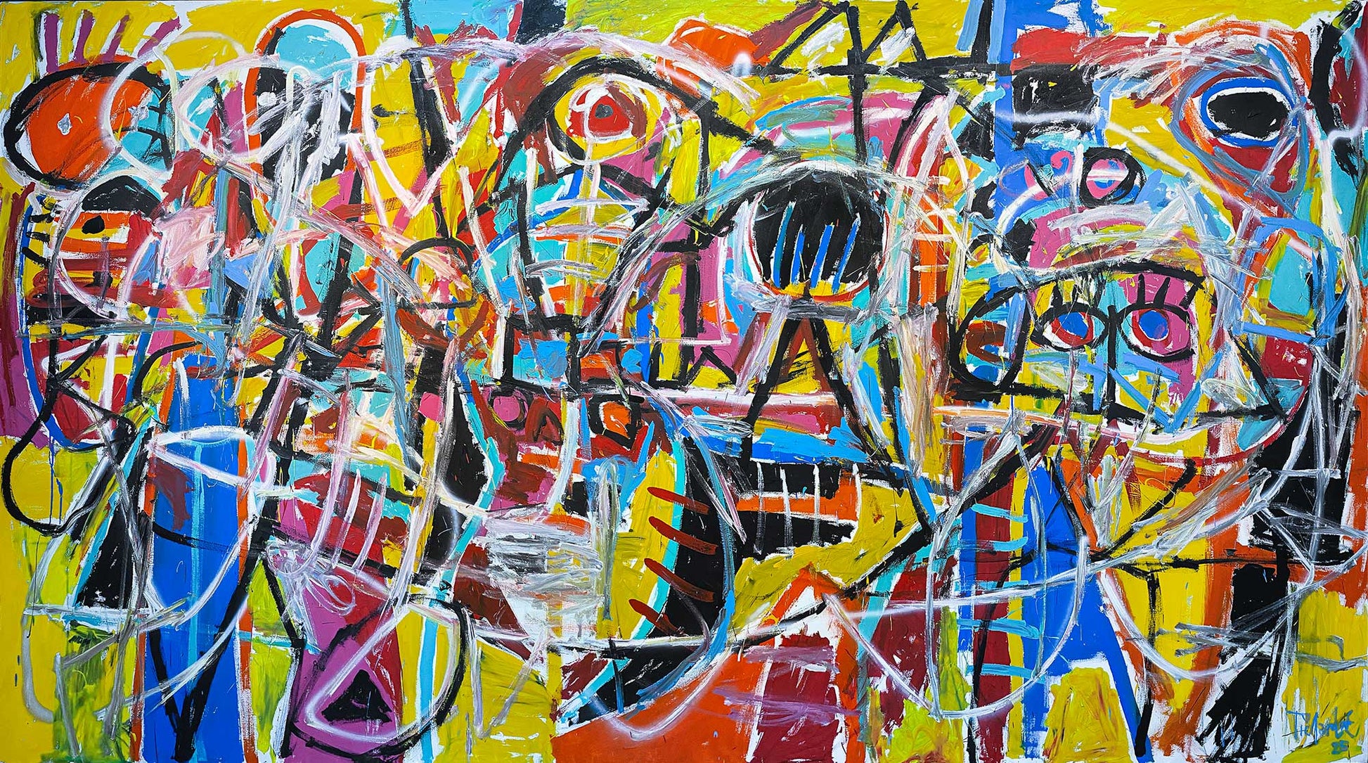Aunque el resultado aparenta libertad absoluta, existe un orden interno que organiza el espacio. Los colores intensos y las formas se equilibran en un diálogo entre espontaneidad y control. Este balance otorga coherencia al conjunto, reforzando la intensidad expresiva.