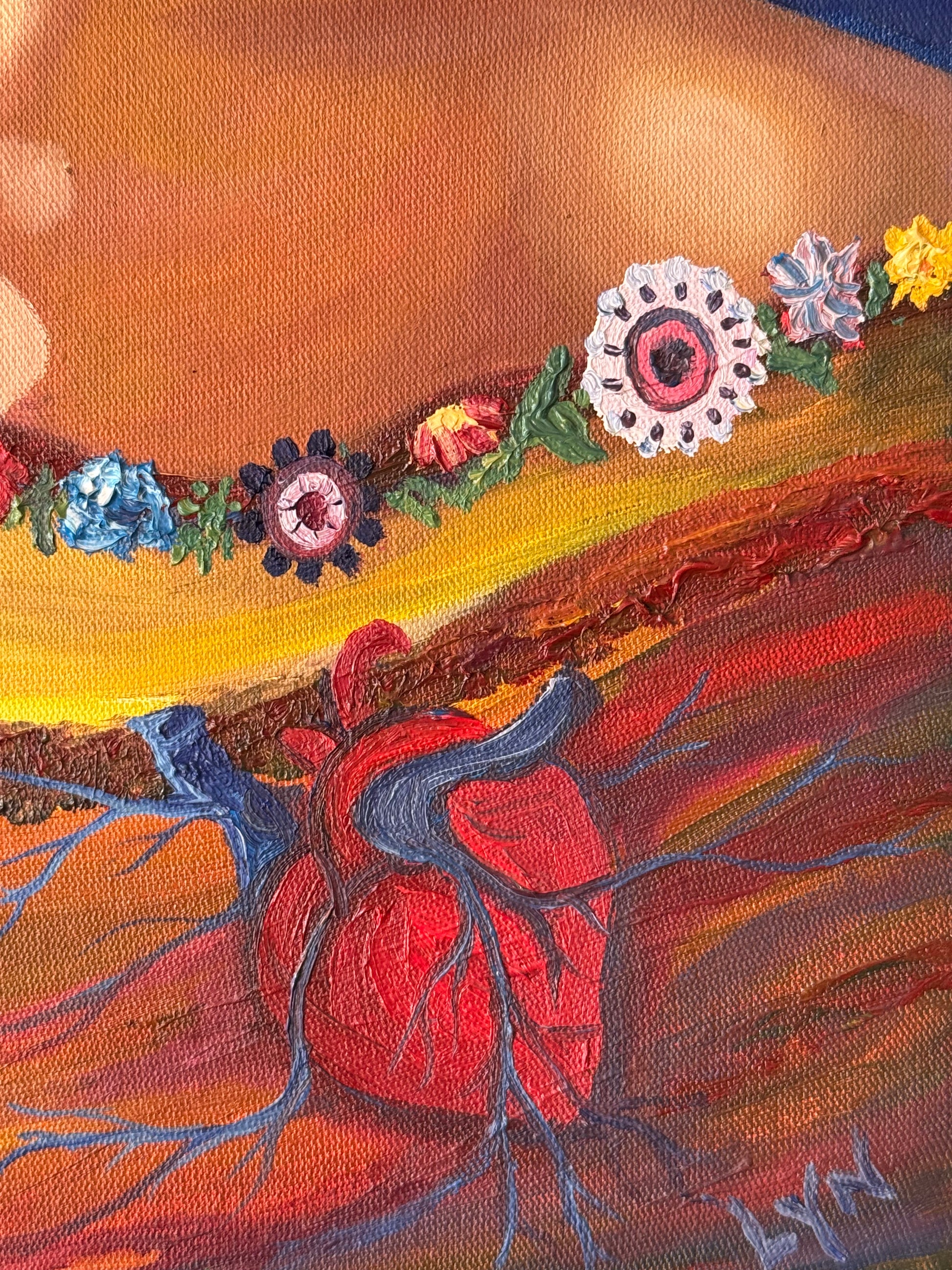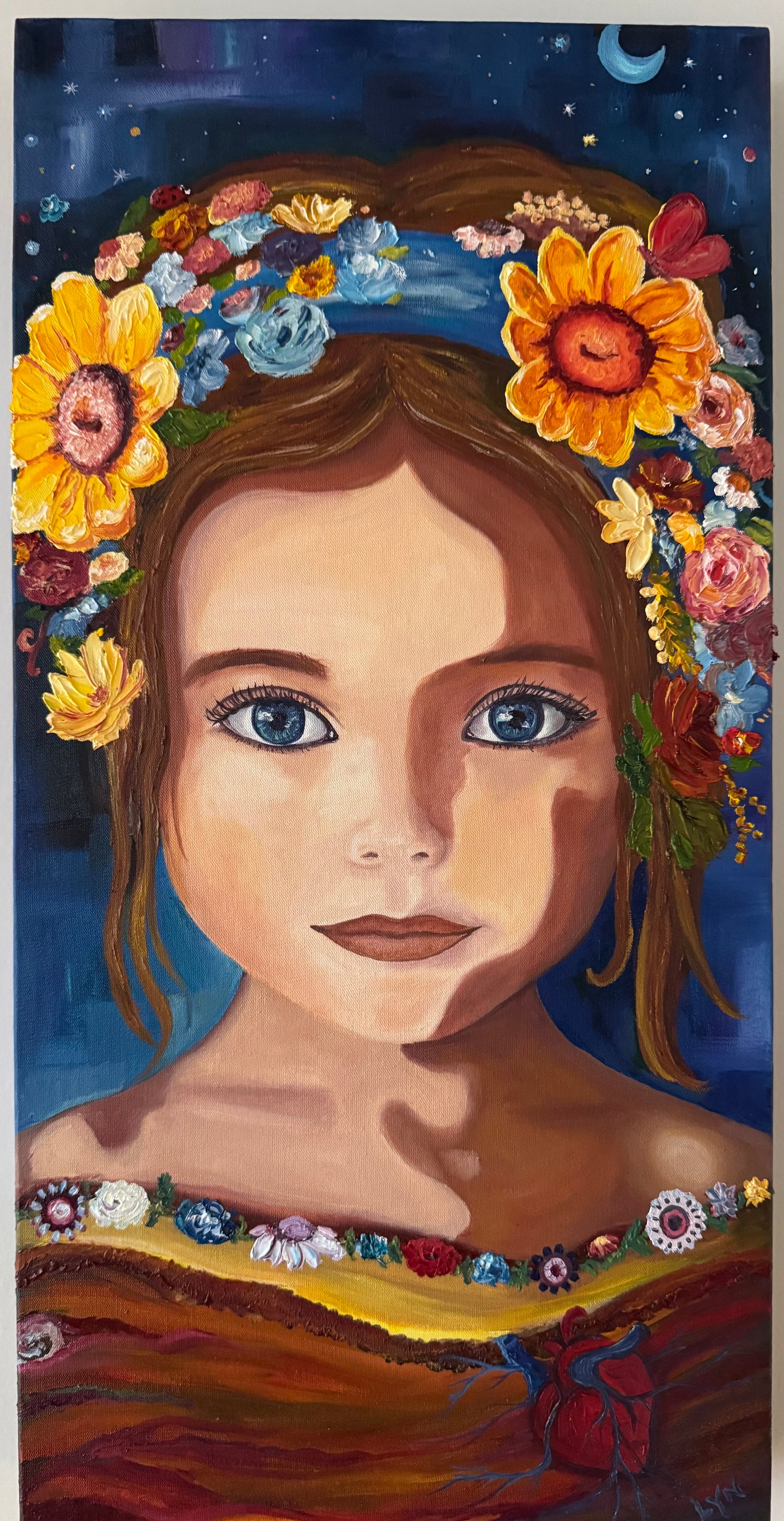 Como en otras de mis obras, algunas miradas tienen el poder de despertar preguntas en mi que no tienen respuesta. Esta es la primera de 4 hermanas gemelas que me inspiraron a crear … sumergiéndome en un mar de reflexiones. Sin buscar respuestas, quise capturar la esencia del momento, y esperando que la incertidumbre se convirtiera en arte.
