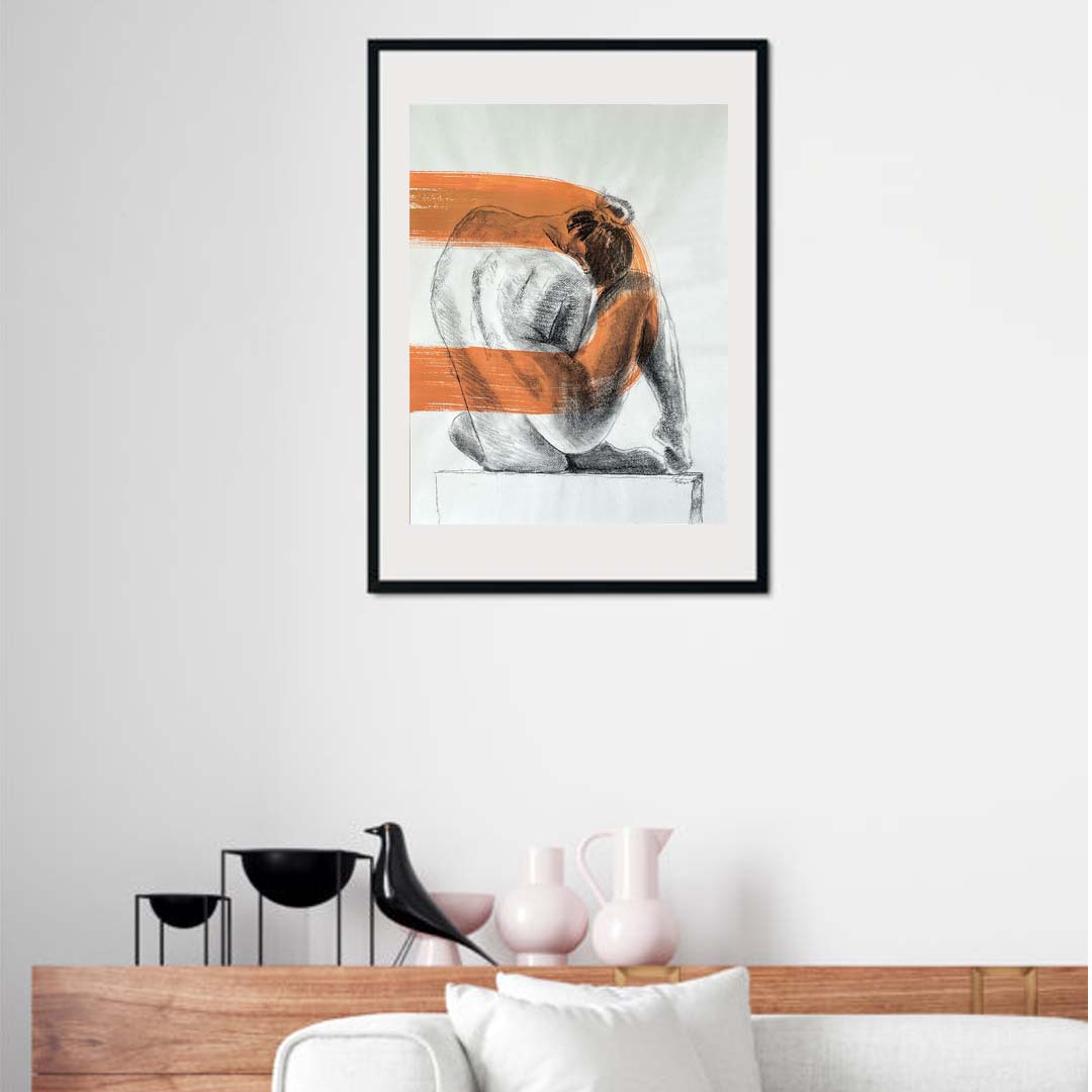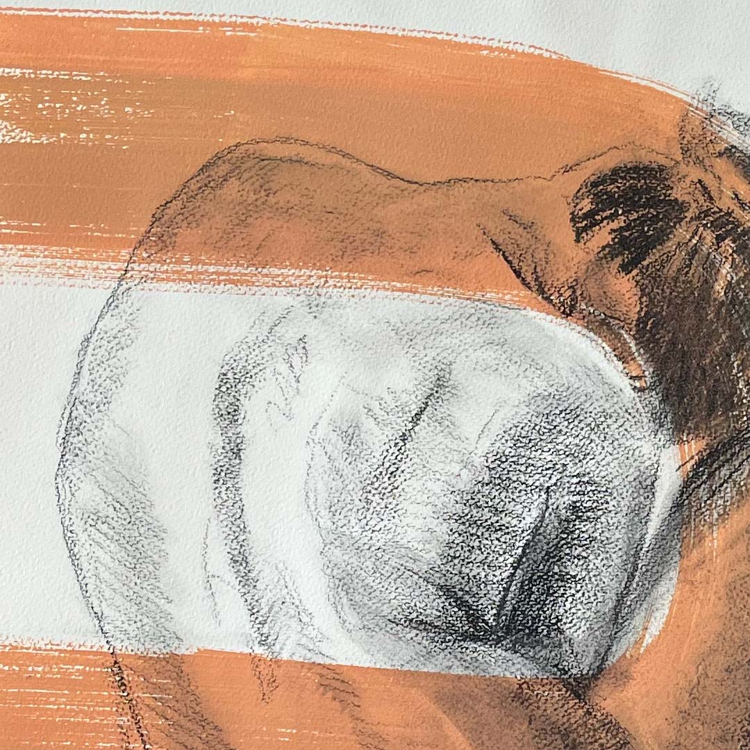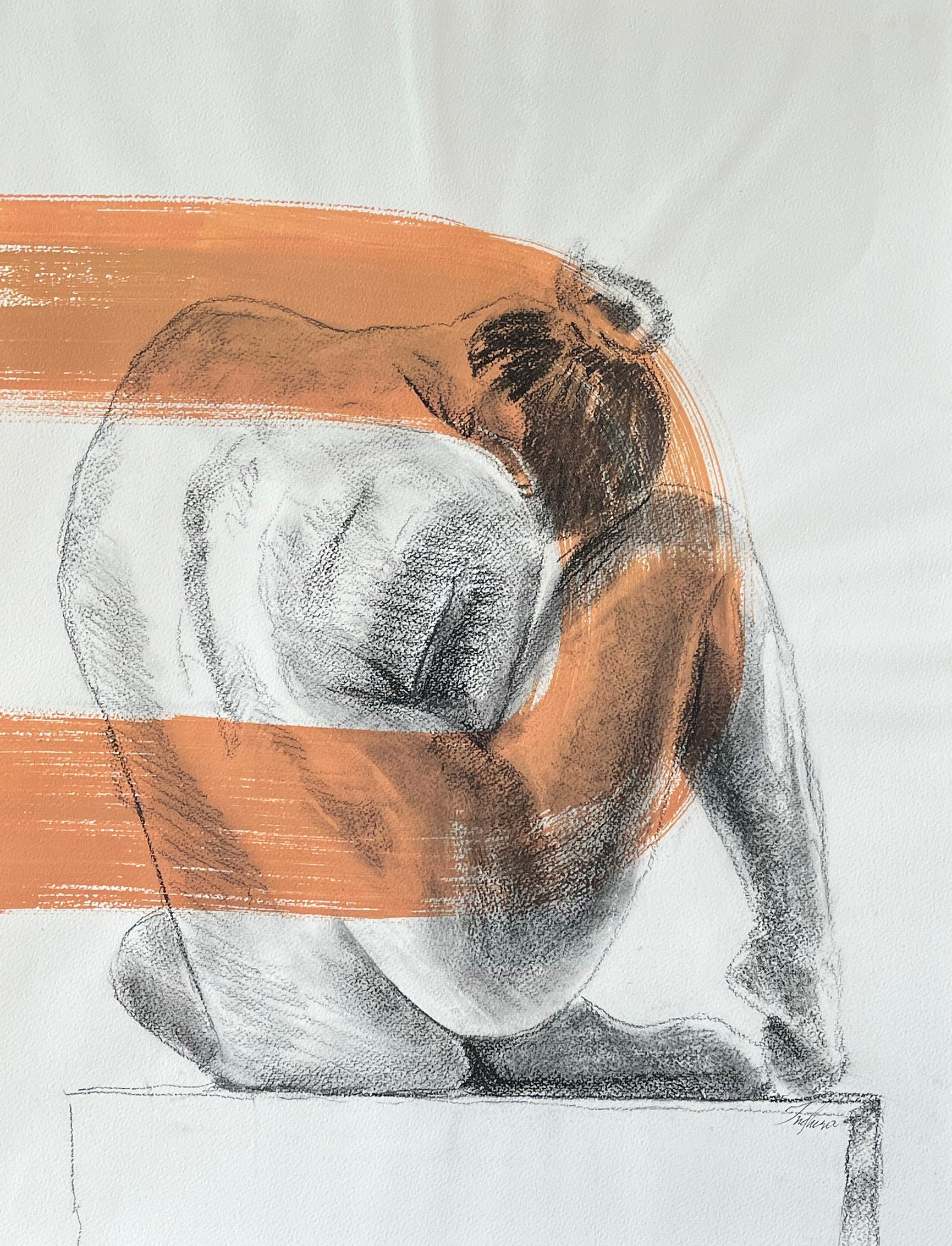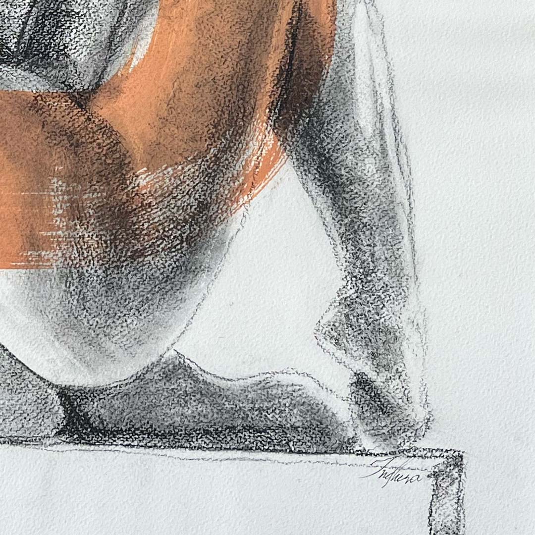 El carboncillo define suavemente las líneas y contornos del cuerpo, creando una figura de gran delicadeza. Las pinceladas de acrílico en tonos coral aportan un toque vibrante y dinámico, contrastando bellamente con la sutileza del carboncillo. La textura del papel de algodón enriquece la composición, resaltando la elegancia del desnudo y la fluidez de los brochazos. Esta pieza destaca la belleza y el poder visual del cuerpo femenino.