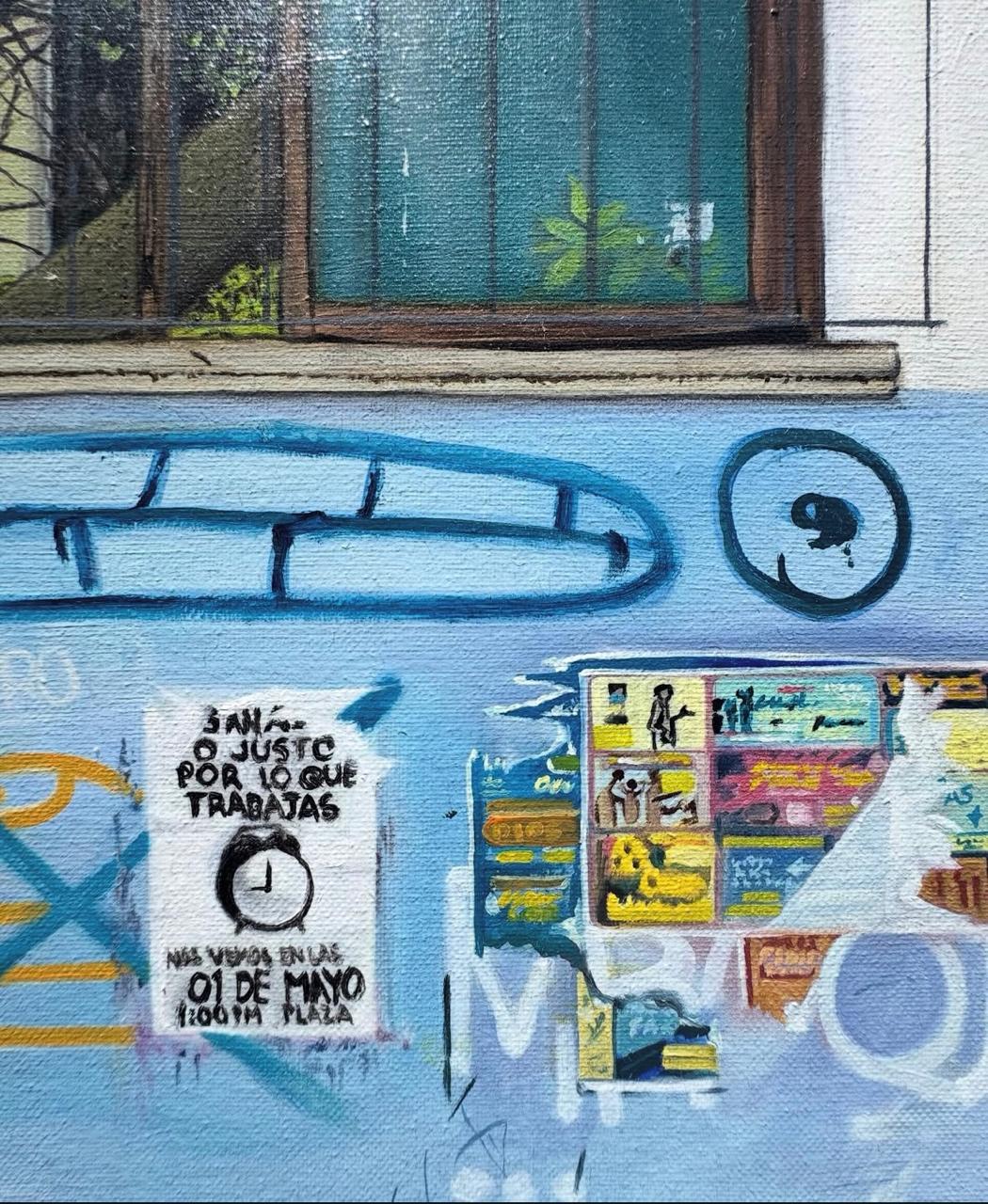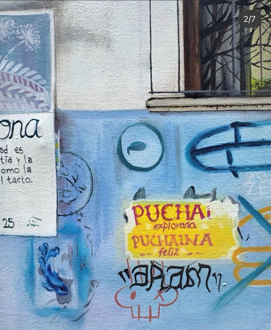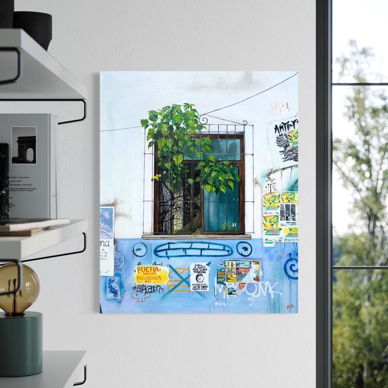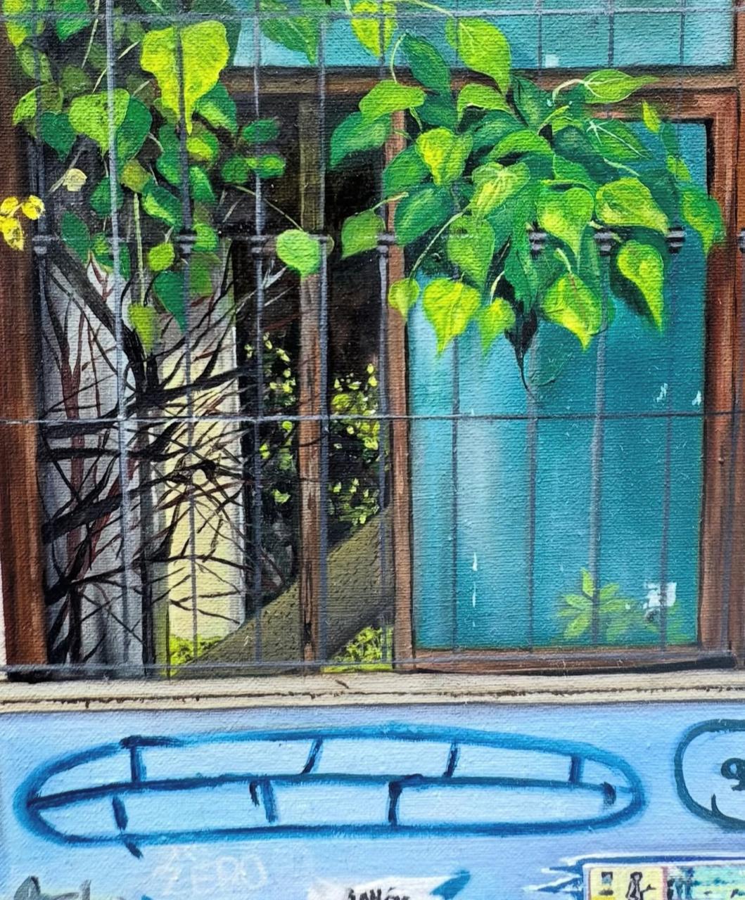 Una ventana que revela vida, historia y contrastes. En medio de un muro urbano desgastado, el follaje que se asoma entre las rejas simboliza cómo la naturaleza insiste en abrirse paso. Los grafitis y marcas que rodean la escena reflejan el paso del tiempo y las voces de la ciudad. Me interesa ese diálogo entre lo natural y lo urbano, entre lo permanente y lo efímero, que convive en este fragmento del paisaje.