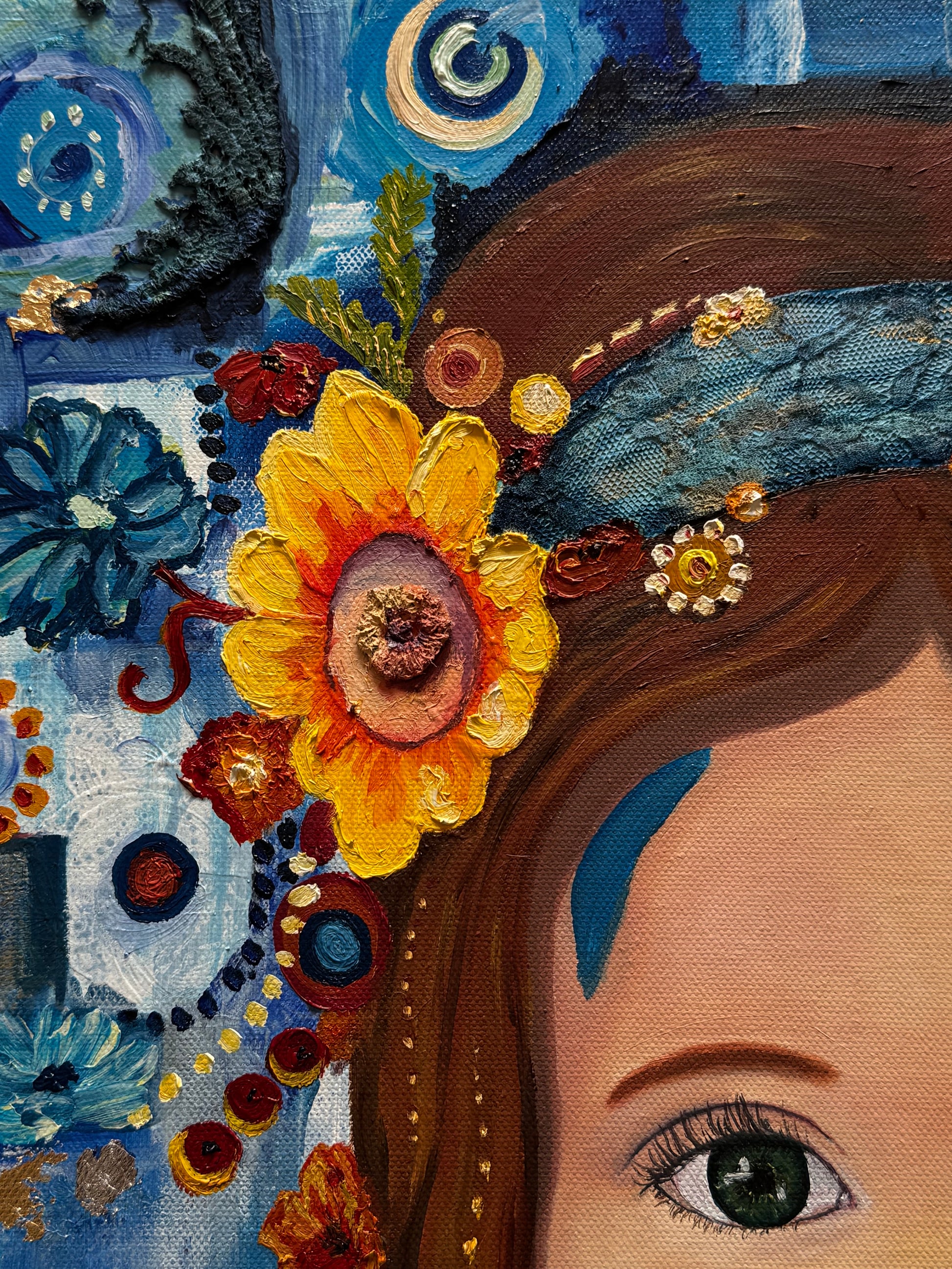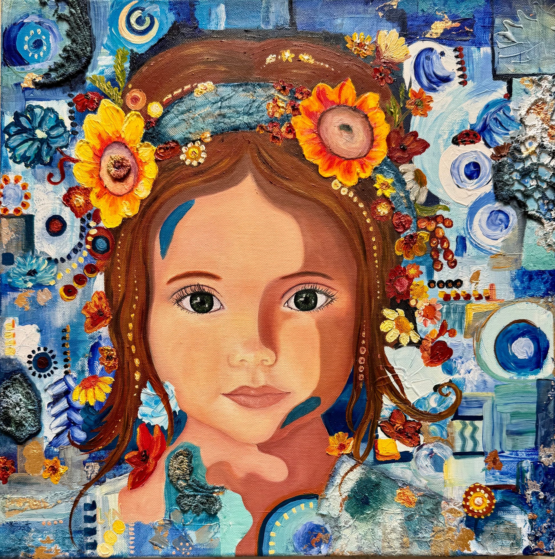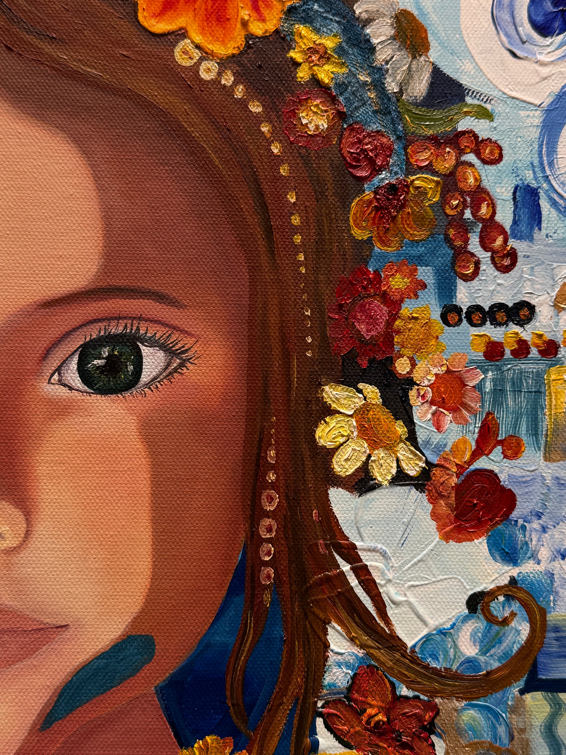 Como en otras de mis obras, algunas miradas tienen el poder de despertar preguntas en mi que no tienen respuesta. Esta es la cuarta de 4 hermanas gemelas que me inspiraron a crear … sumergiéndome en un mar de reflexiones. Sin buscar respuestas, quise capturar la esencia del momento, y esperando que la incertidumbre se convirtiera en arte.