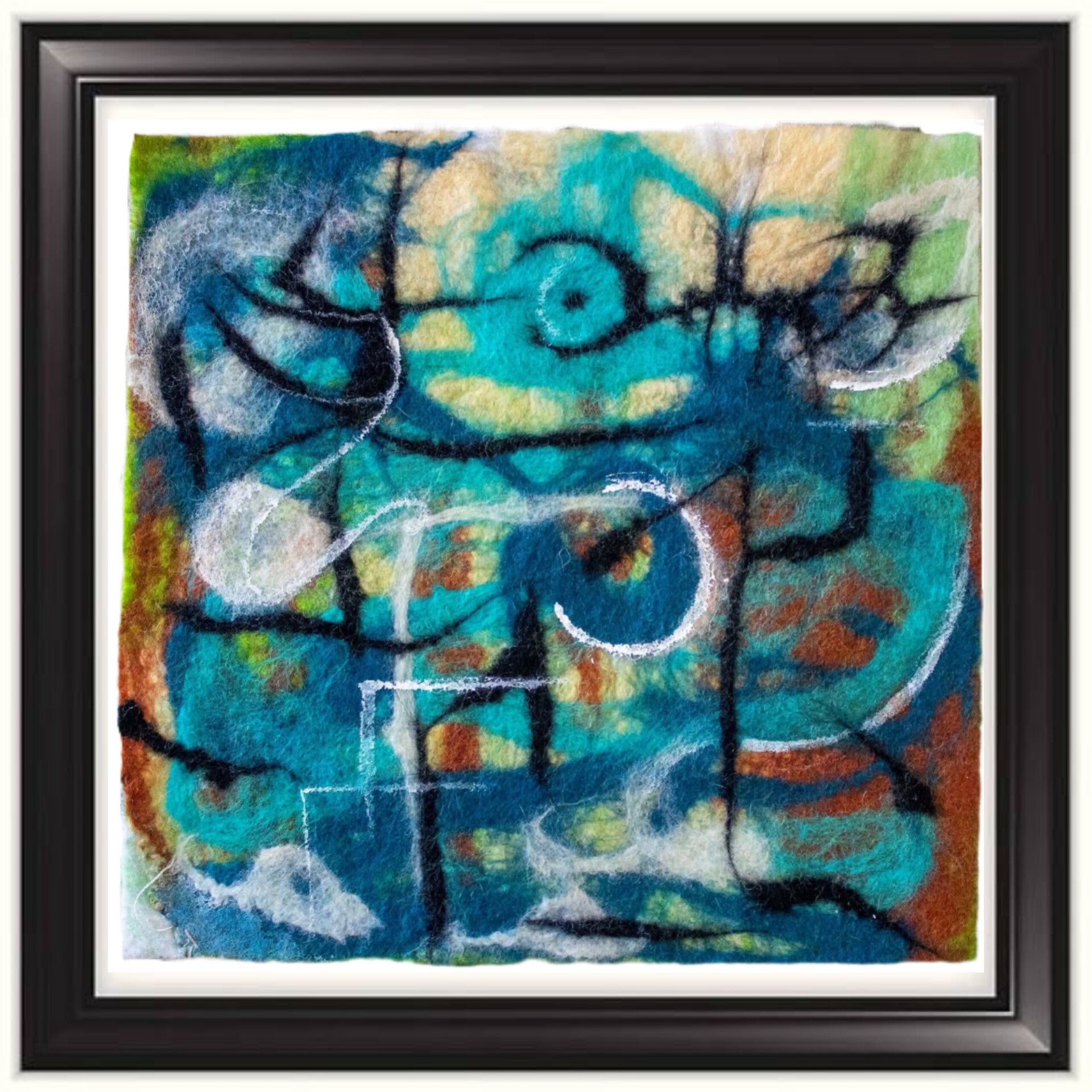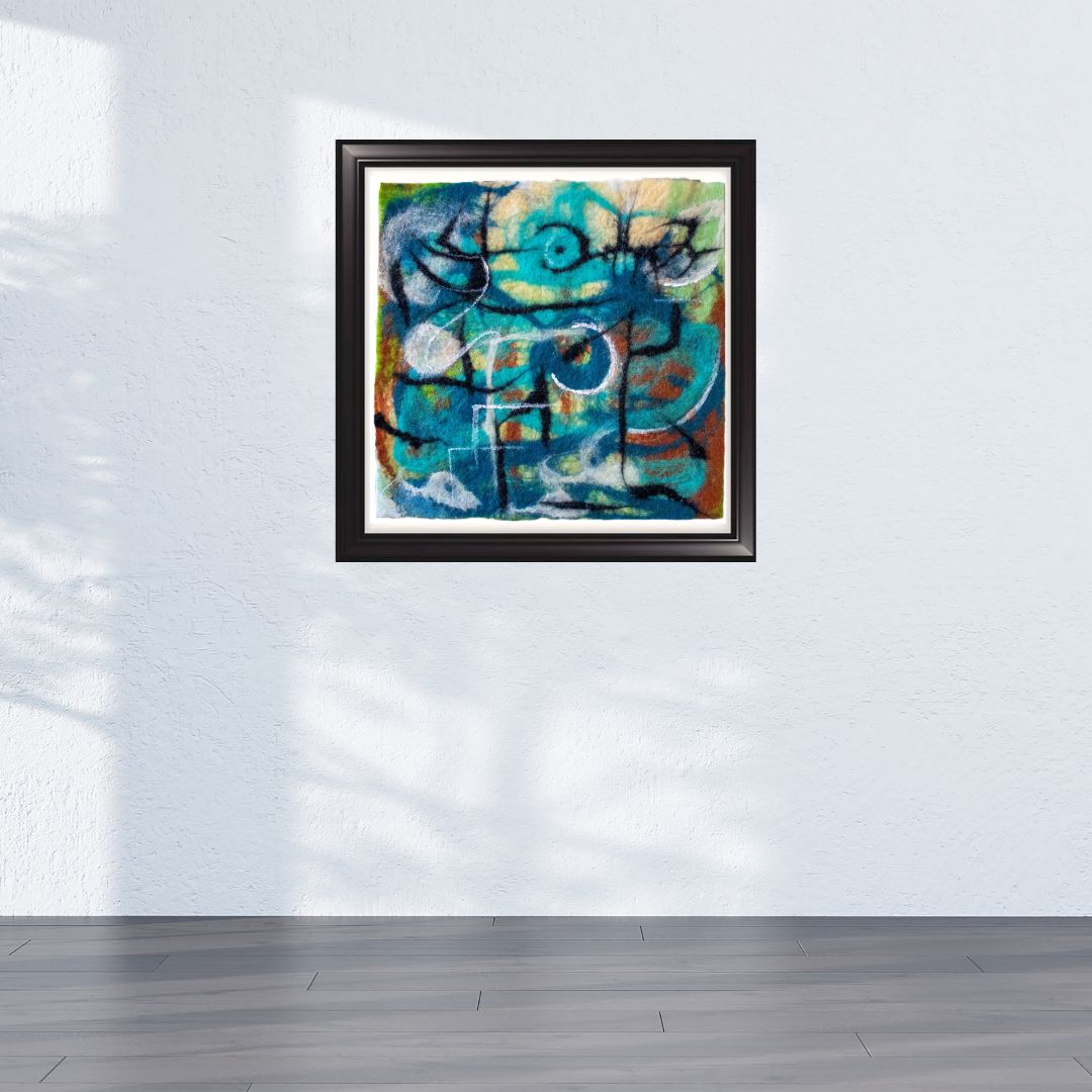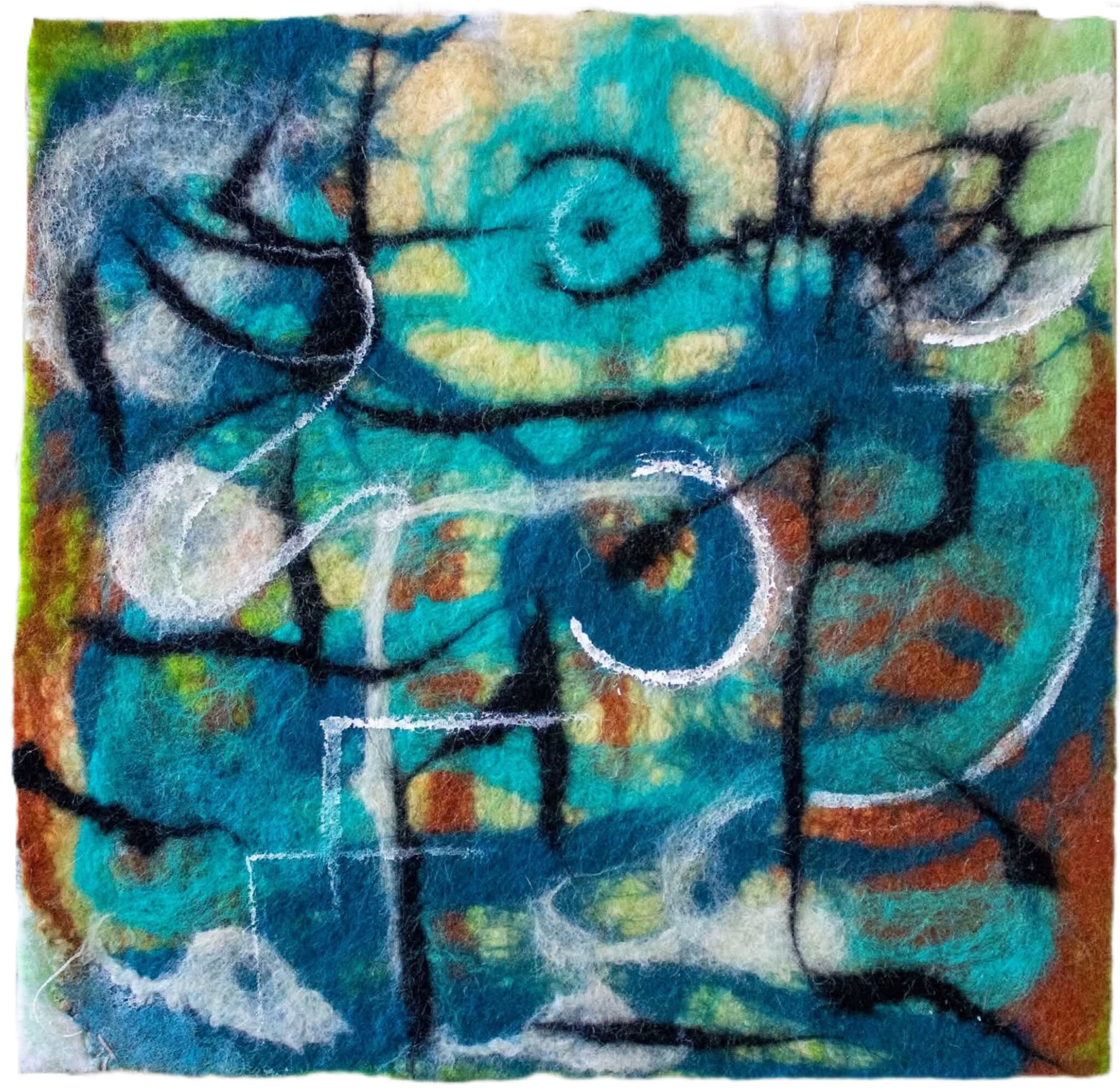 Textil de lana creado bajo la técnica de fieltrado húmedo intervenido con acrílicos y bordado textil.