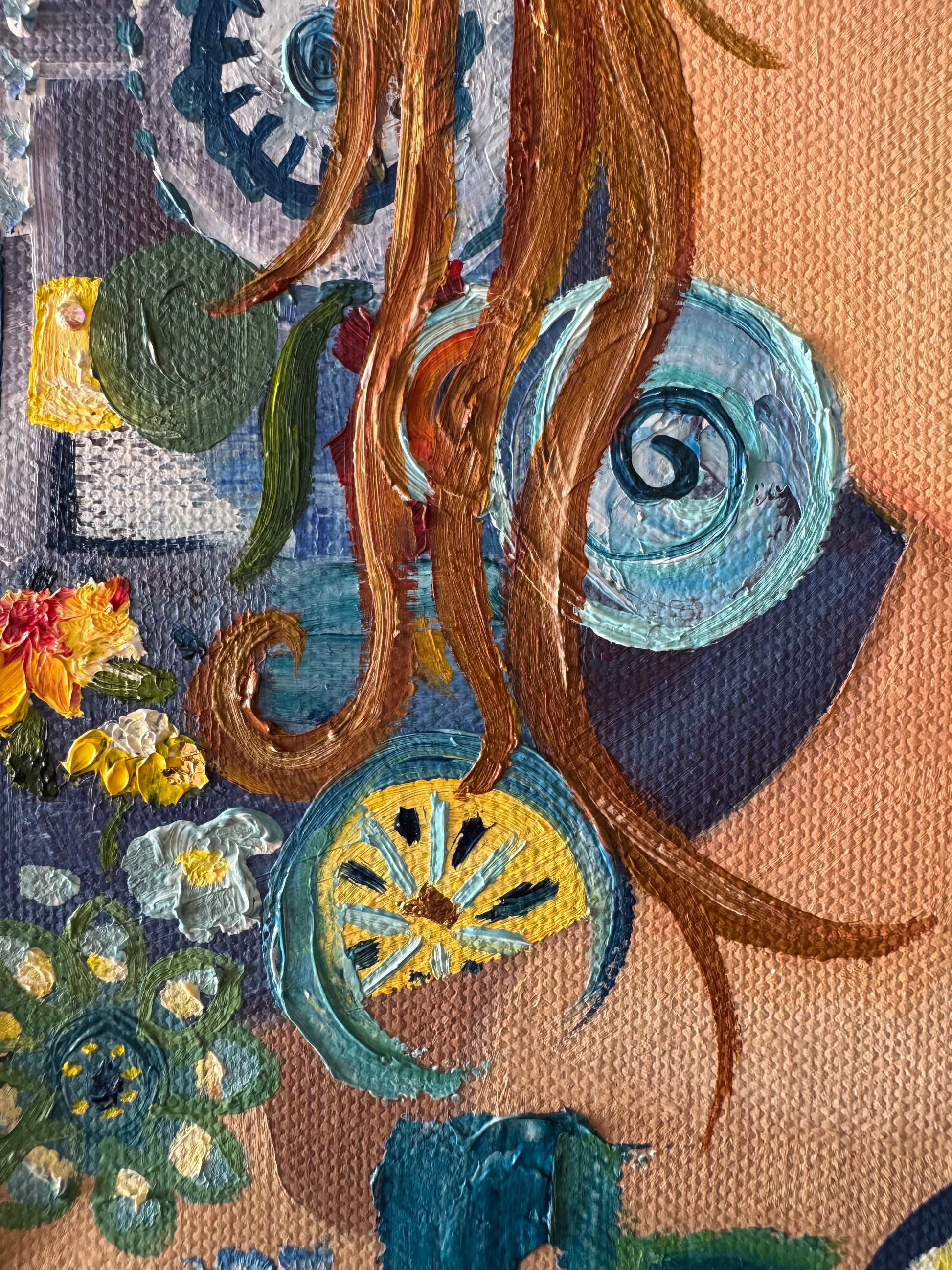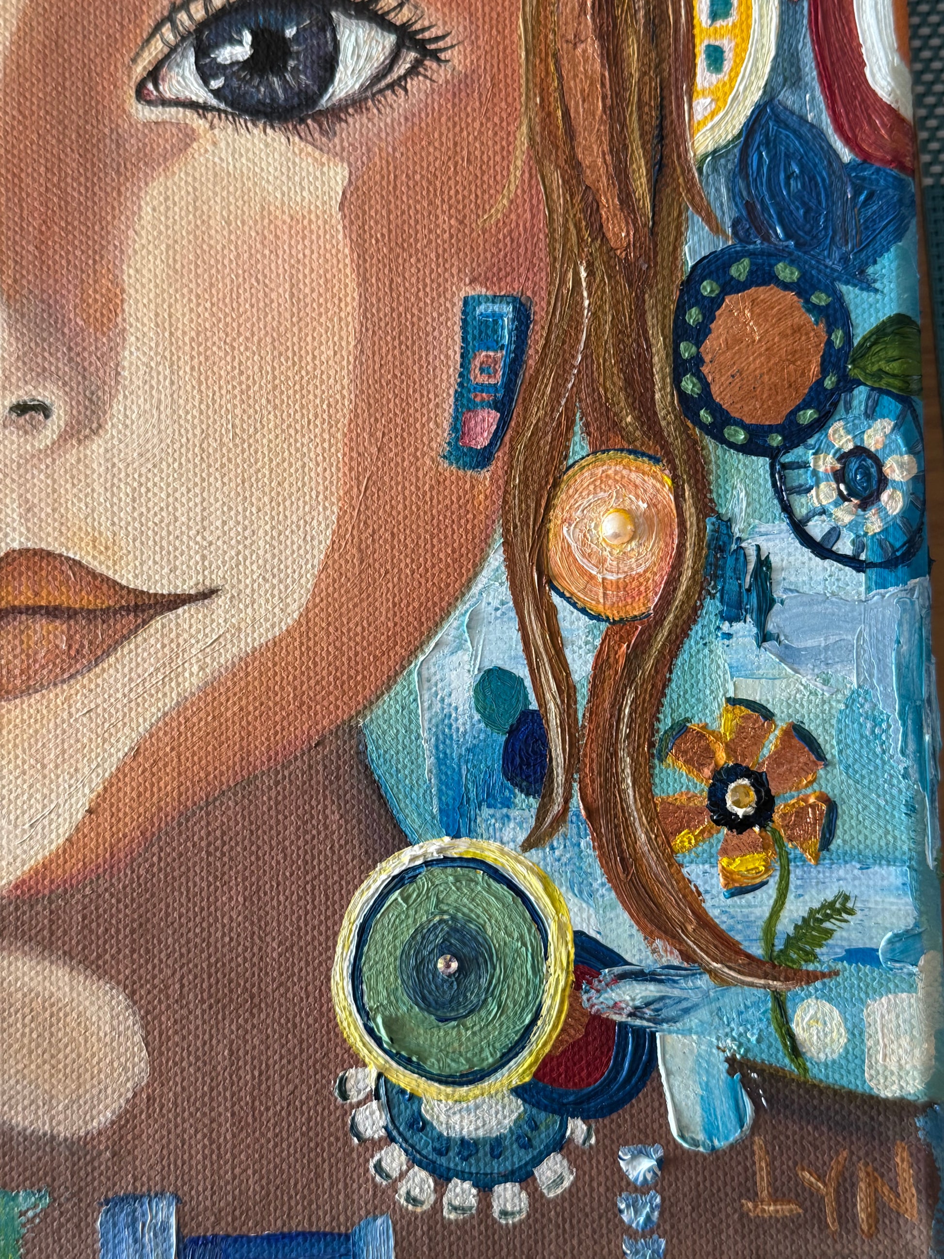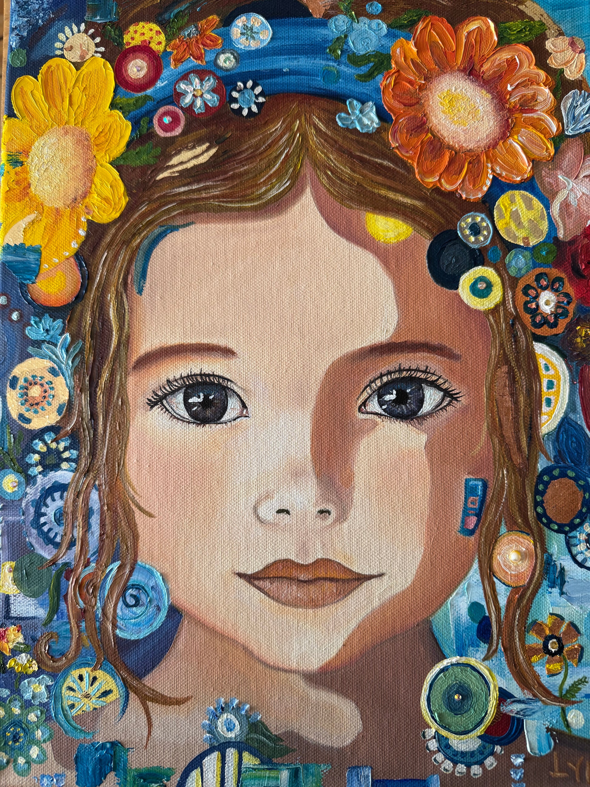 Como en otras de mis obras, algunas miradas tienen el poder de despertar preguntas en mí, que no tienen respuesta. Esta es la segunda de 4 hermanas gemelas que me inspiraron a crear … sumergiéndome en un mar de reflexiones. Sin buscar respuestas, quise capturar la esencia del momento, y esperando que la incertidumbre se convirtiera en arte.