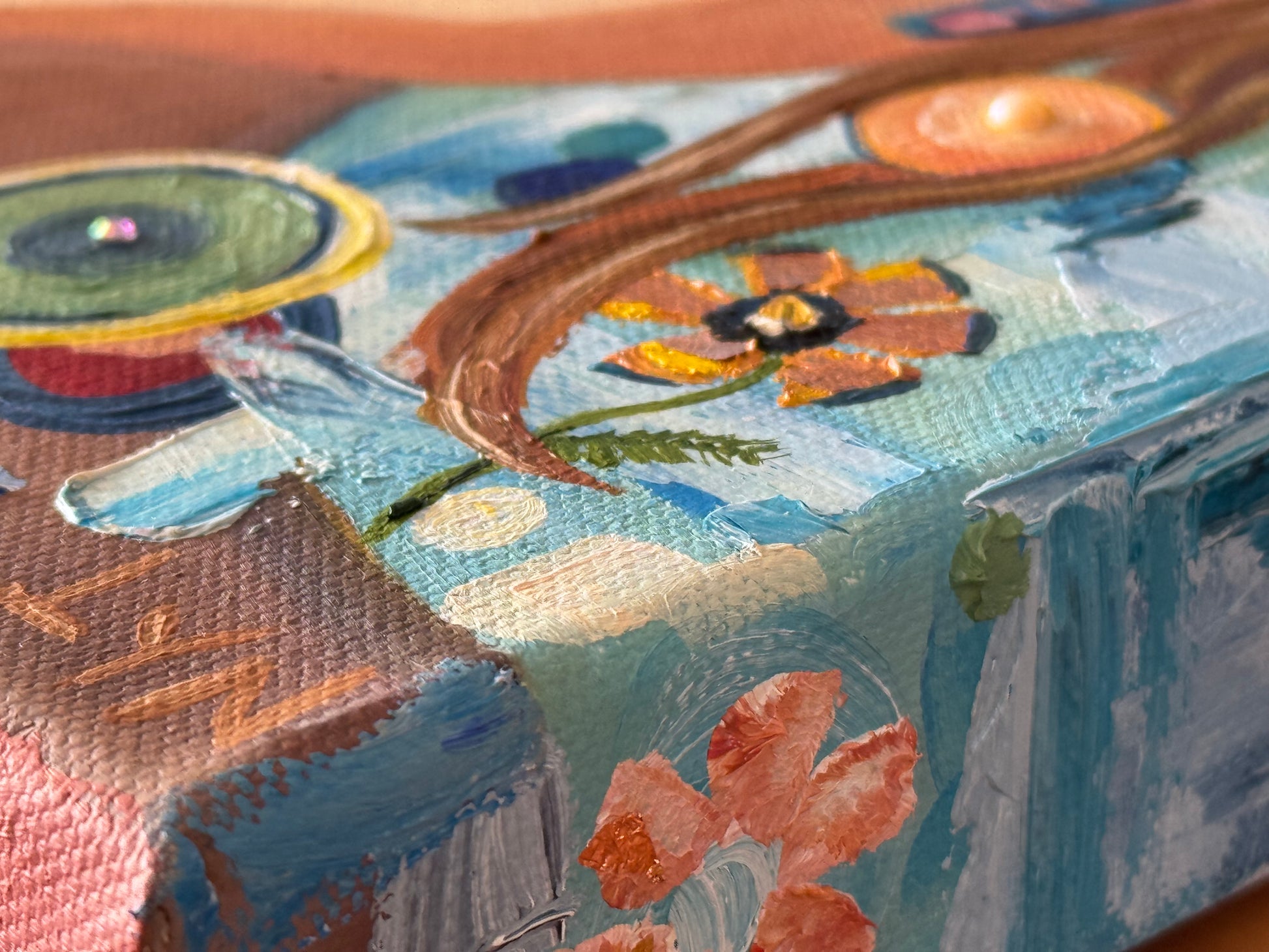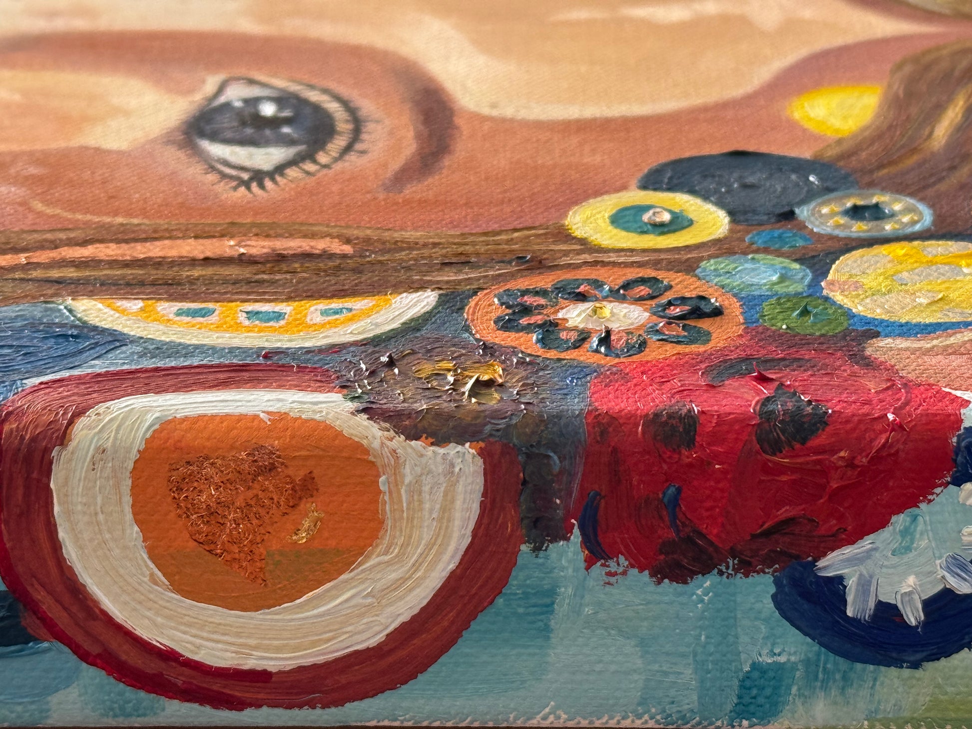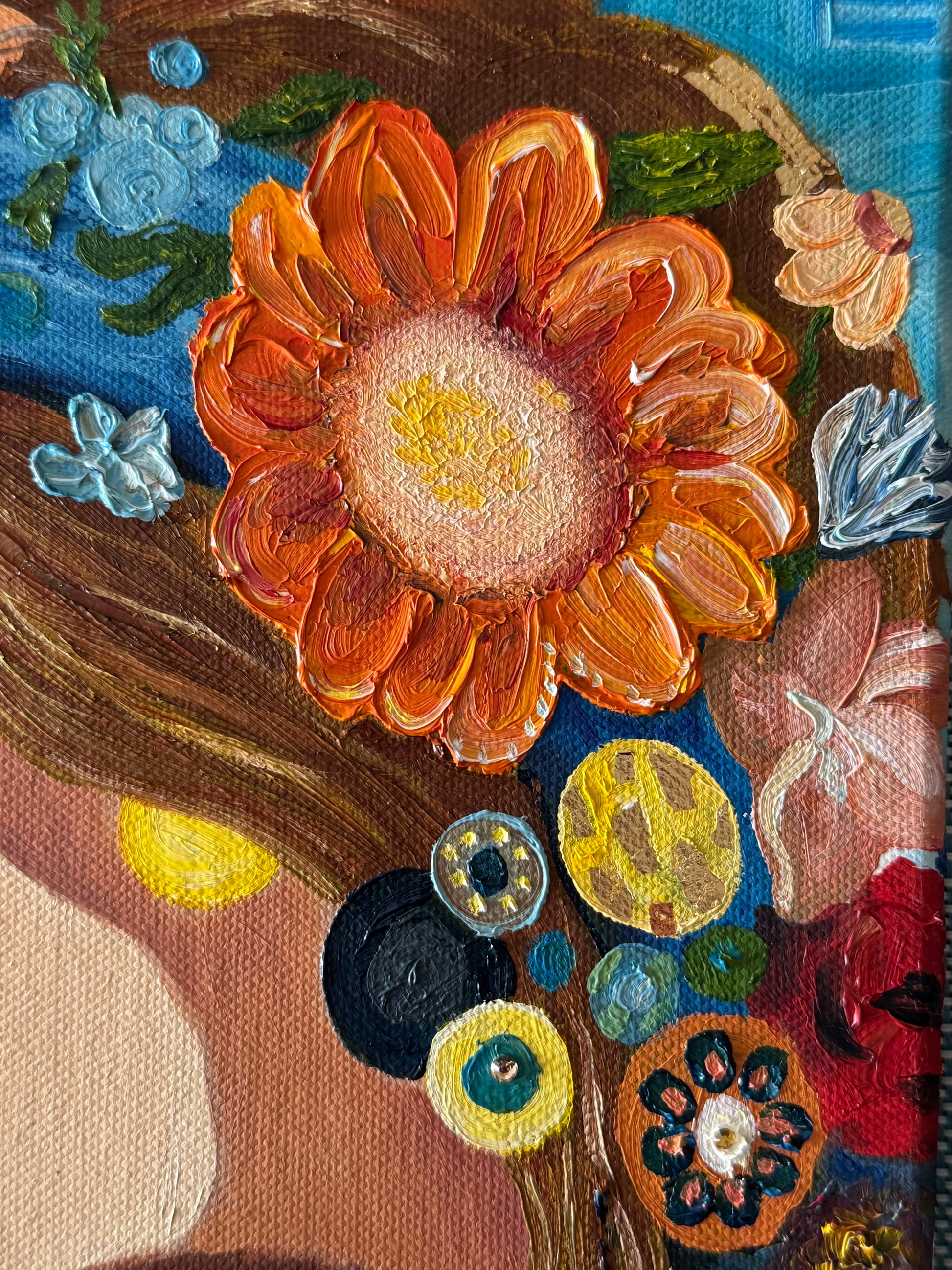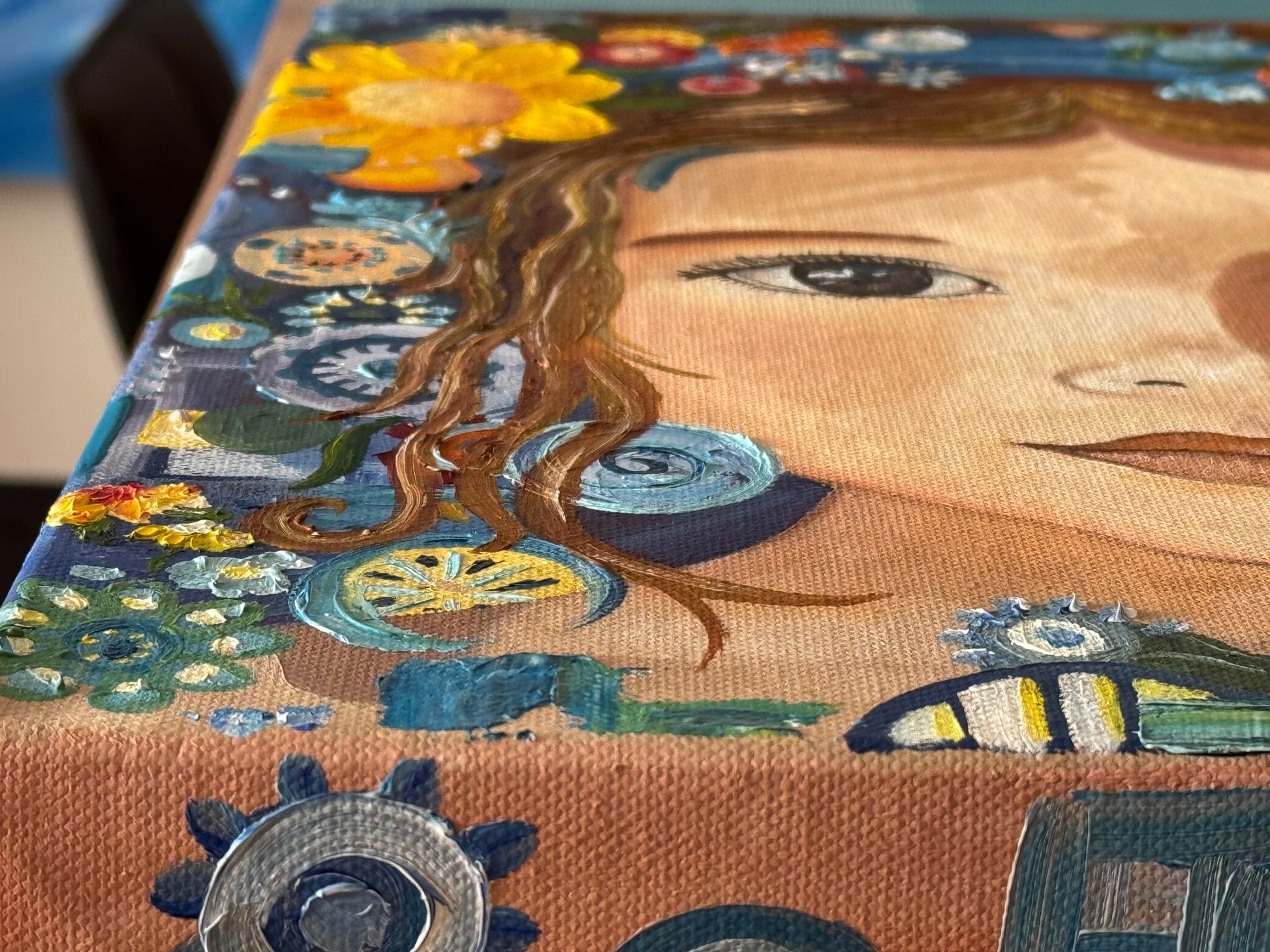 Como en otras de mis obras, algunas miradas tienen el poder de despertar preguntas en mí, que no tienen respuesta. Esta es la segunda de 4 hermanas gemelas que me inspiraron a crear … sumergiéndome en un mar de reflexiones. Sin buscar respuestas, quise capturar la esencia del momento, y esperando que la incertidumbre se convirtiera en arte.