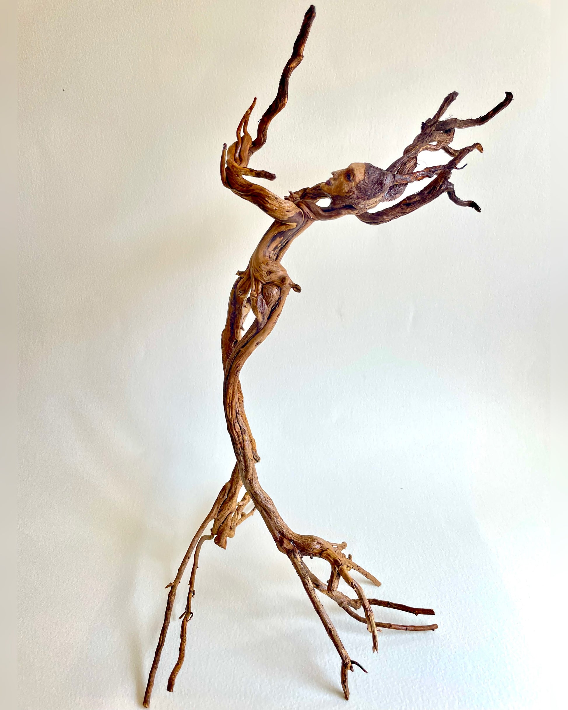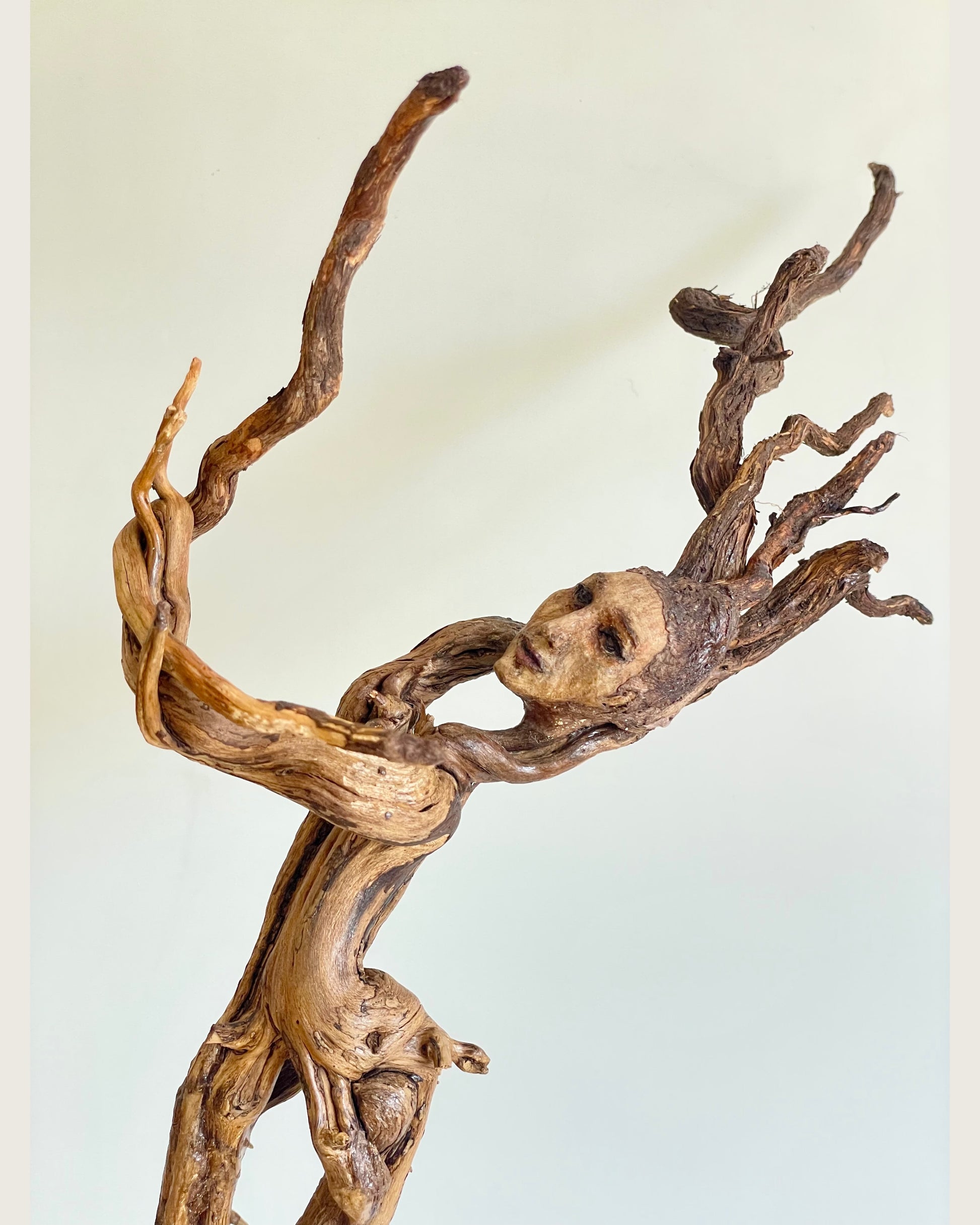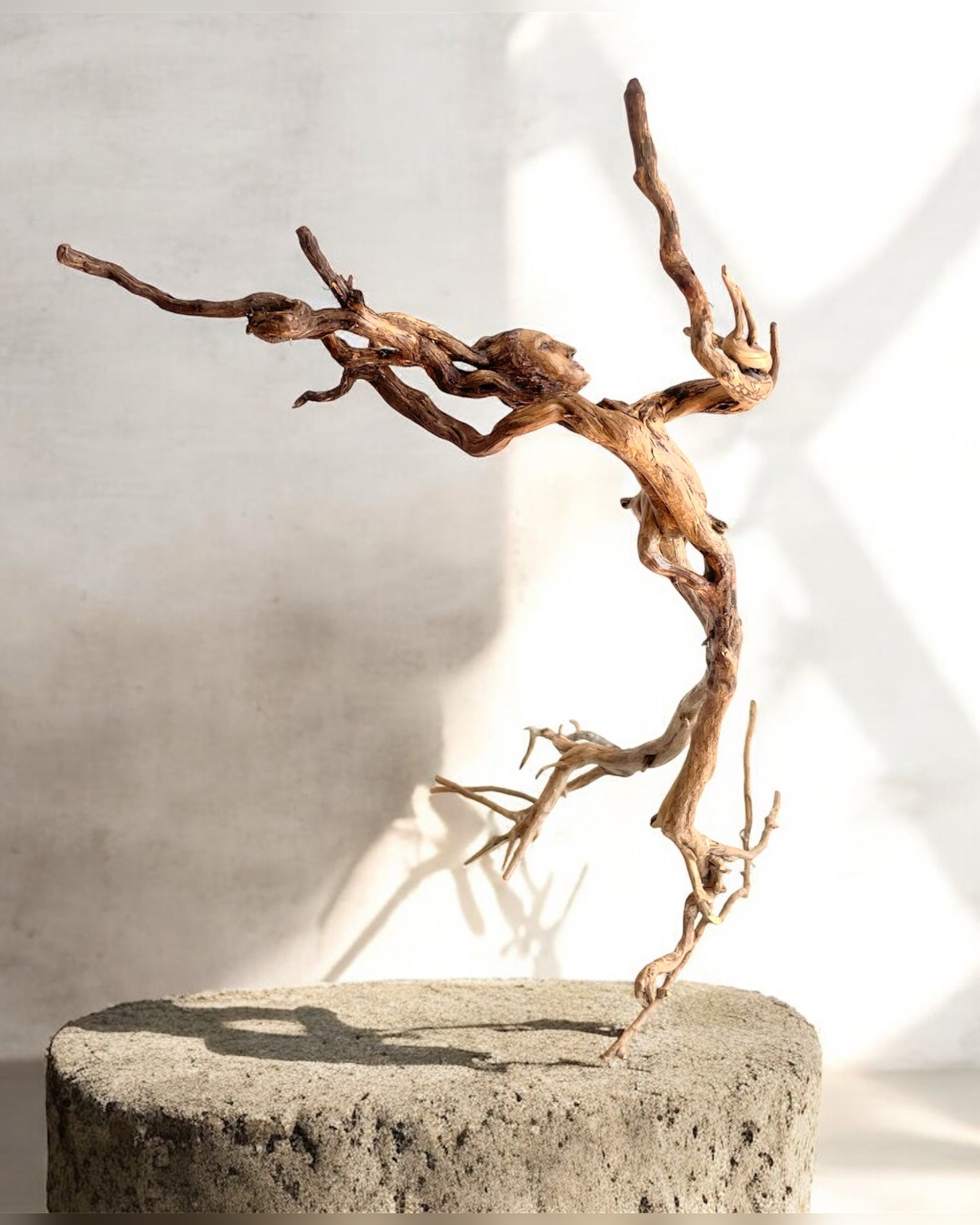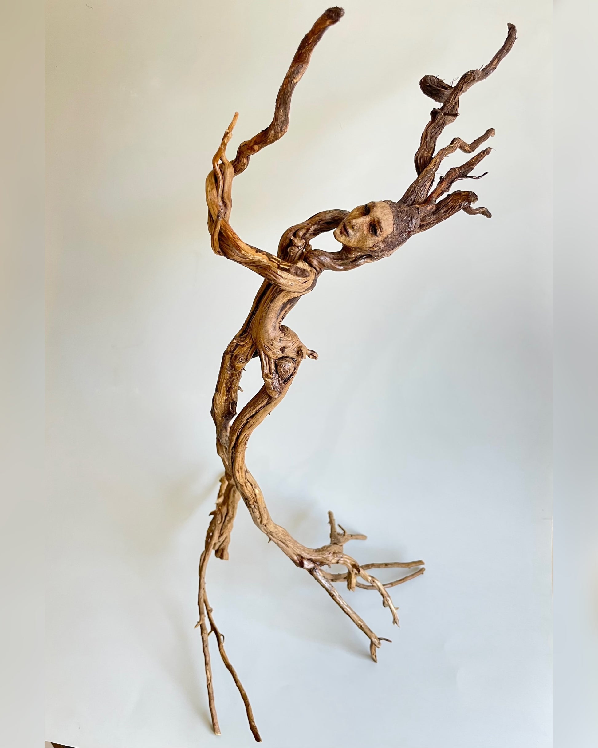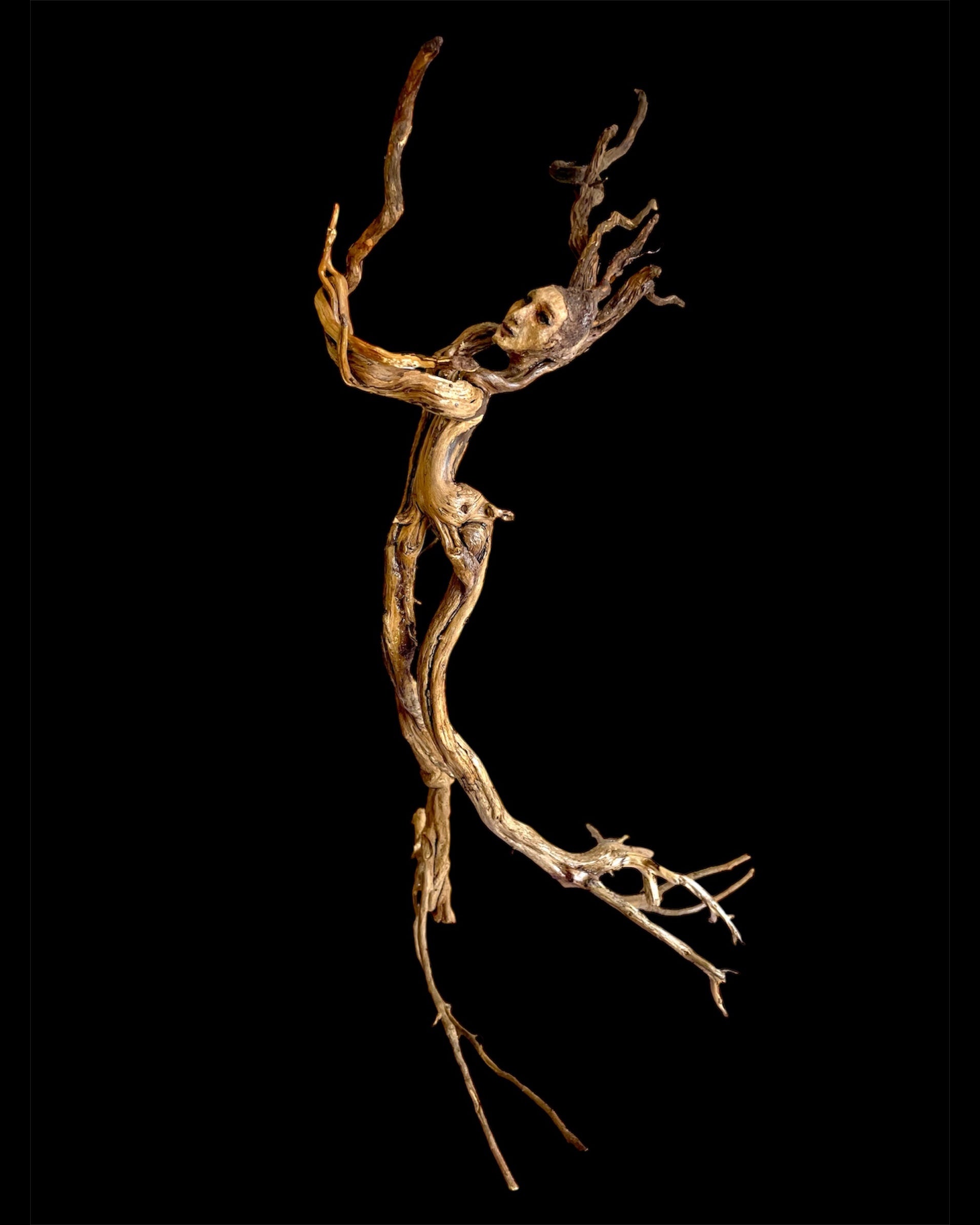 La bailarina evoca la contemplación y el movimiento, fusionando la conciencia corporal con la atención plena, permitiéndonos "ser y estar". La pieza, a través de su material, transmite tanto fragilidad como fortaleza, reflejando el delicado equilibrio entre la vulnerabilidad y la confianza en el proceso de fe. Su intención es inspirar una conexión profunda, recordándonos que cada paso, ya sea en la luz o en la oscuridad (como las raíces), forma parte de nuestra danza personal hacia la trascendencia. Sus curvas y formas retorcidas capturan la esencia de la gracia y el movimiento divino que experimentamos al seguir nuestro camino espiritual.