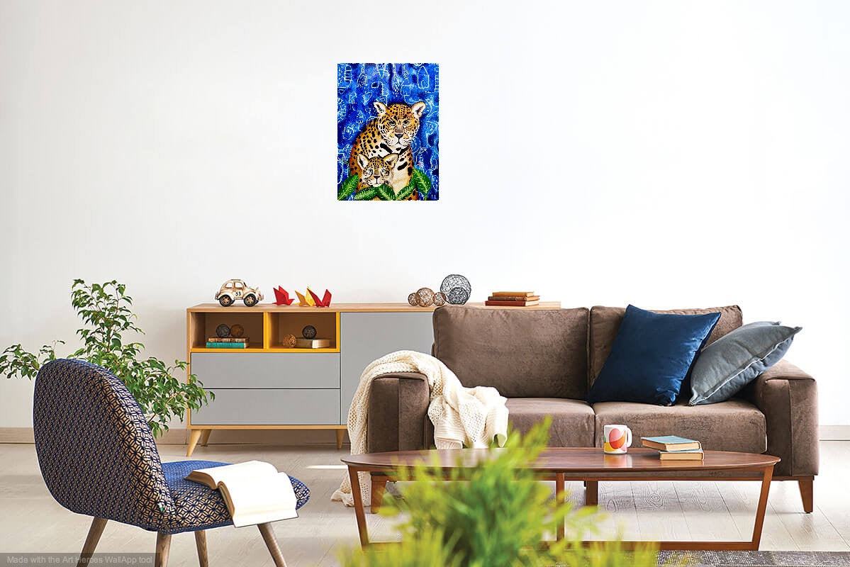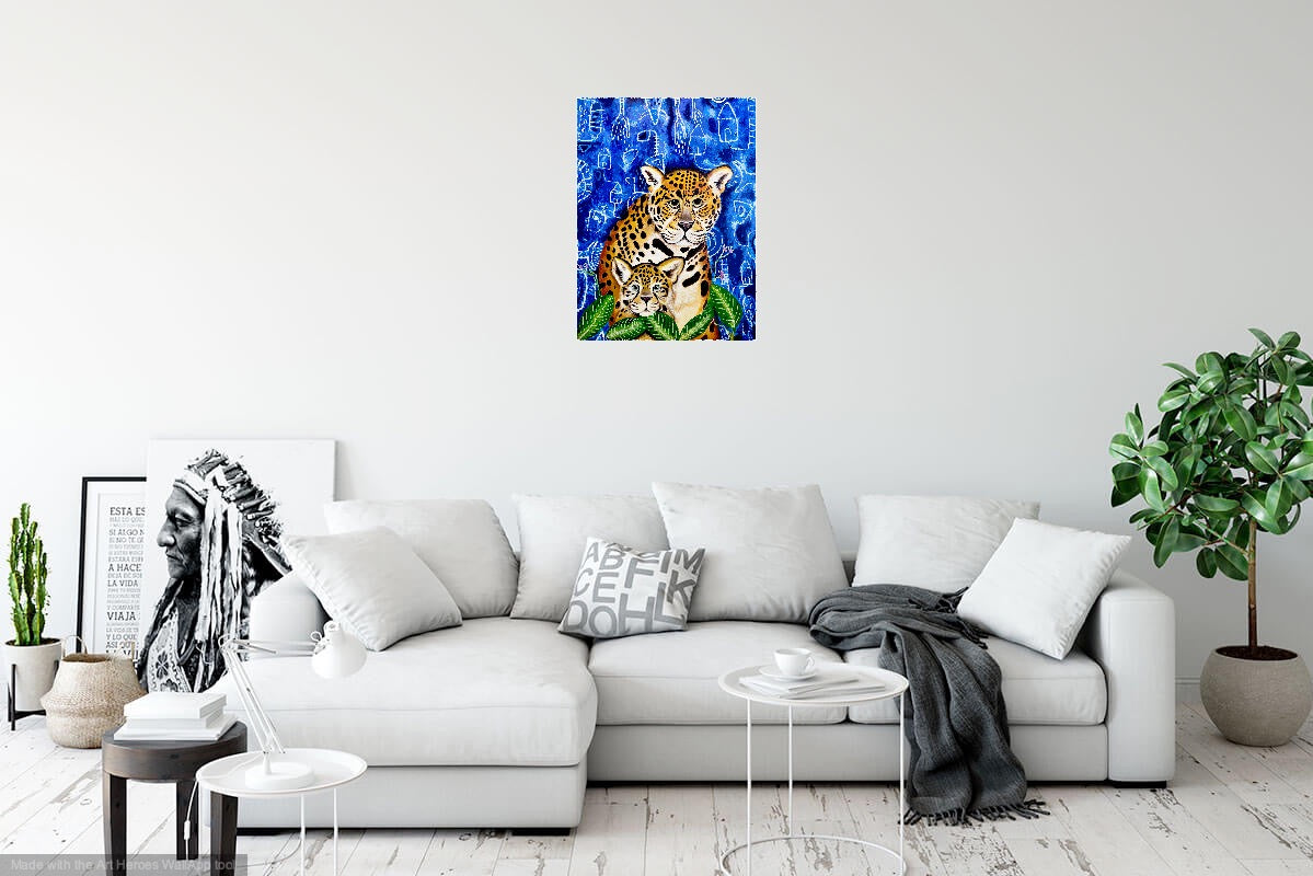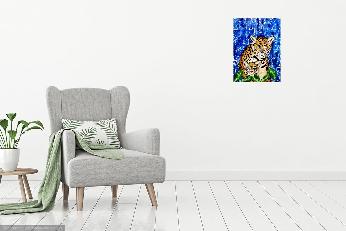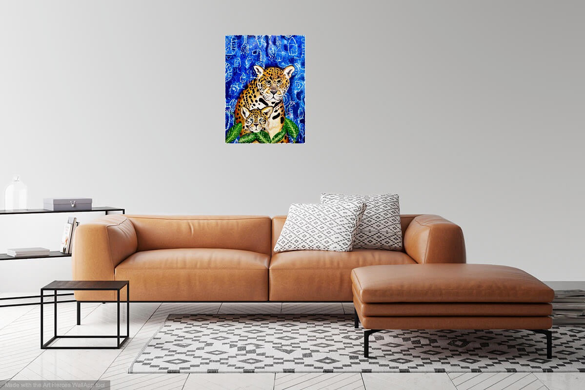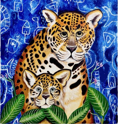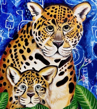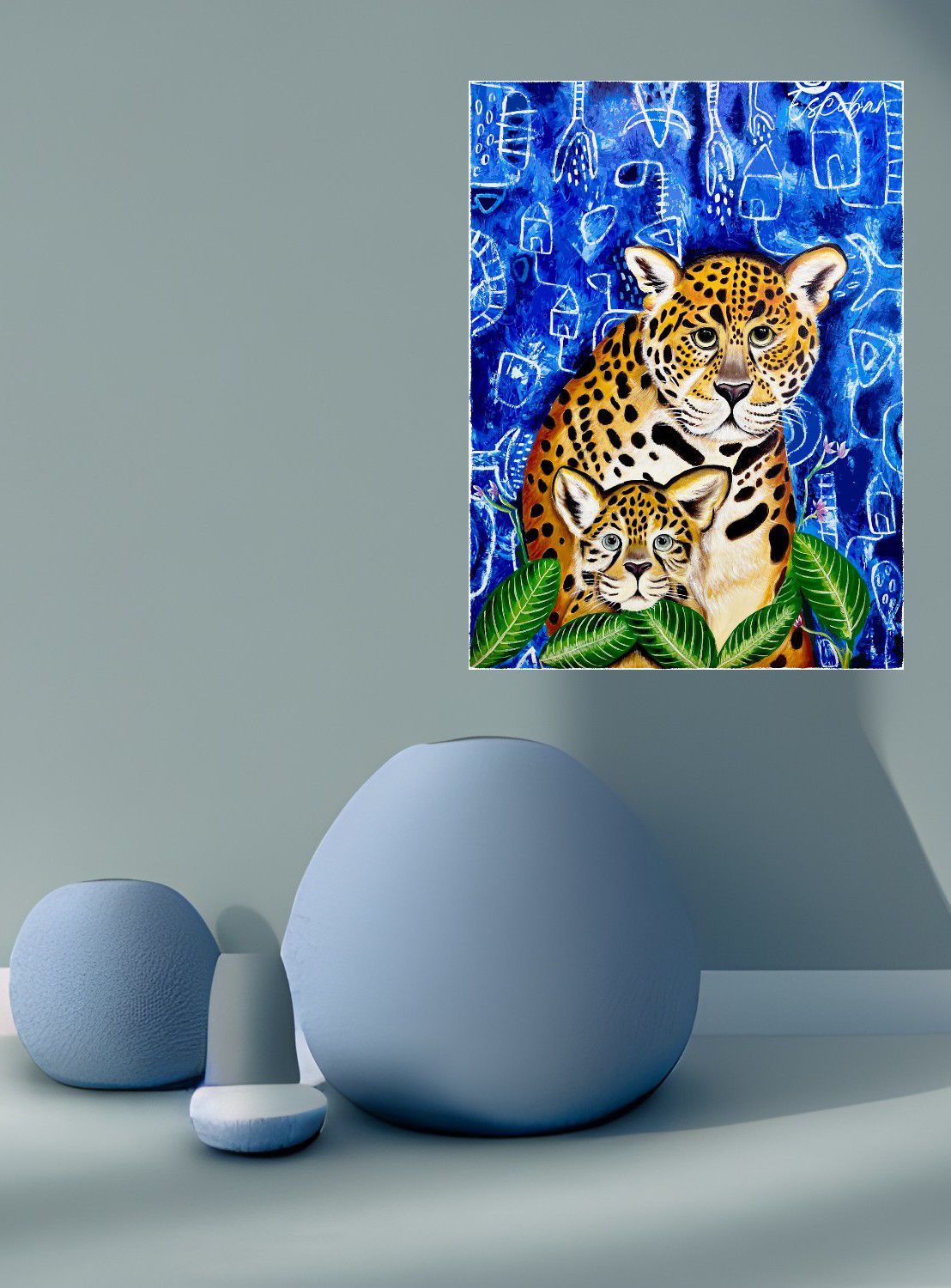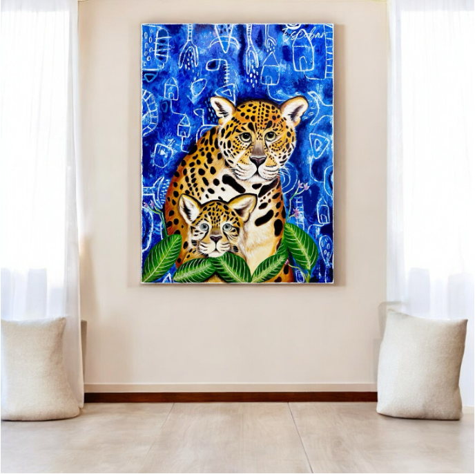 Un contraste entre la fuerza, coraje del jaguar con el amor maternal y el cuidado de su cachorro,, con un fondo que nos lleva a la imaginación.