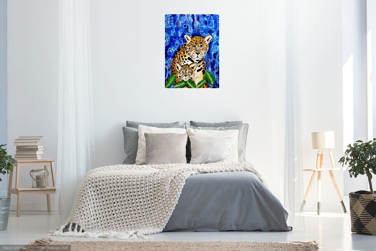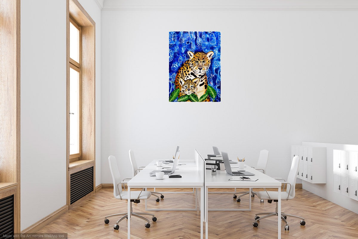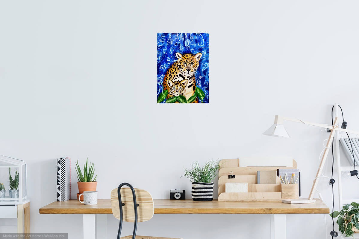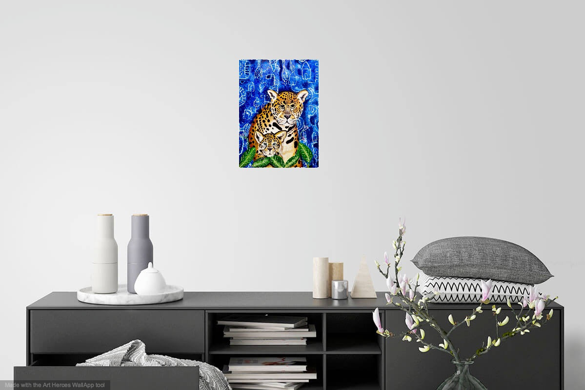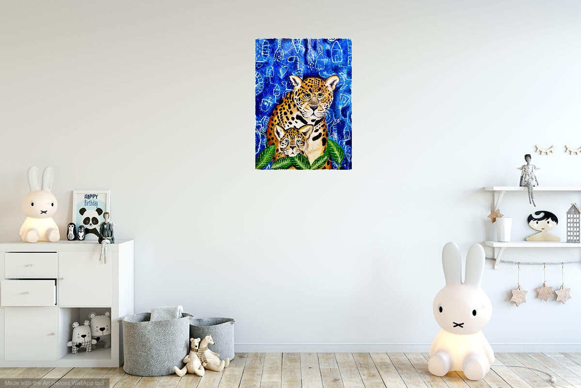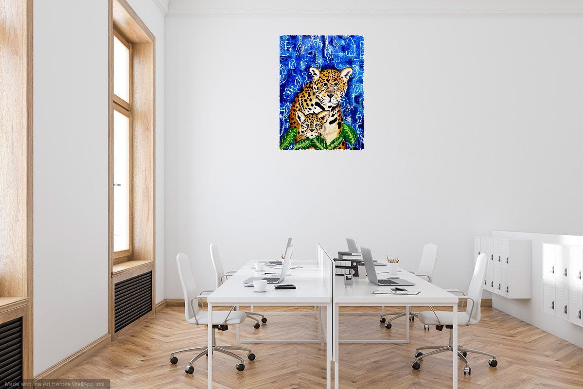Un contraste entre la fuerza, coraje del jaguar con el amor maternal y el cuidado de su cachorro,, con un fondo que nos lleva a la imaginación.