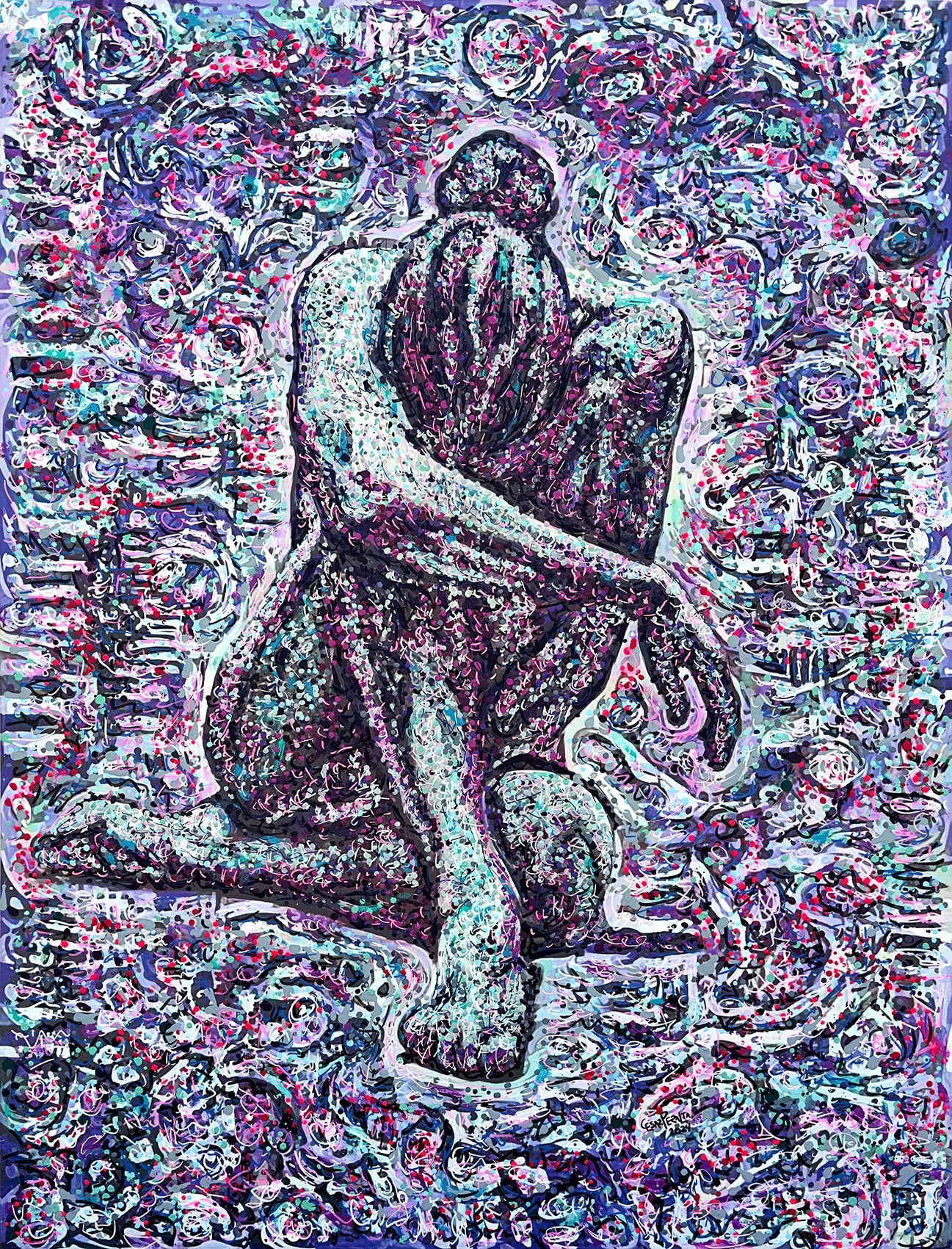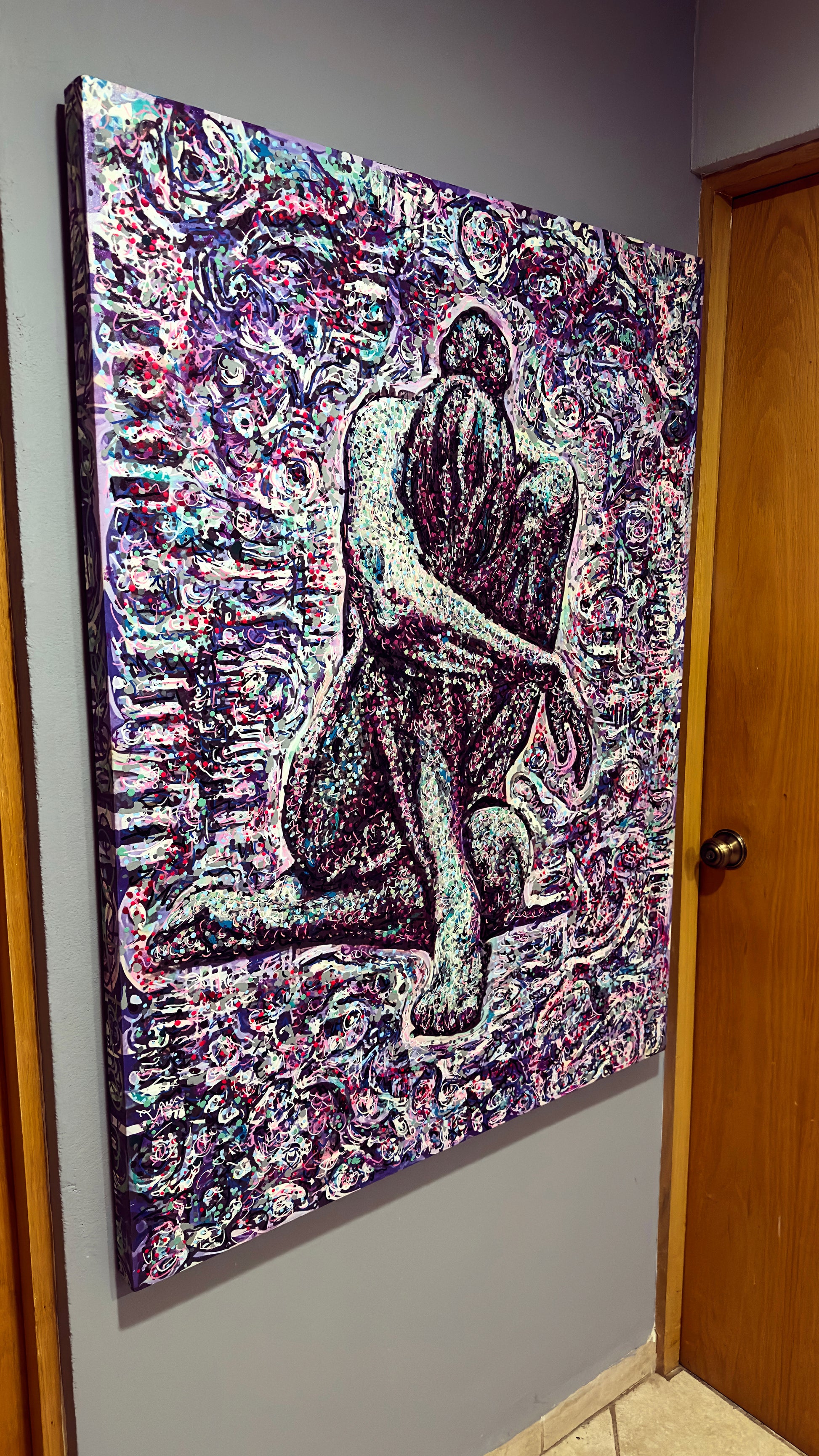 Esta obra es parte de mis trabajos de arte híbrido, una fusión de arte digital con arte tradicional, en este caso pintura. Esta obra lleva tres procesos: la ilustración digital impresa sobre lienzo, la cual despues se monta sobre bastidor de madera y me la llevo a mi taller donde hago la intervención con pintura acrílica. Finalmente realizo una animación digital la cual puedes ver a través de tu telefono o tablet como realidad aumentada.