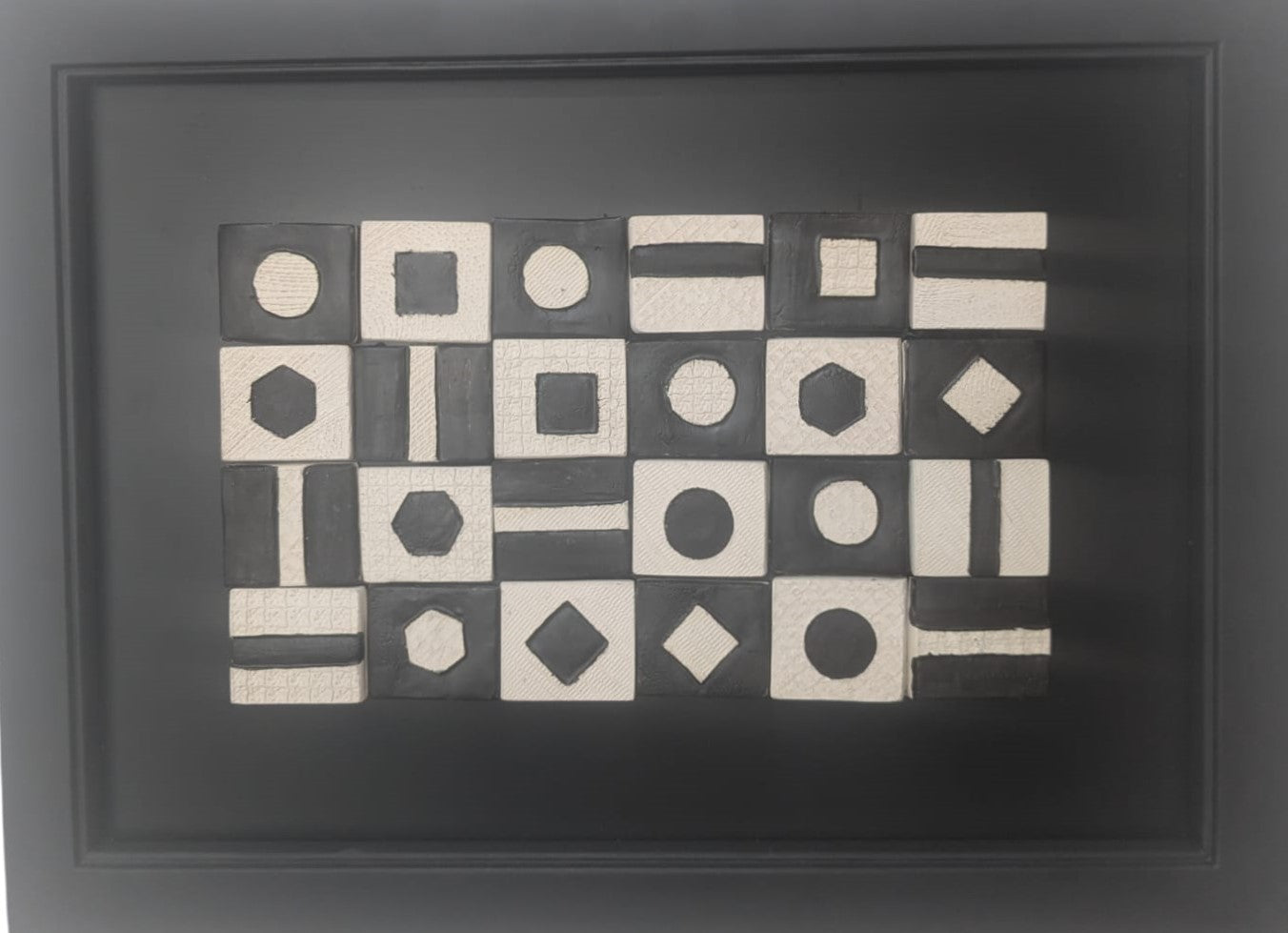 Jugando con Blanco y Negro, obra que invita a al delicado equilibrio entre el blanco y el negro. Compuesta por pequeños mosaicos con texturas variadas, cada pieza se convierte en un universo de formas —cuadrados, círculos, franjas verticales y horizontales, y hexágonos— que interactúan y dialogan entre sí, creando un ritmo visual dinámico. La combinación de formas geométricas, dispuestas en un juego de contrastes, genera un sentido de movimiento y orden.