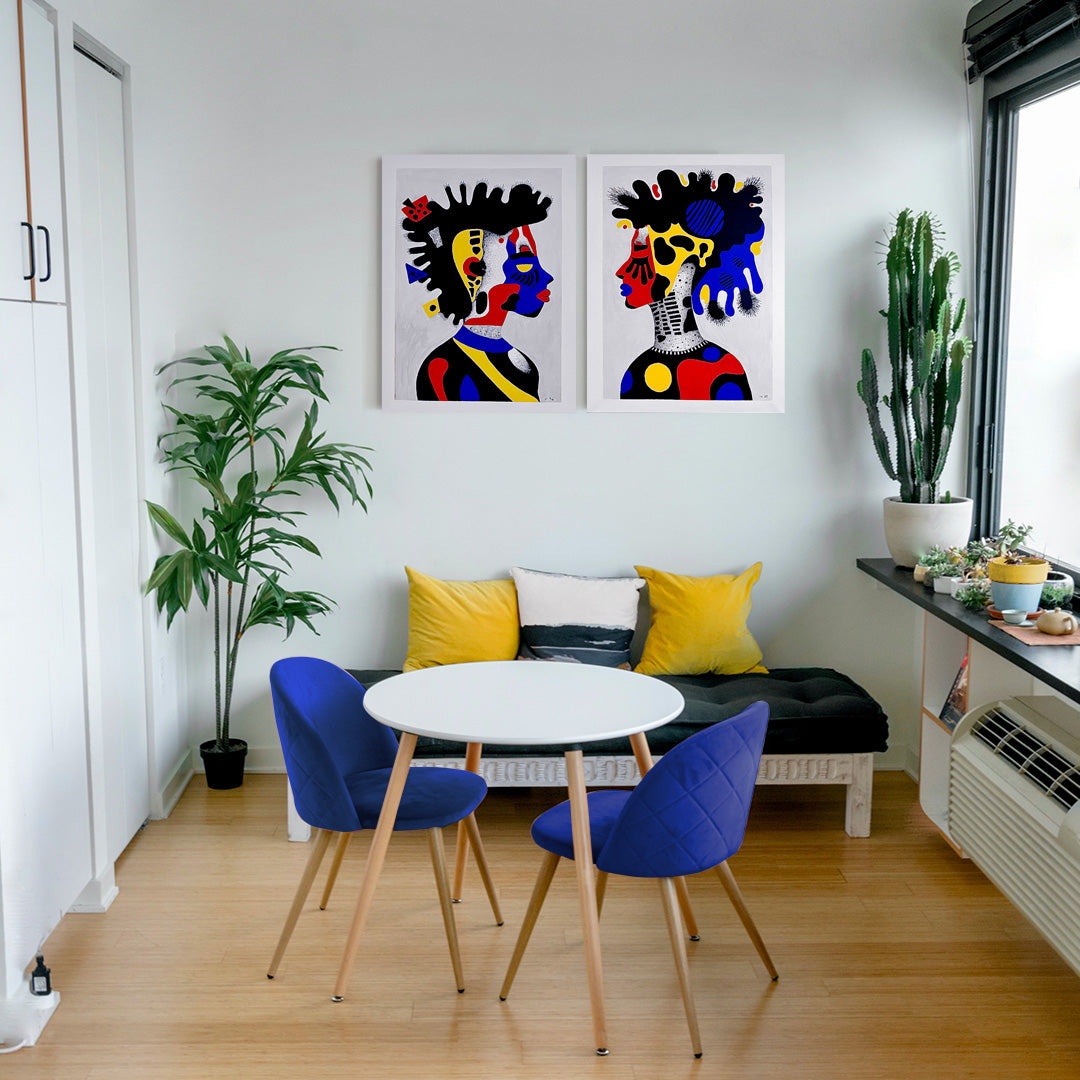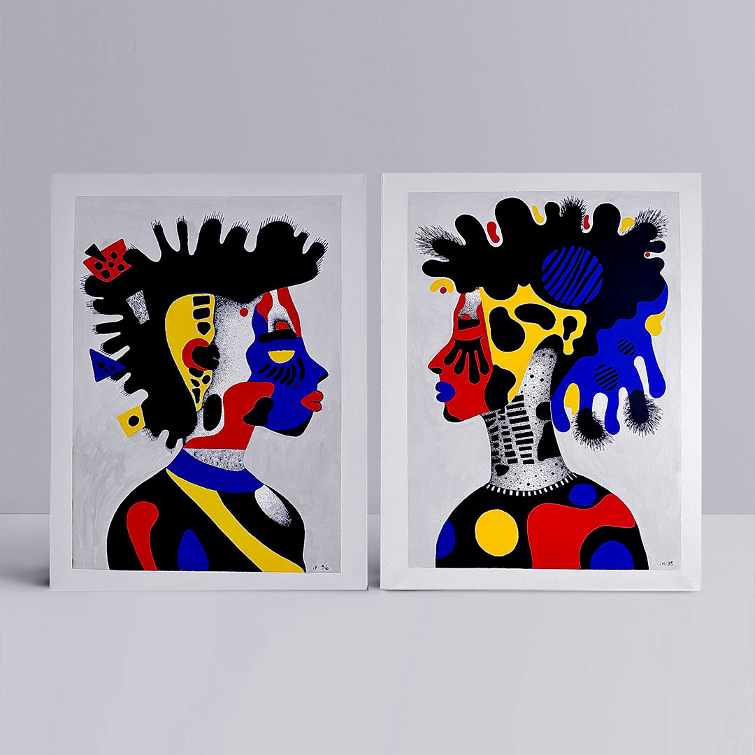 Celebra la conexión humana con un vibrante color block. Los dos perfiles idénticos, llenos de patrones y colores primarios (azul, rojo, amarillo), crean un diálogo visual de unidad y diversidad en un estilo moderno y dinámico.