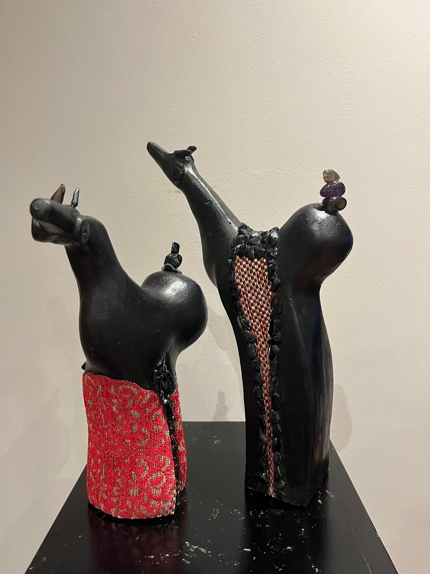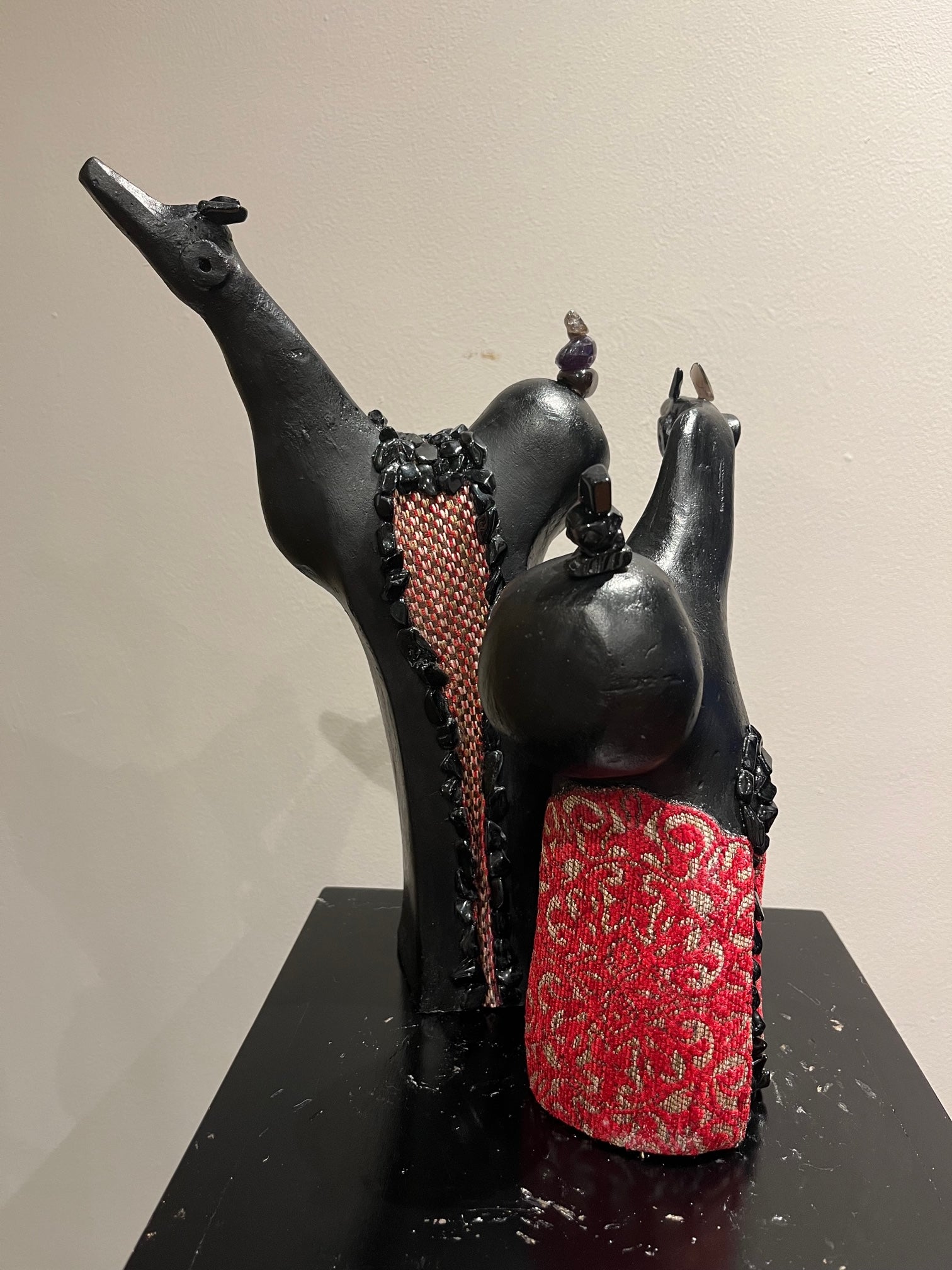 Cemento y arena, intervenidos con acrílico y piedras semipreciosas de cuarzo negro y tela.