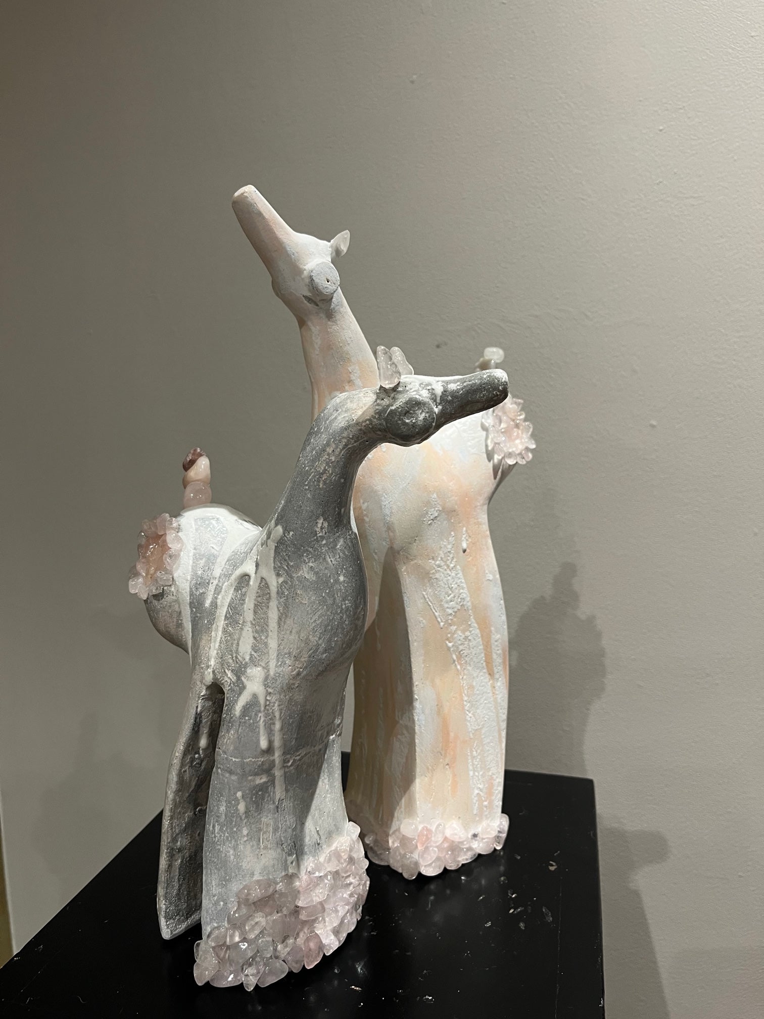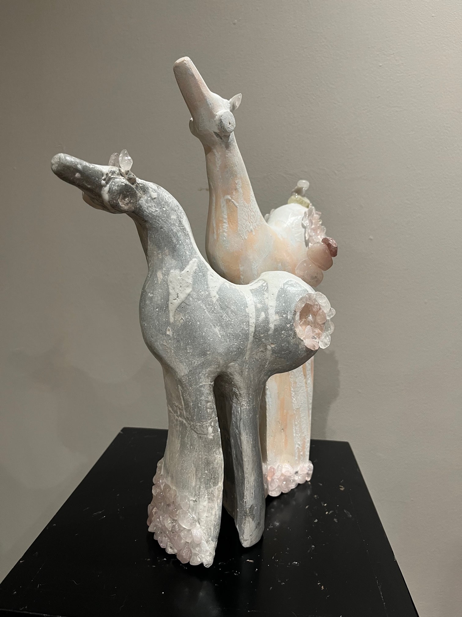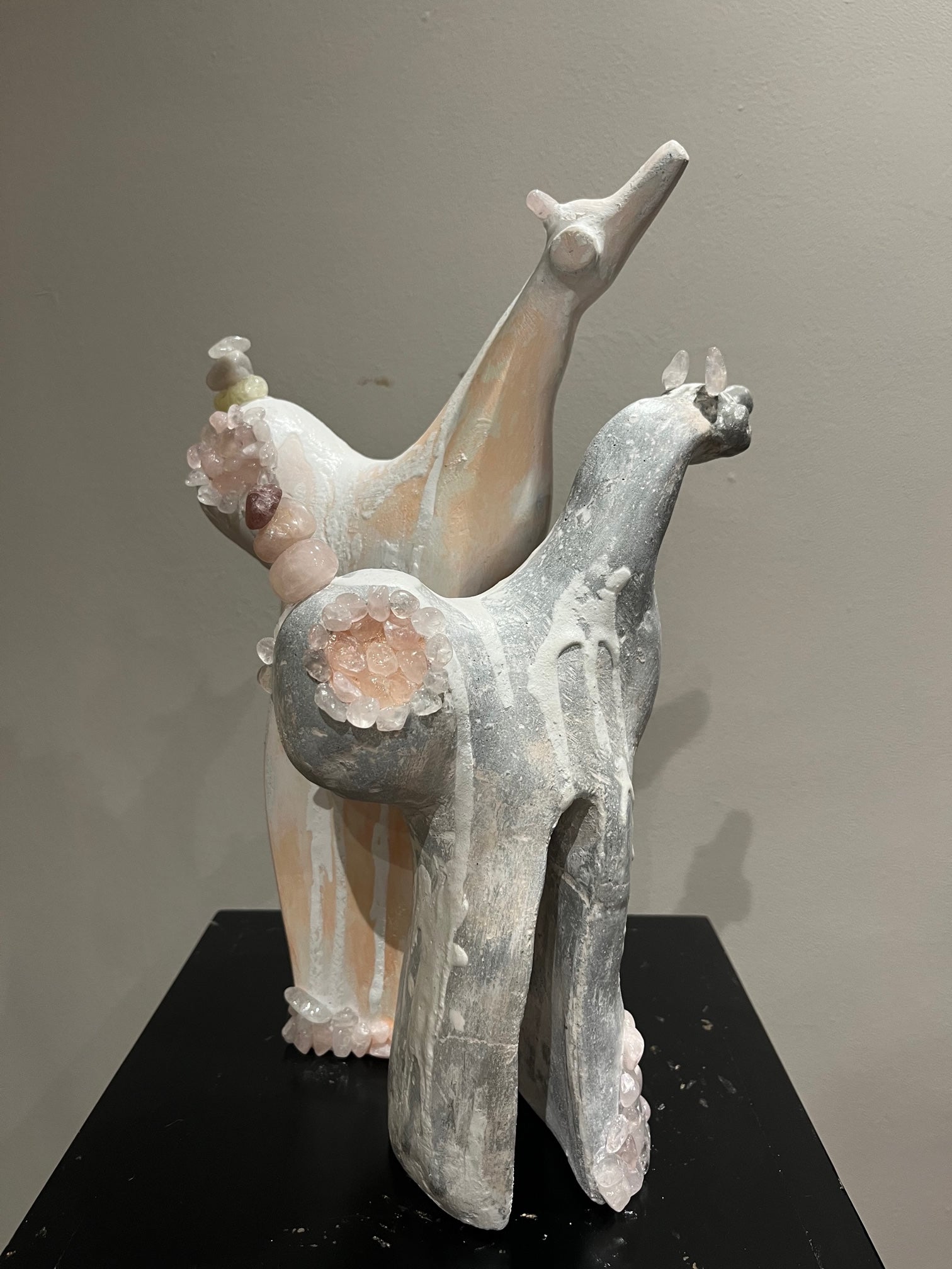 Cemento y arena, intervenidos con acrílico, yeso y piedras semipreciosas de cuarzo rosado.