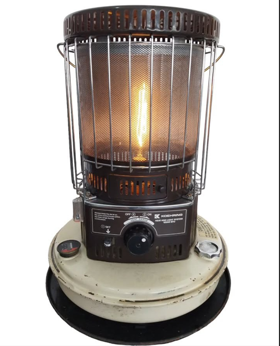 Esta lámpara-escultura es una intervención artística sobre un sistema de calefacción e iluminación portátil de la marca Koehring (1965), originalmente diseñado para resistir condiciones extremas en contextos industriales. Fabricado con metales resistentes y tecnología funcional, este objeto formó parte del equipamiento esencial de otra época.