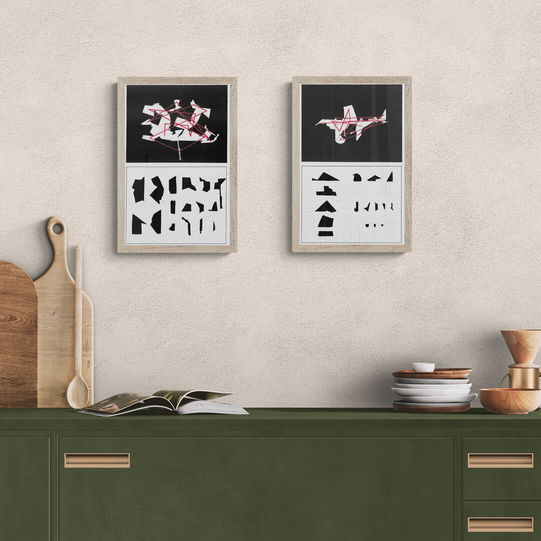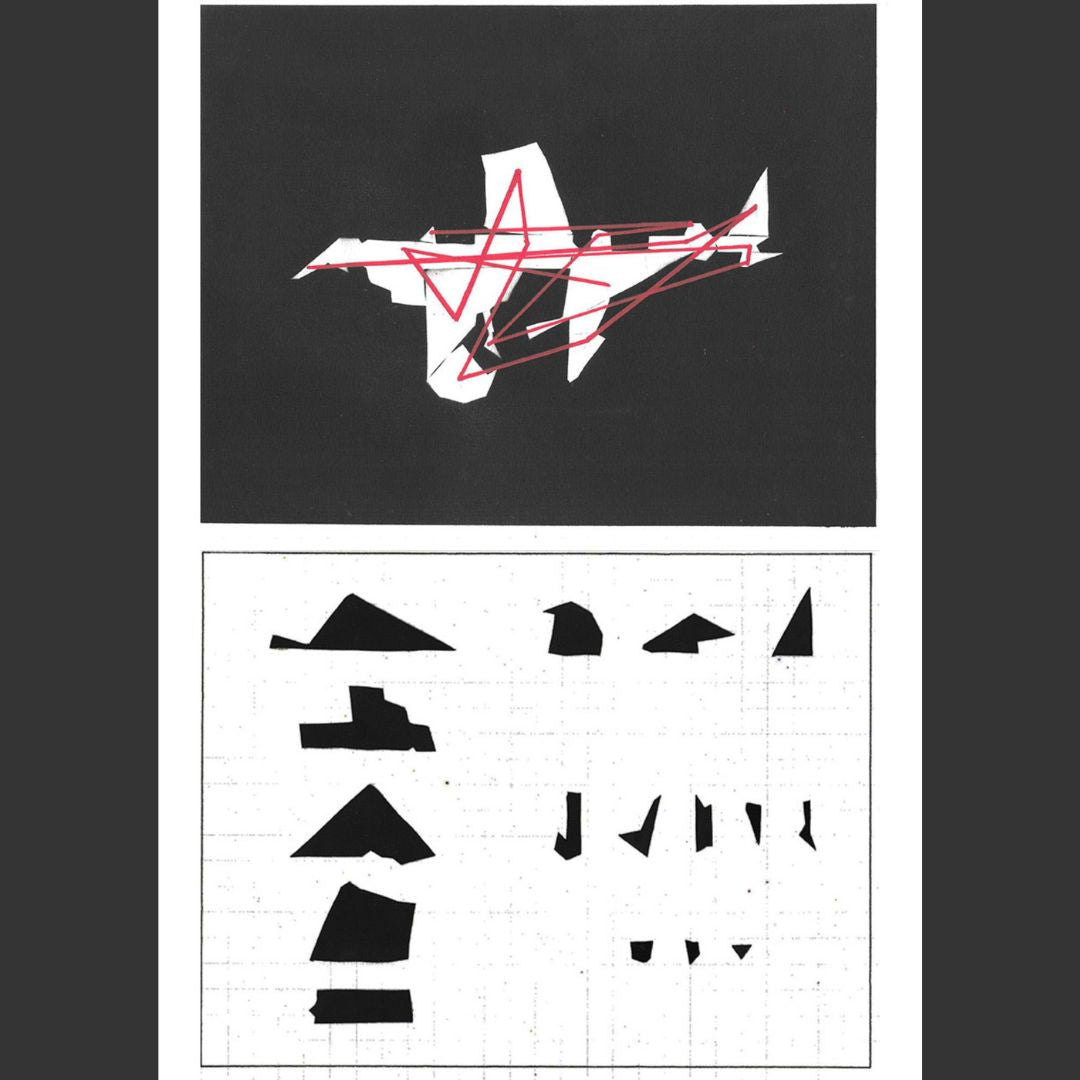 Después, partiendo de este orden, los fragmentos fueron unidos en las composiciones mediante una línea roja que seguía el criterio de clasificación previa. Esto dio como resultado un tipo imprevisto de visualidad en las composiciones iniciales.