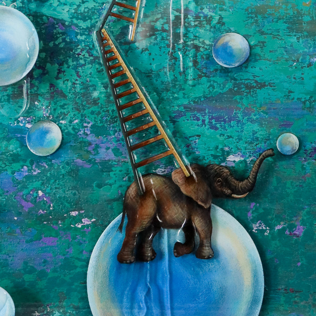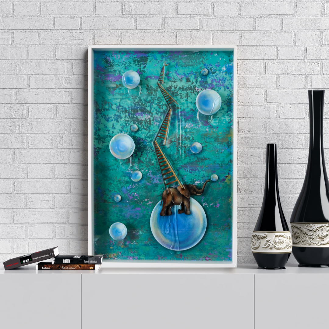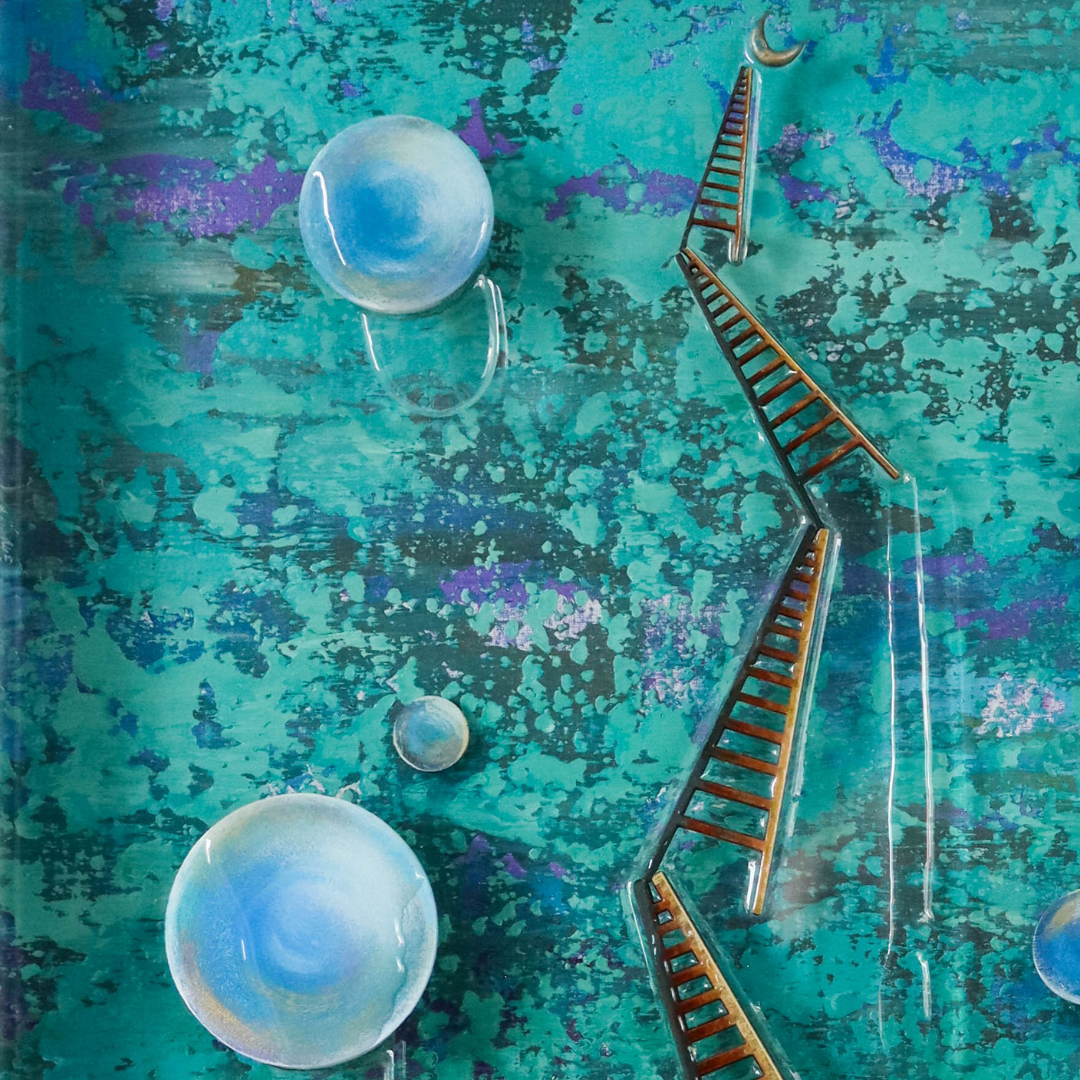 Es una pieza de técnica mixta con acrílico y óleo sobre tela en el fondo y dos capas más de placa acrílica transparente que dan profundidad y movimiento a la obra. Tiene toques tridimensionales que dan volumen como las escaleras y las esferas y detalles con resina epóxica transparente que aportan brillo. Está enmarcada en color blanco y protegida con vidrio.