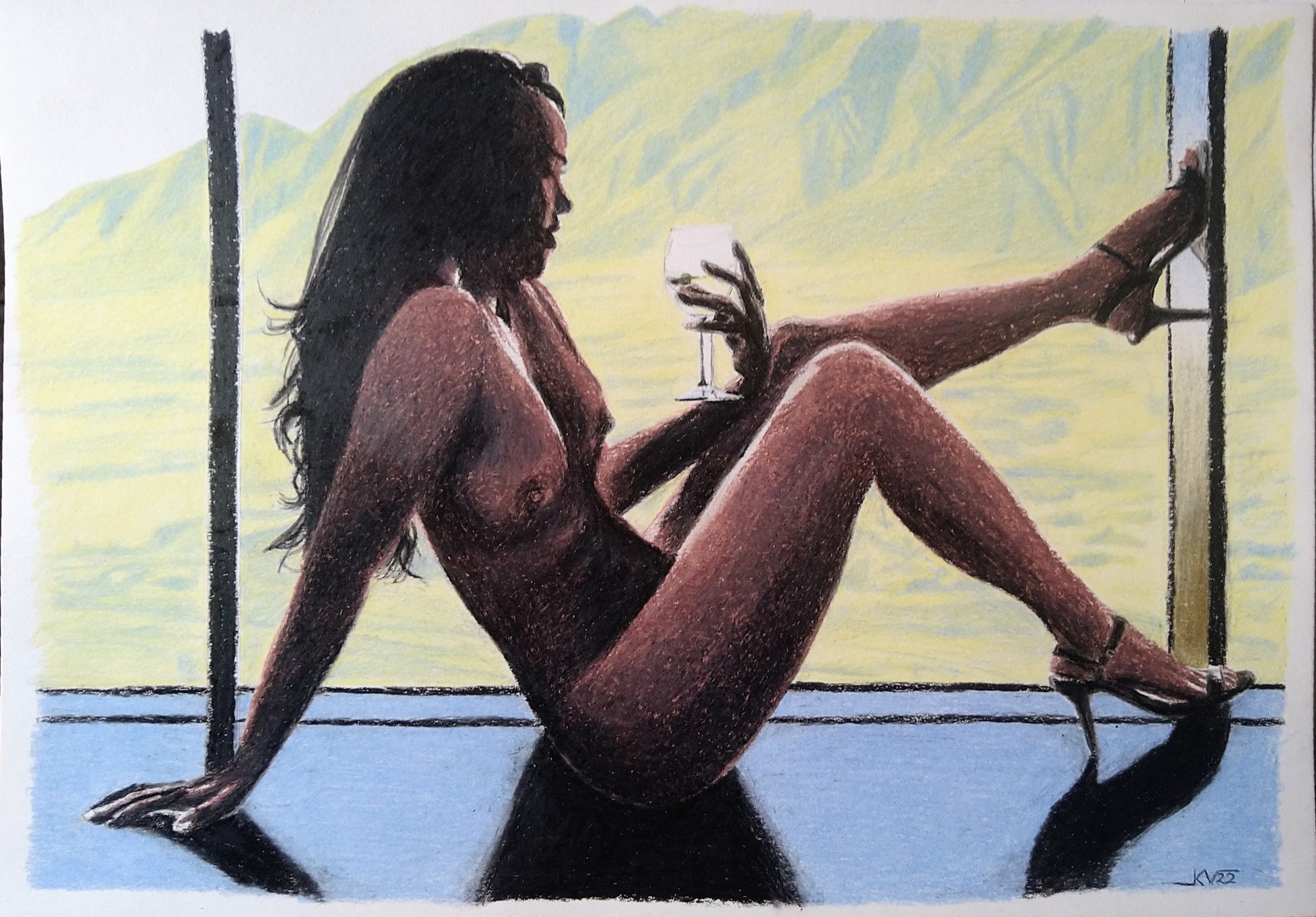 Perfil de modelo al desnudo hecho con colores pastel tipo crayola, prismacolors y carboncillo sobre papel.