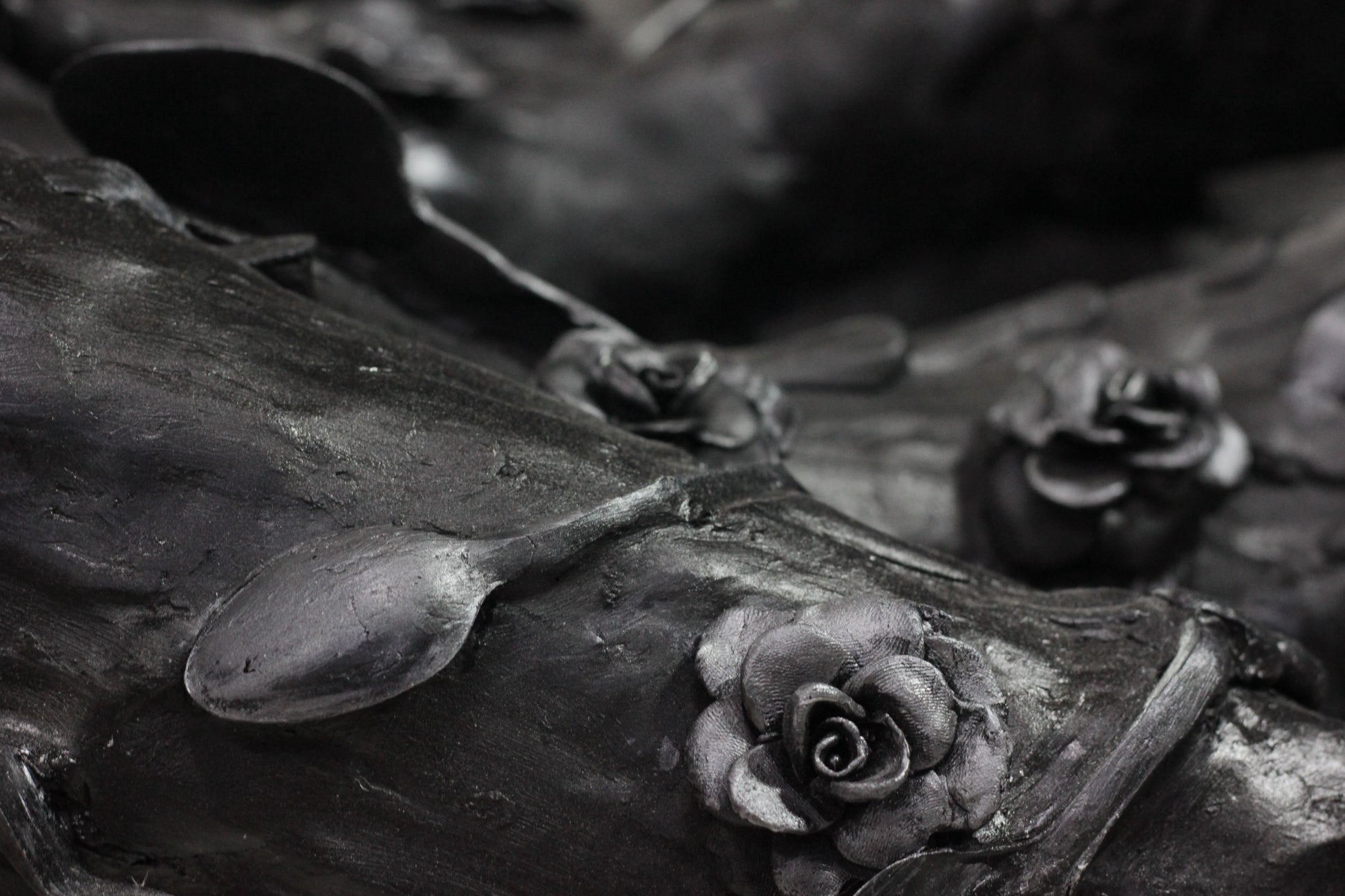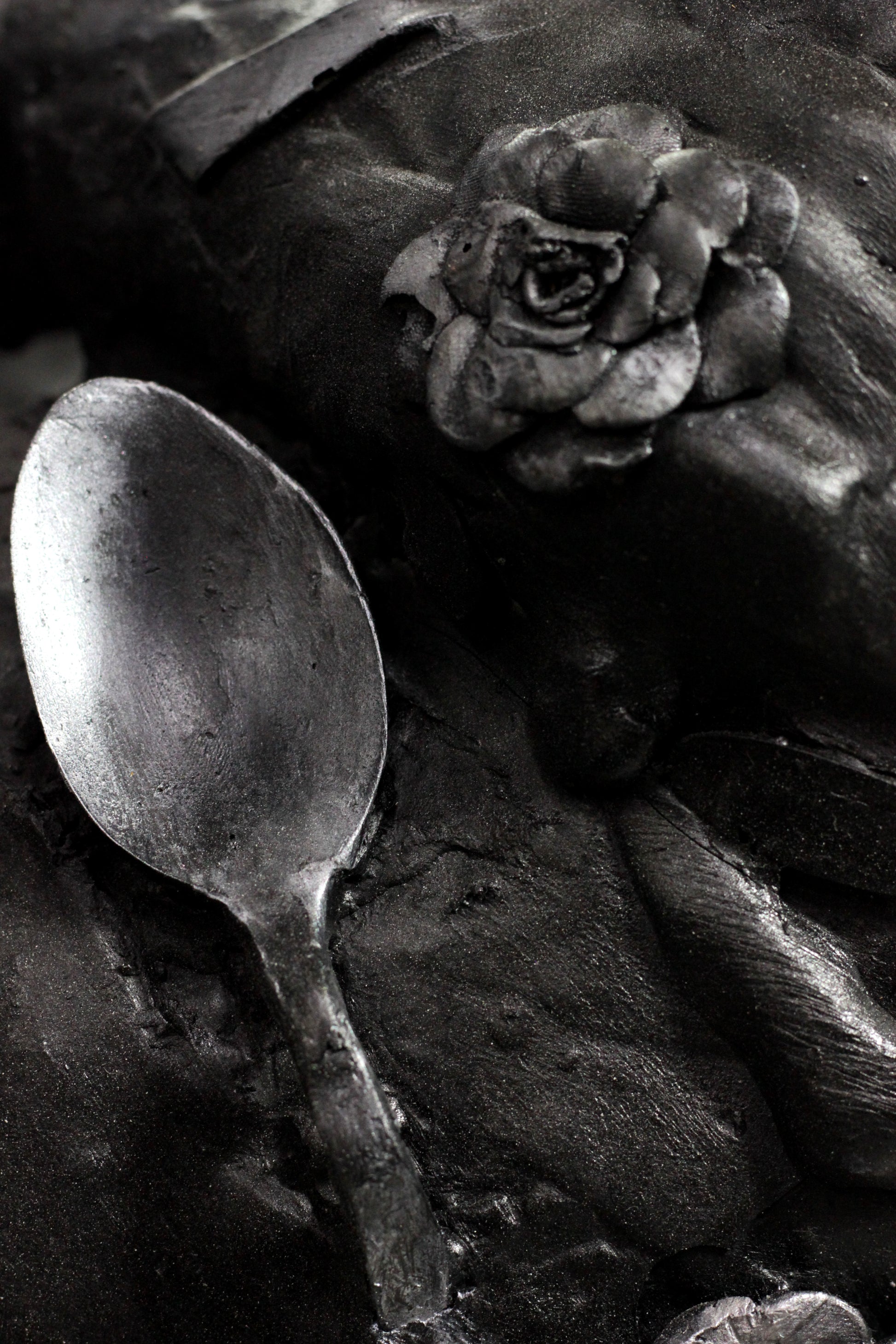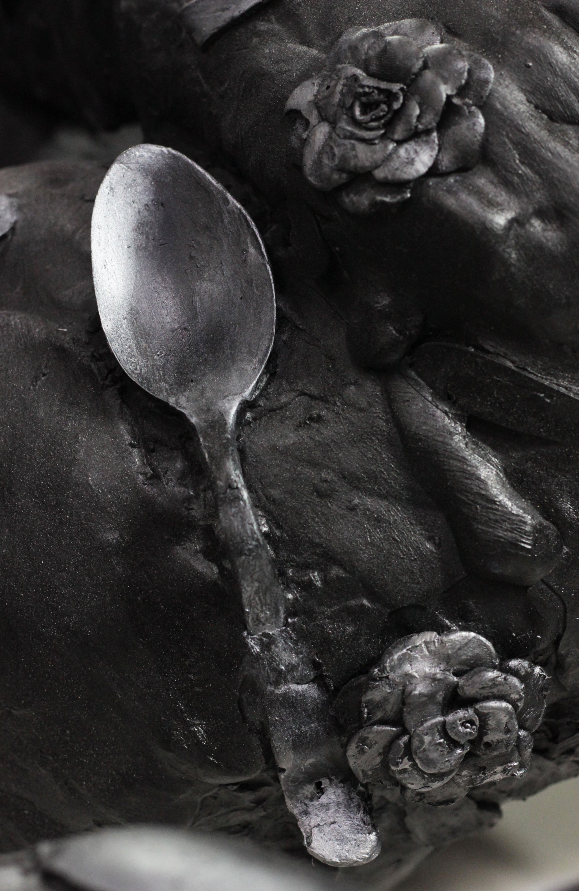 Esta sensación de vacío es representada con esta escultura elaborada con cucharas que forman un cuerpo derretido con un hueco al centro. Al experimentar la muerte de mi abuela, me sentí como si una cuchara gigante hubiera entrado por mi vientre y se hubiera llevado de mis entrañas hasta mi garganta, sin anestesia.