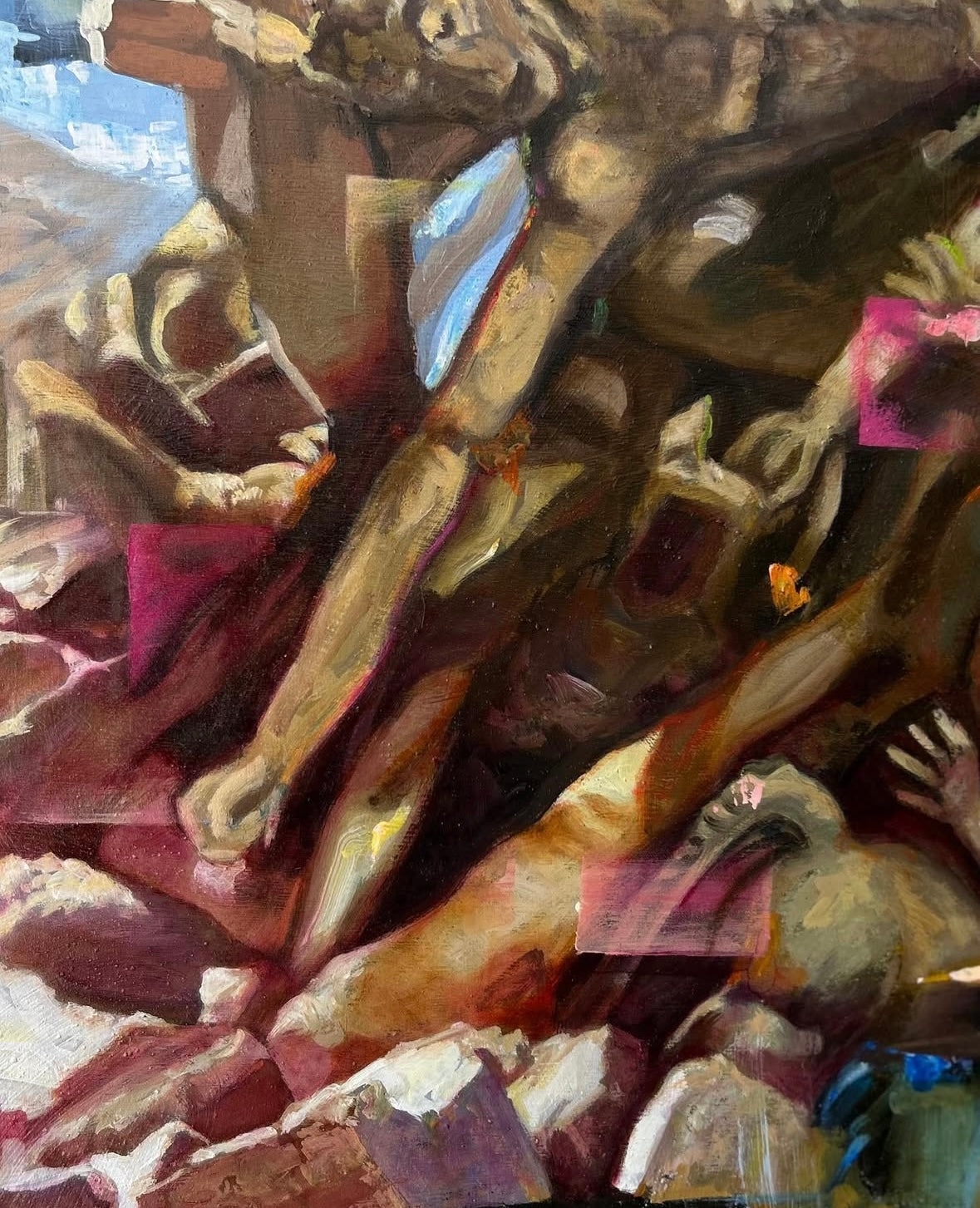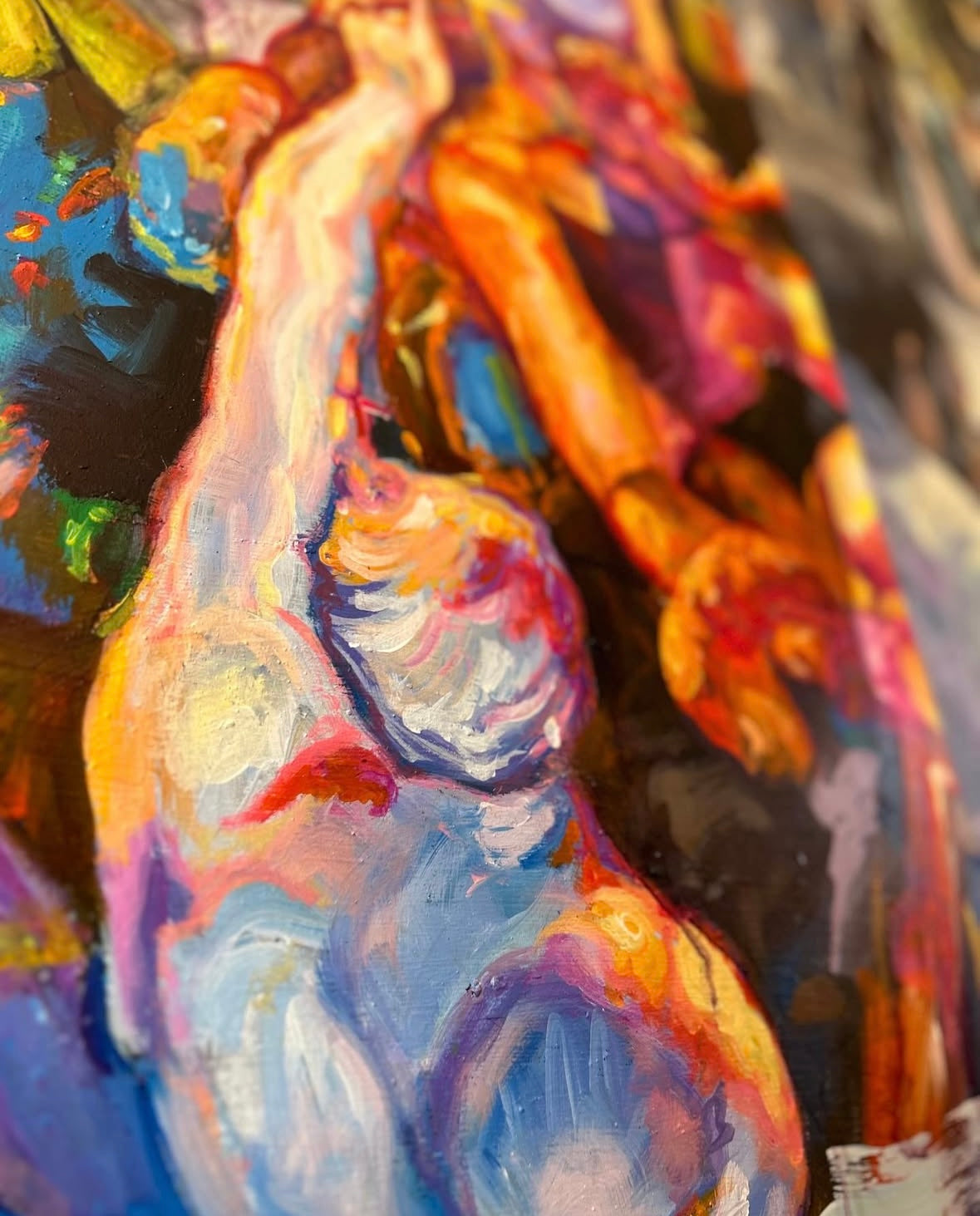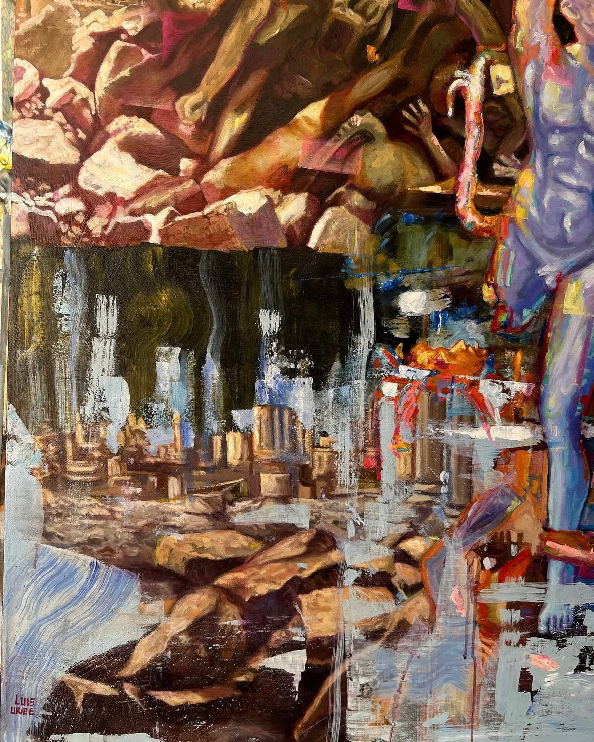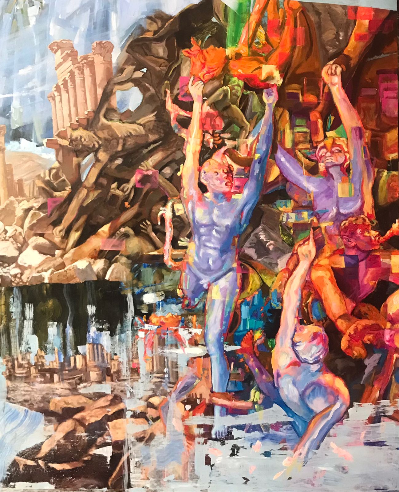 “La danza de las Sílfides surge de un caos primigenio, donde figuras etéreas de cuerpos luminosos ascienden en un éxtasis de luz y color. Entre ruinas clásicas y aguas que reflejan un cielo fragmentado, las Sílfides giran y se elevan, tocando lo sagrado en un instante suspendido. Una coreografía mística donde la esperanza y el deseo se funden con el polvo de la historia.”