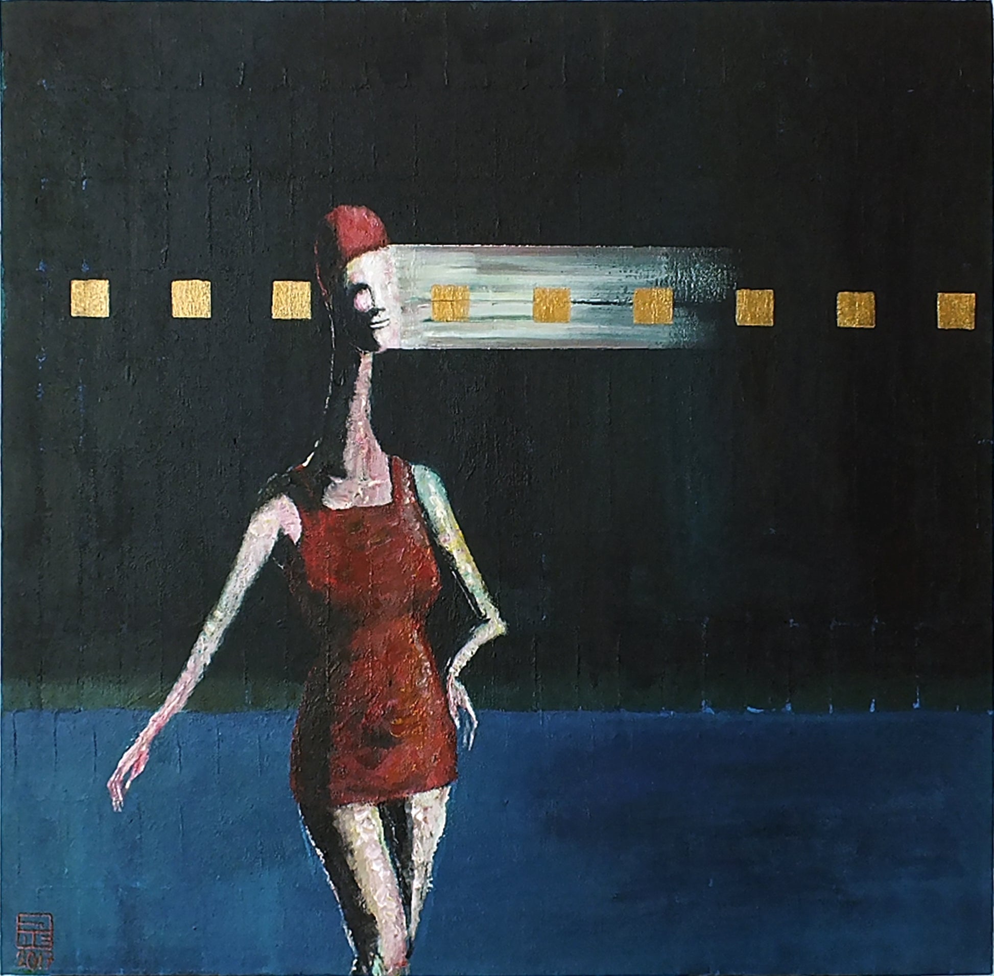 Una extraña mujer ataviada con un traje de baño de otra época; siempre me han atraído esas fotos de mujeres con ese tipo de trajes de baño, me transportan a un “belle epoque”. Yo veía fotos de mi madre, abuelas y tías en Acapulco usando bañadores similares. Ella es una mujer paranormal, bañándose en un mar de noche, materializándose o desintegrándose, la presencia áurica también está, emulando esa época dorada que se ha perdido.