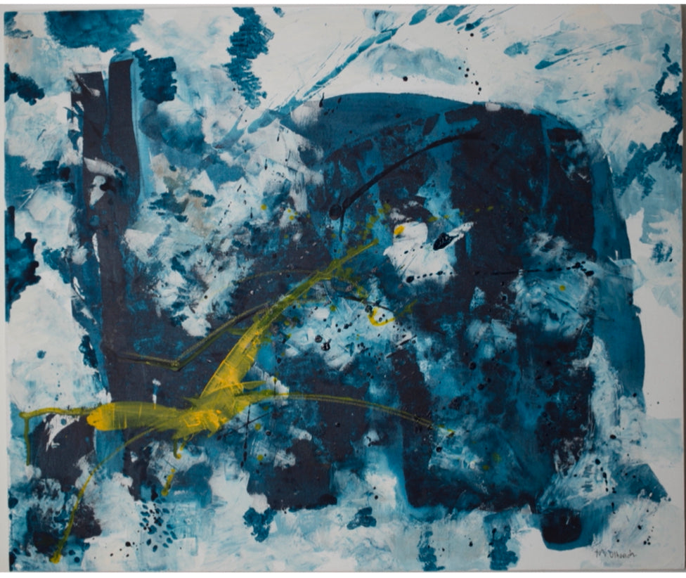 Esta es una obra que hice con mucha textura y trazos con mucho movimiento, contraste entre azul y blanco y el color amarillo que define la forma de un ave , de ahí su nombre , está obra me recuerda los vuelos de las gaviotas sobre el mar.