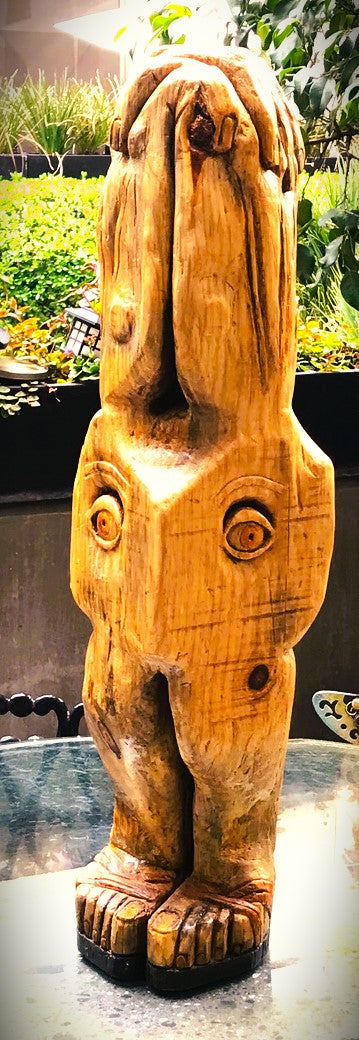 LA HUMANIDAD TALLA EN MADERA, UN SER CON HUARACHES SUELA DE LLANTA QUE TIENE CUATRO CARAS SEGÚN LA POSICIÓN ESCOGIDA. LAS CARAS DE LA HUMANIDAD QUE SE DESPLAZA. TALLA EN MADERA 94X22X21CM PARA COLOCAR TAMBIÉN EN LAS ESQUINAS DE LA ESCALERA. INSPIRADORA ESCULTURA, LA FUERZA EN MANOS Y PIES