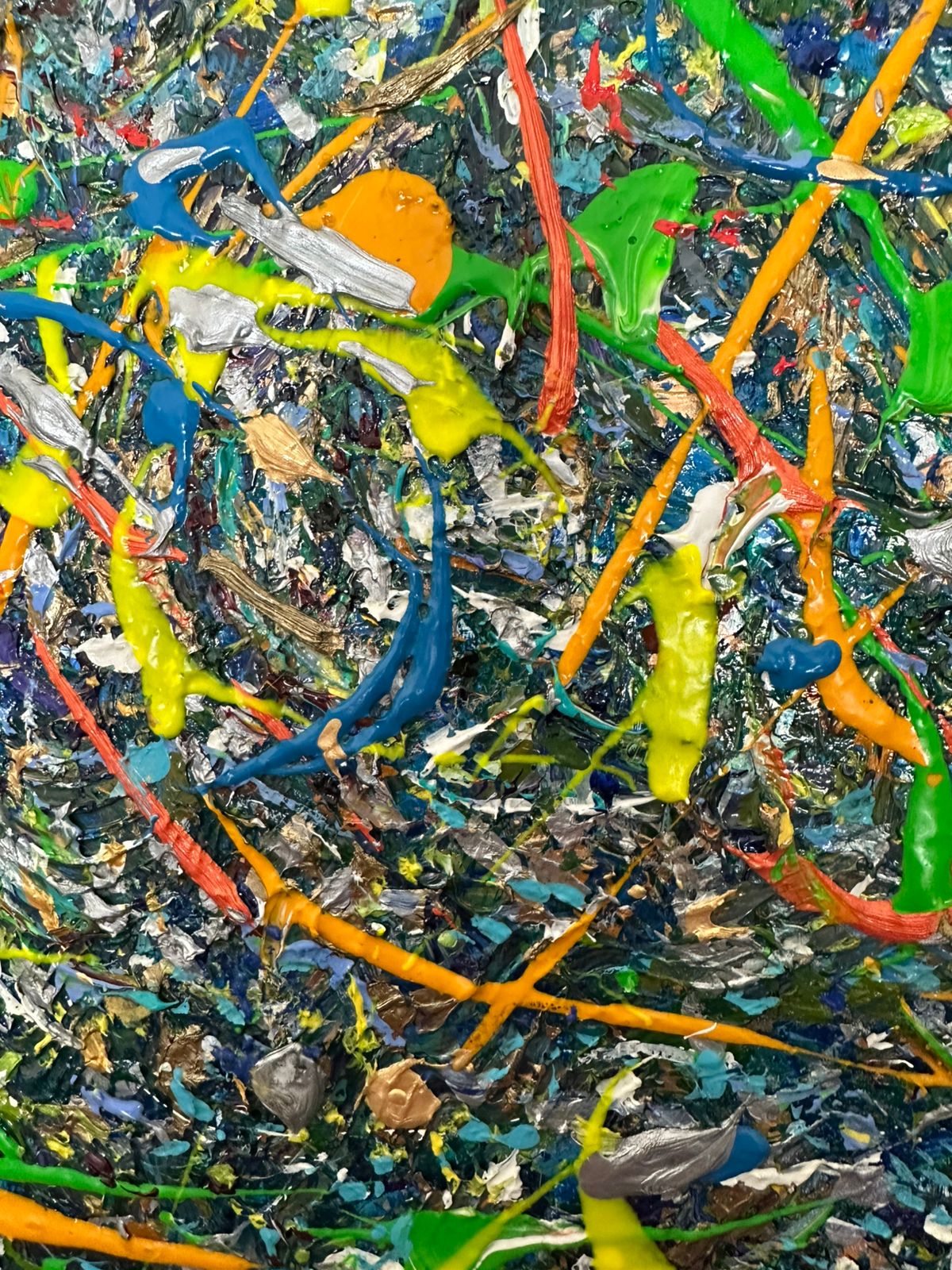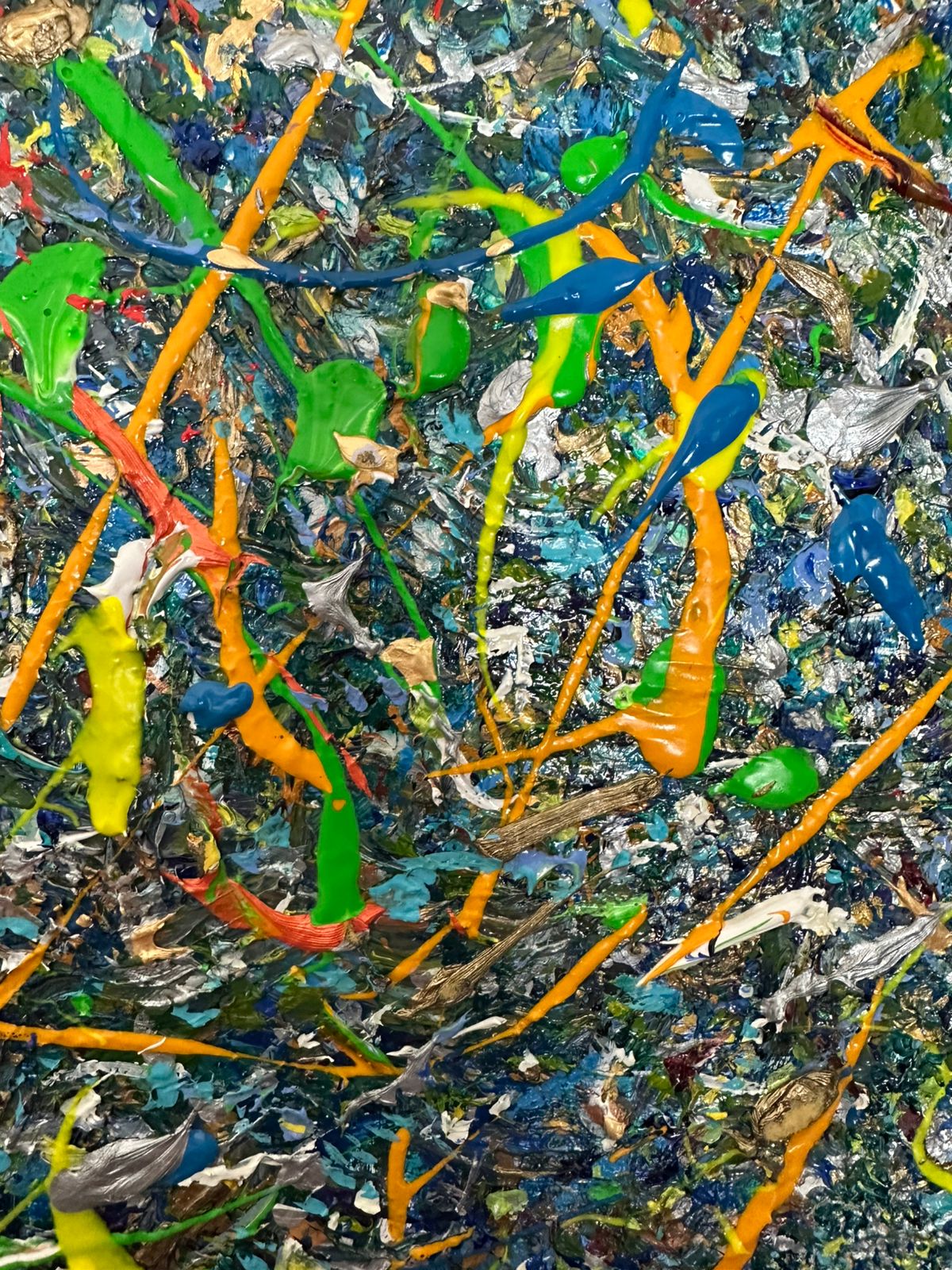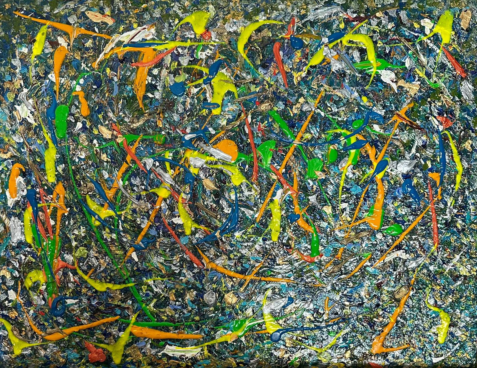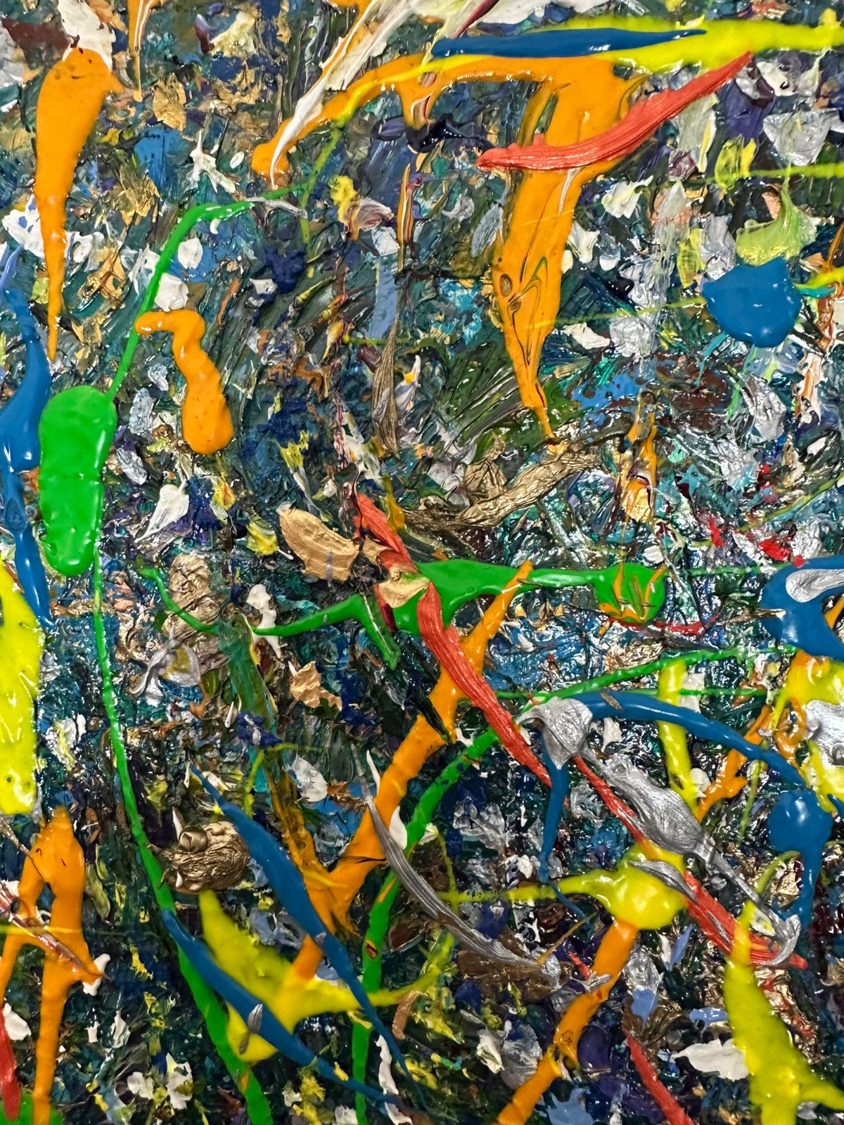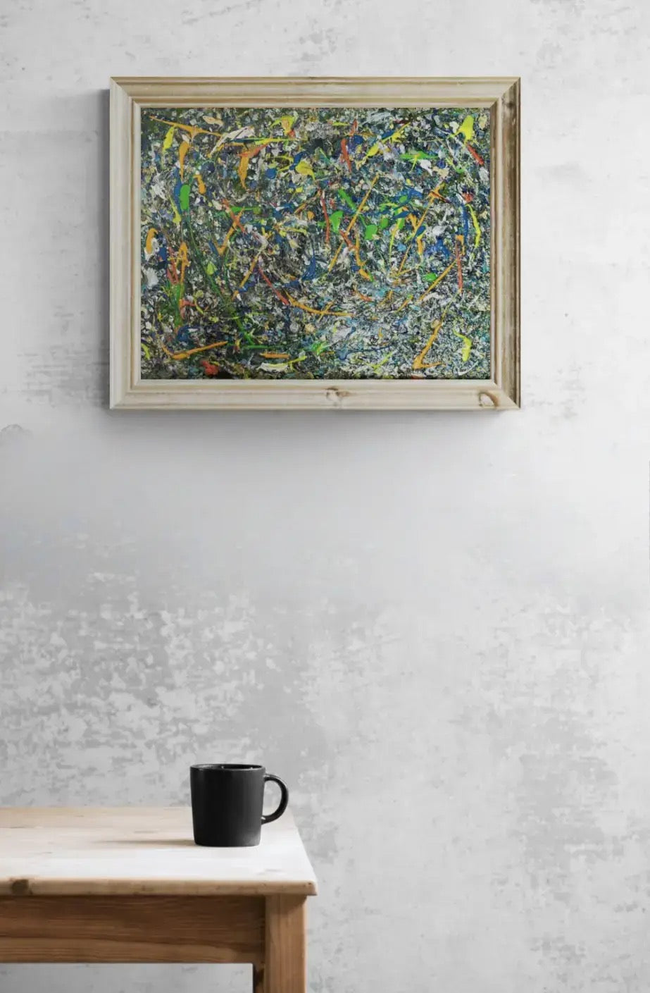 Me imagino entrando a una jungla con vegetación tupida y el sol radiante. Esta obra cuenta con dos capas de aislamiento y dos de barniz de polímeros de la marca Golden. Trabajo garantizado de por vida.