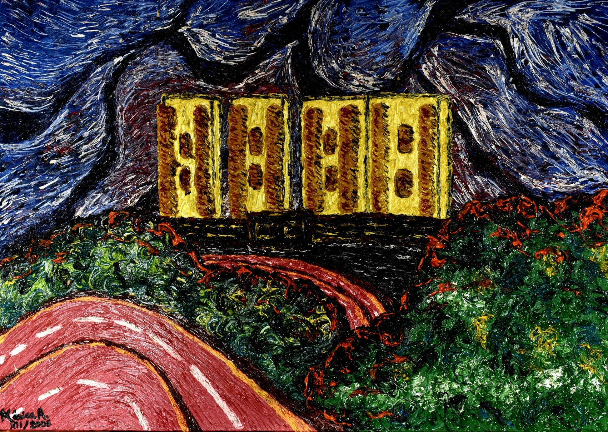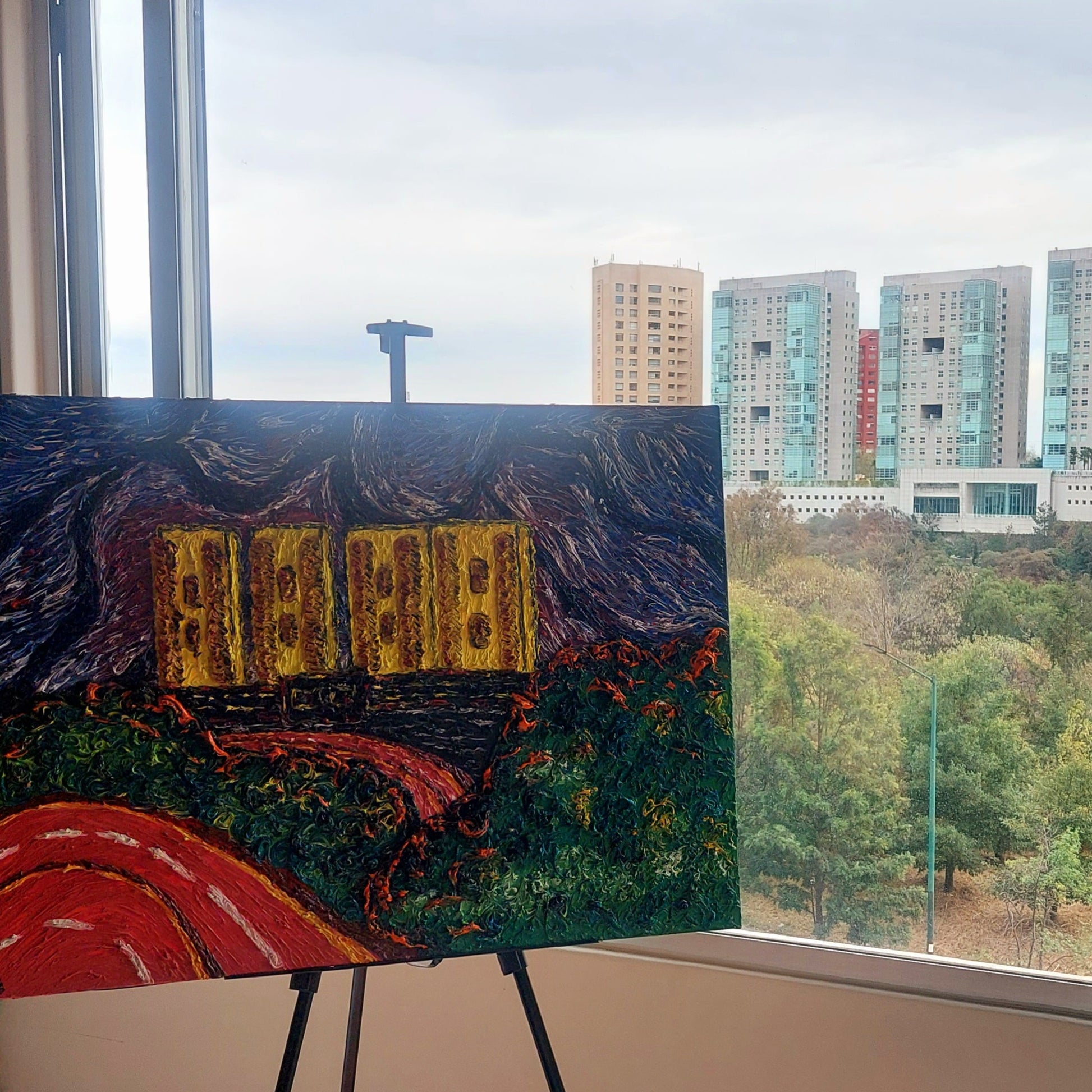 Este cuadro representa la vista desde la sala de mi departamento. Me gustan mucho las líneas de la calle, el contraste de la naturaleza y los edificios. Me proporciona paz y tranquilidad.