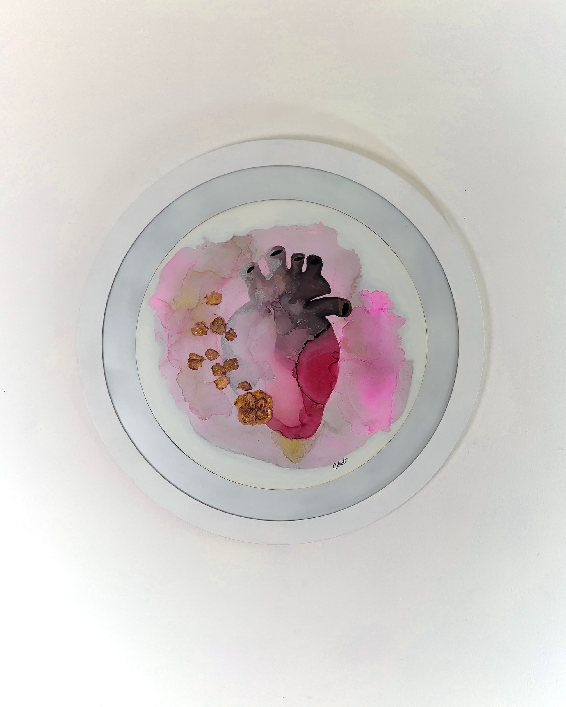 Tintas al alcohol y acrílico, intervenidos con pétalos de rosas