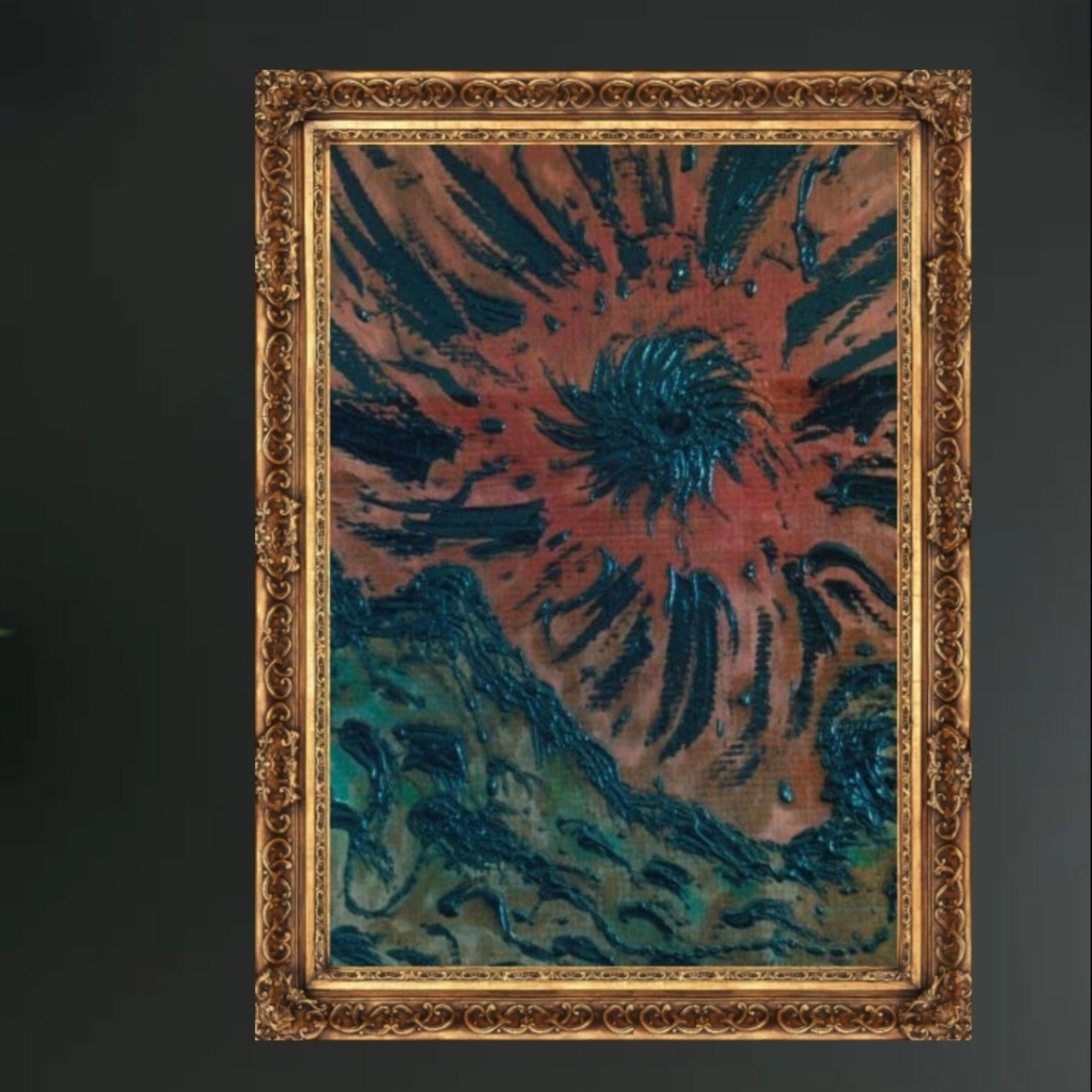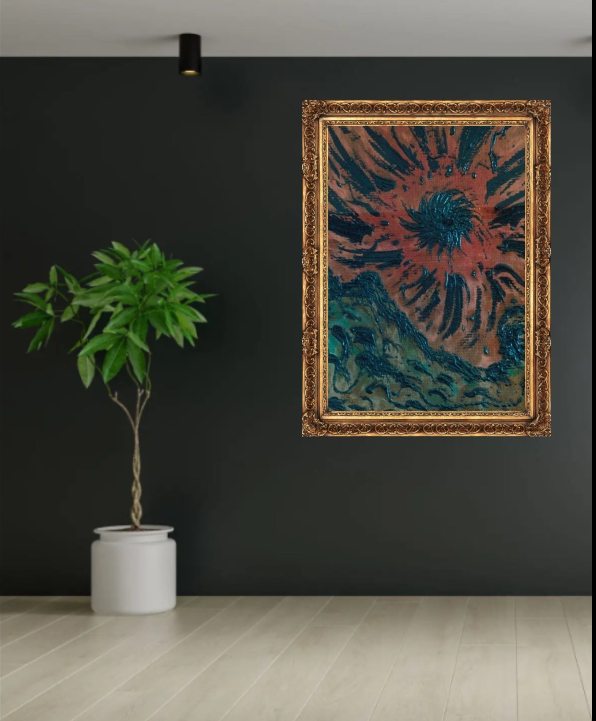 Esta pintura la hice experimentando con chapopote y acuarela mientras estudiaba artes plásticas en el colegio. Lo que más recuerdo fue mi casa llena de humo y jamás volví a pintar con chapopote. Lo que quise plasmar en ella, es cómo el mar se lleva todo.