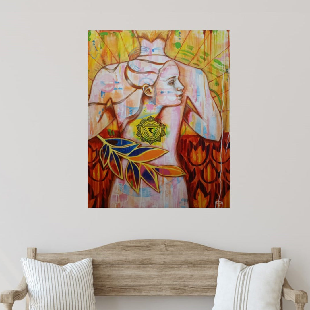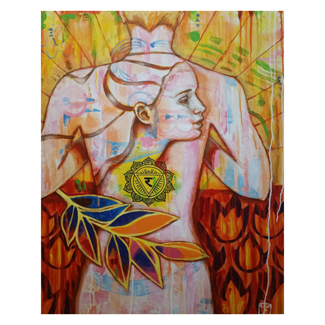 La pintura representa transformación y renacimiento personal. Una mujer meditando, centrada en su plexo solar que irradia luz amarilla intensa, simboliza introspección y poder interno. El contraste entre colores alrededor de la mujer meditando, acompañando por una mujer joven que se encuentra en su interior, refuerza la transición de lo introspectivo hacia lo renovado. Es una obra sobre evolución espiritual y el despertar de un nuevo yo.